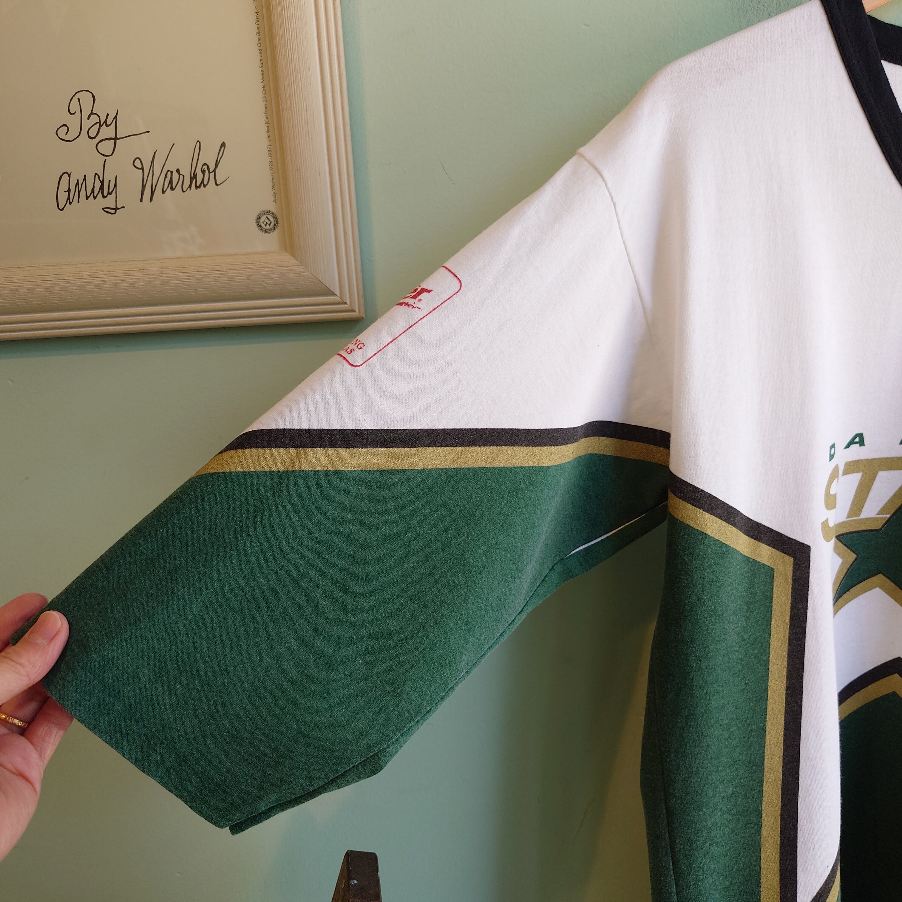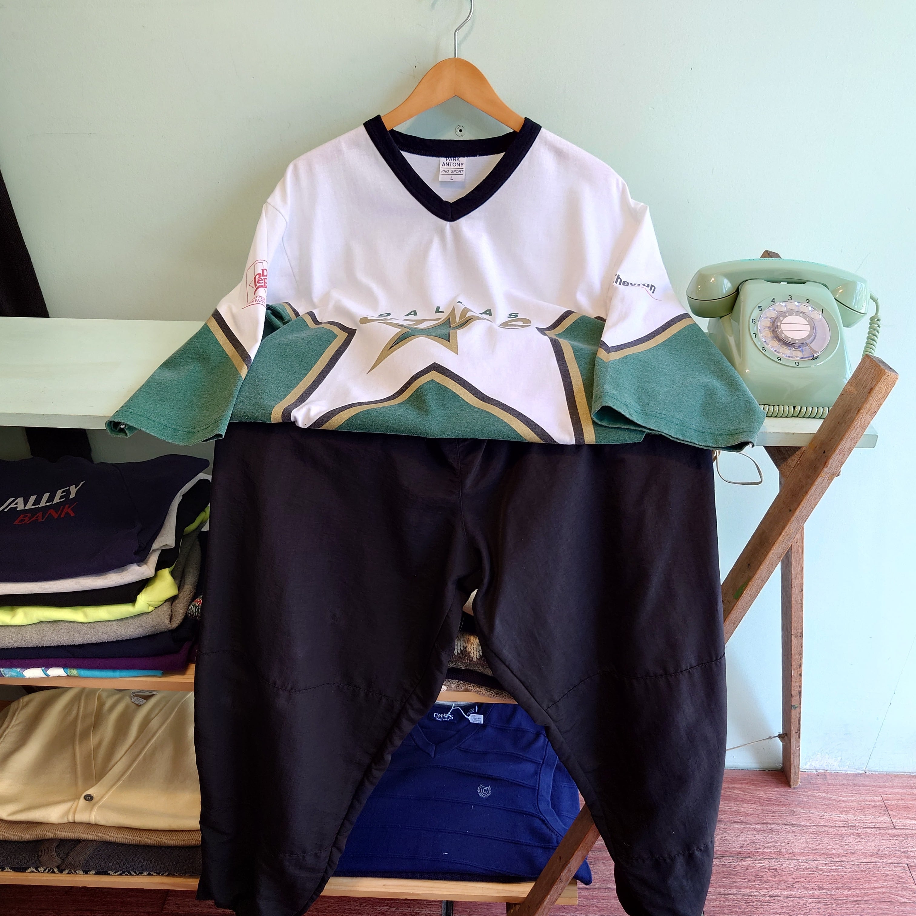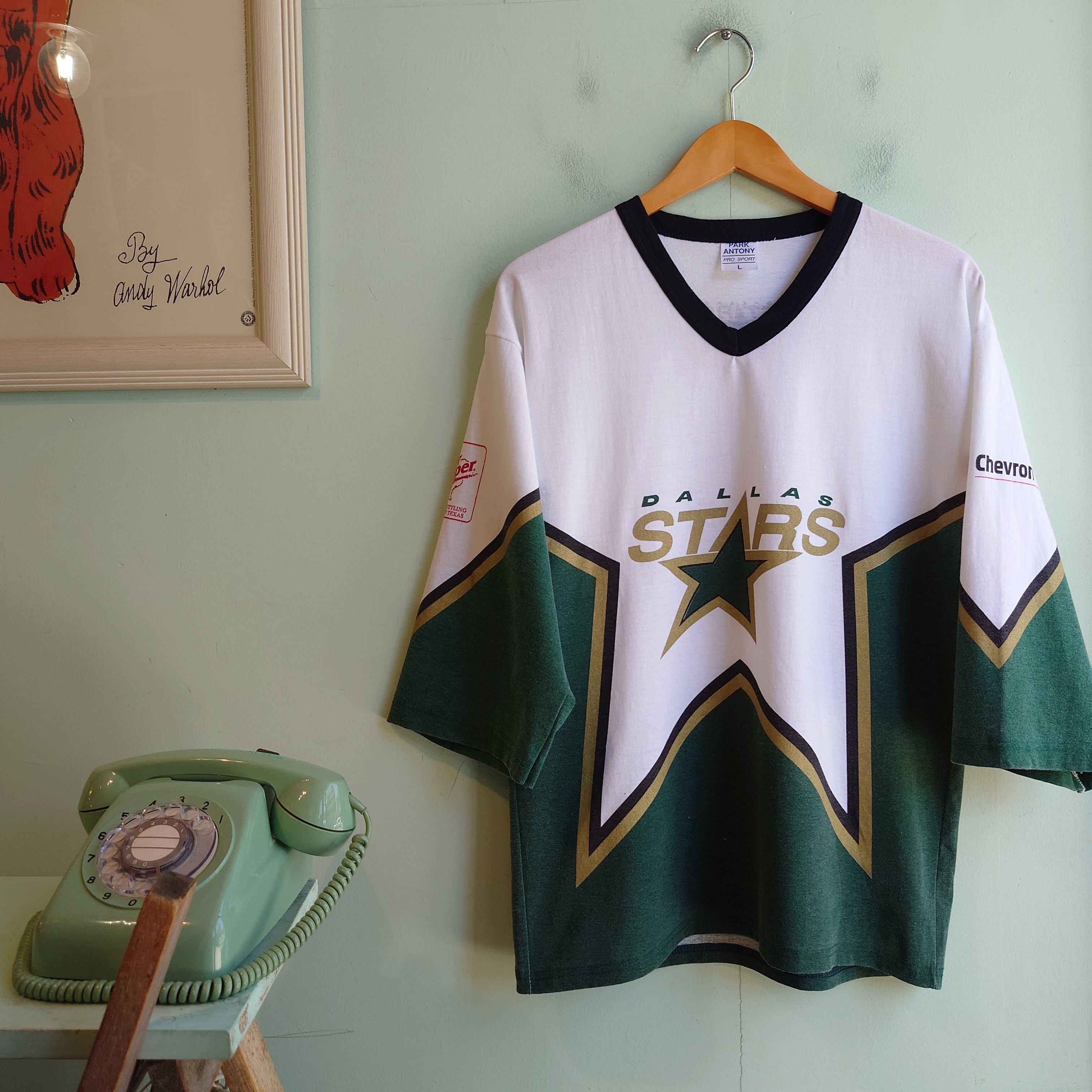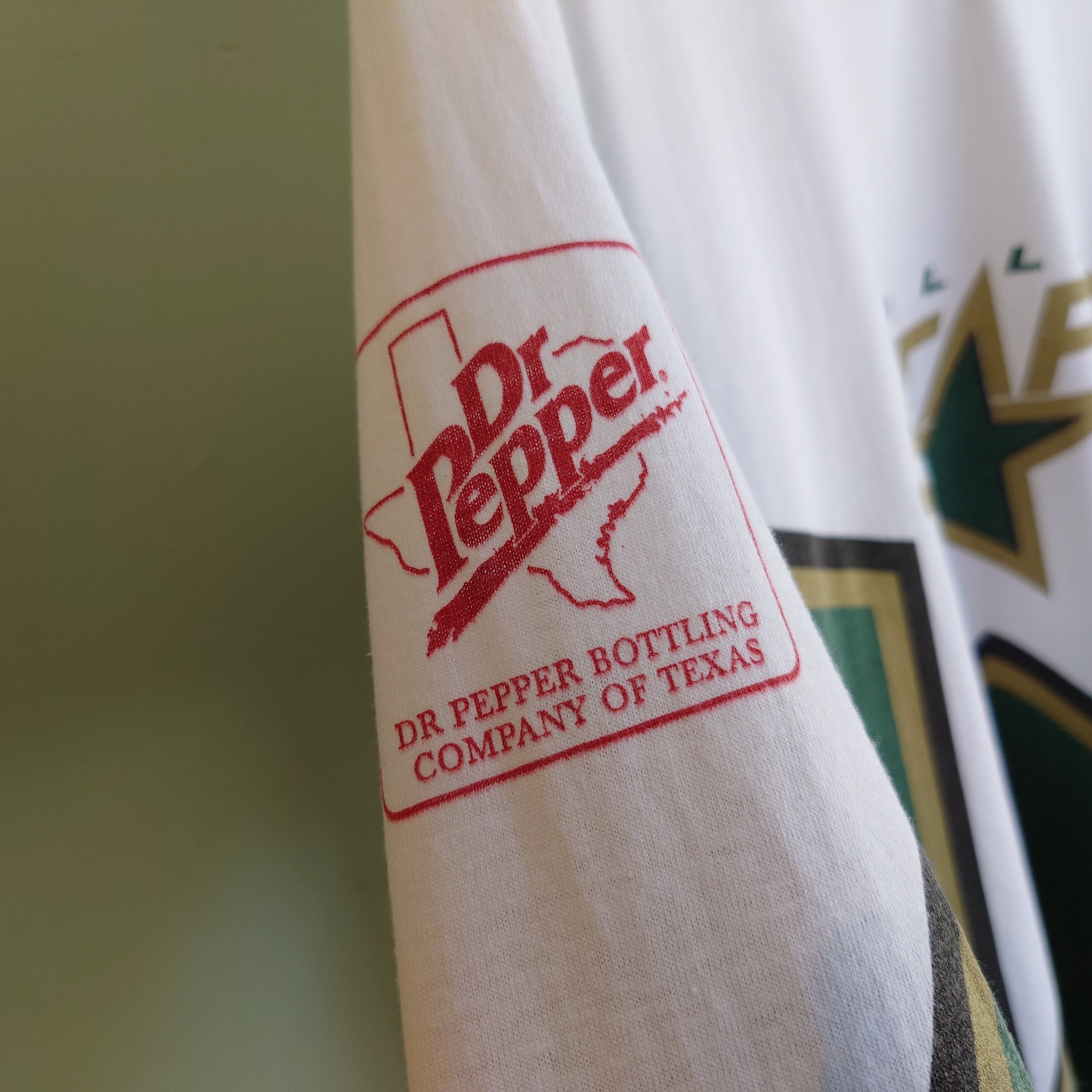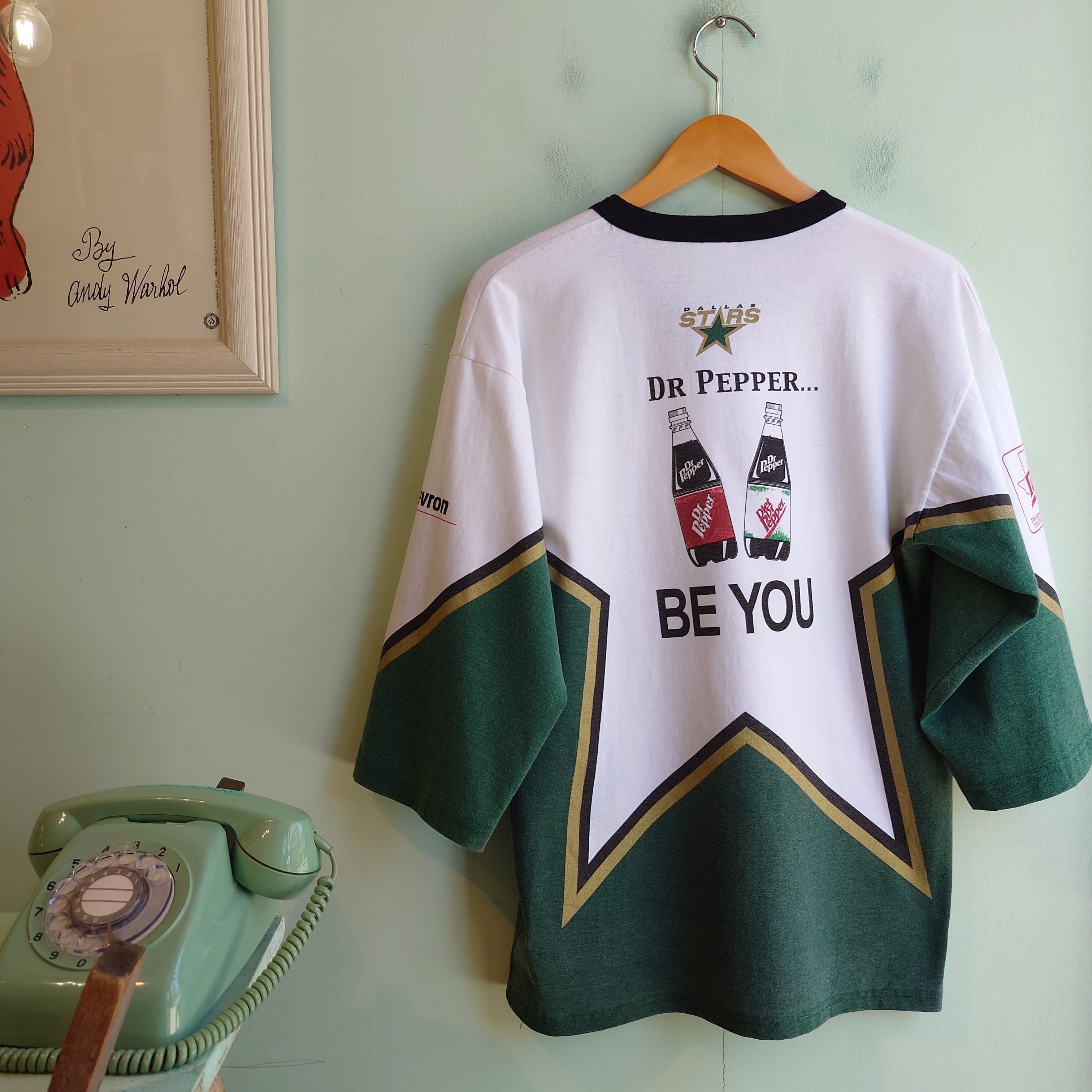 NHLの人気チーム、ダラス・スターズのヴィンテージホッケーTシャツ。米エネルギー企業、シェブロンとドクターペッパーのプリントがかわいい。特にバックプリントは他では出会えない可愛さ。Vネックのリンガーや独特なマルチカラーなど、当時のスポーツウェア独特なデザインも最高。可愛さもちろん、企業系のかっこよさ、歴史的価値も併せ持った一枚です。