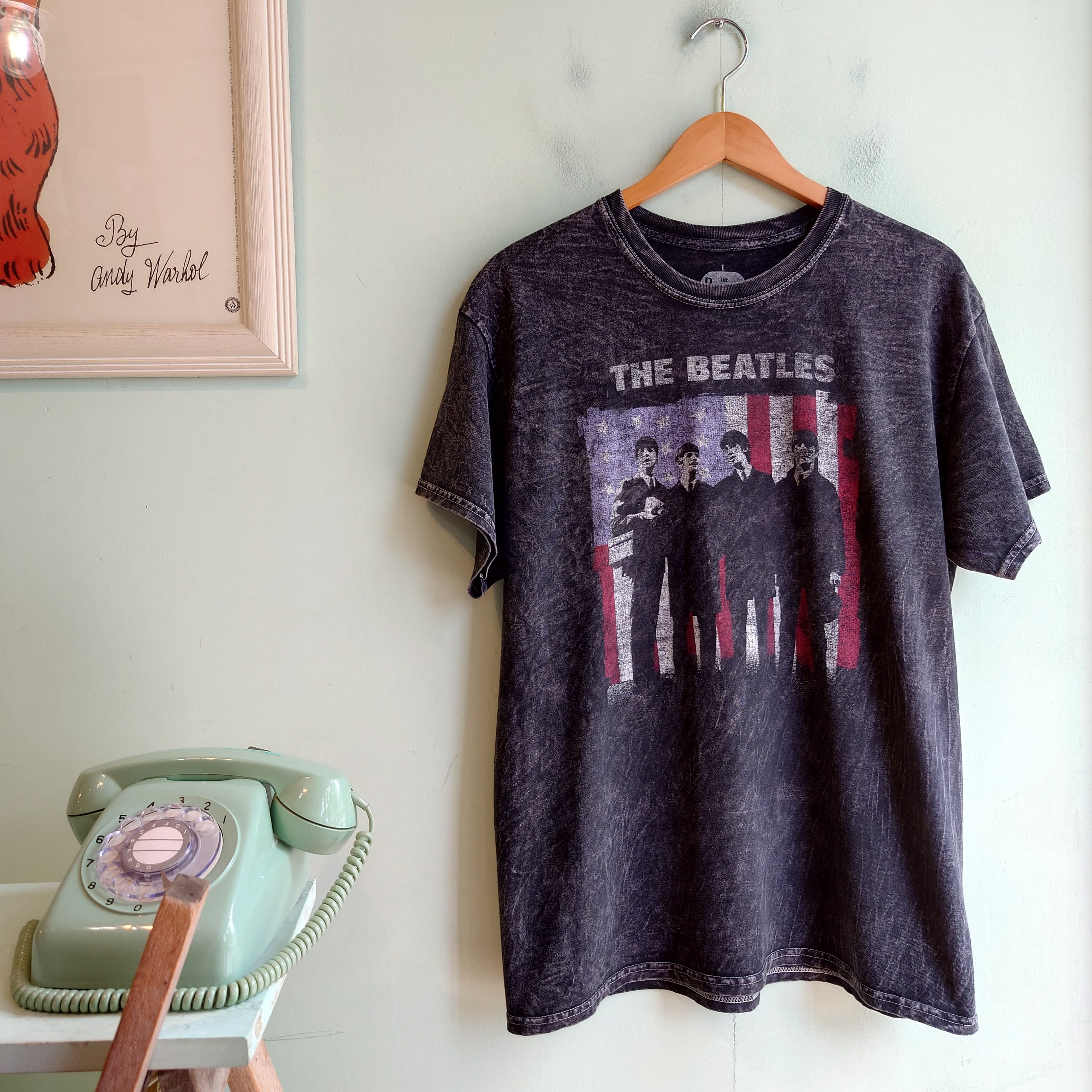 ザ・ビートルズのオフィシャルTシャツ。1964年の初来米モチーフのアートワークが、カスレ感でぼやけた風合いに。ロックTシャツらしい激し目のブリーチ加工もかっこいい。