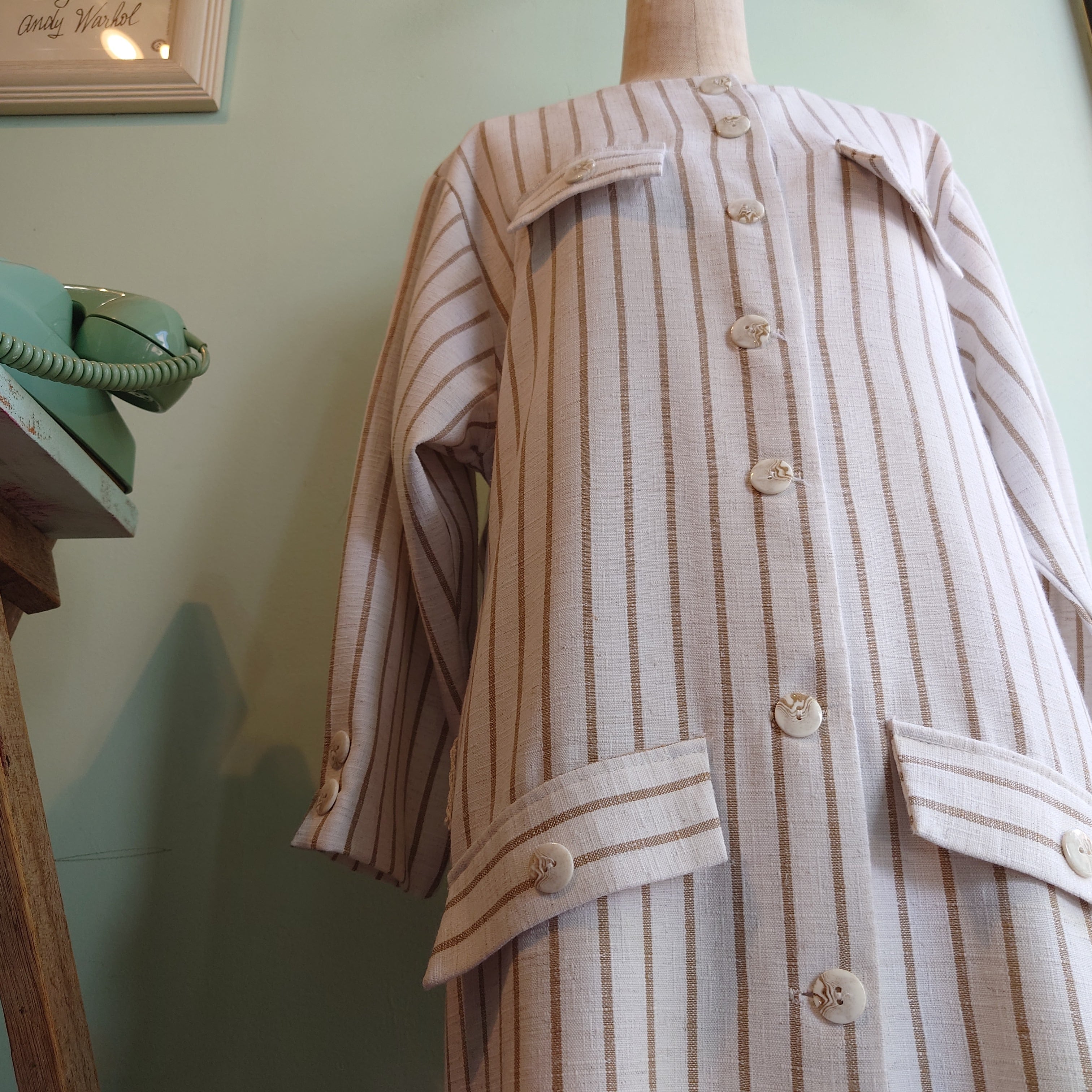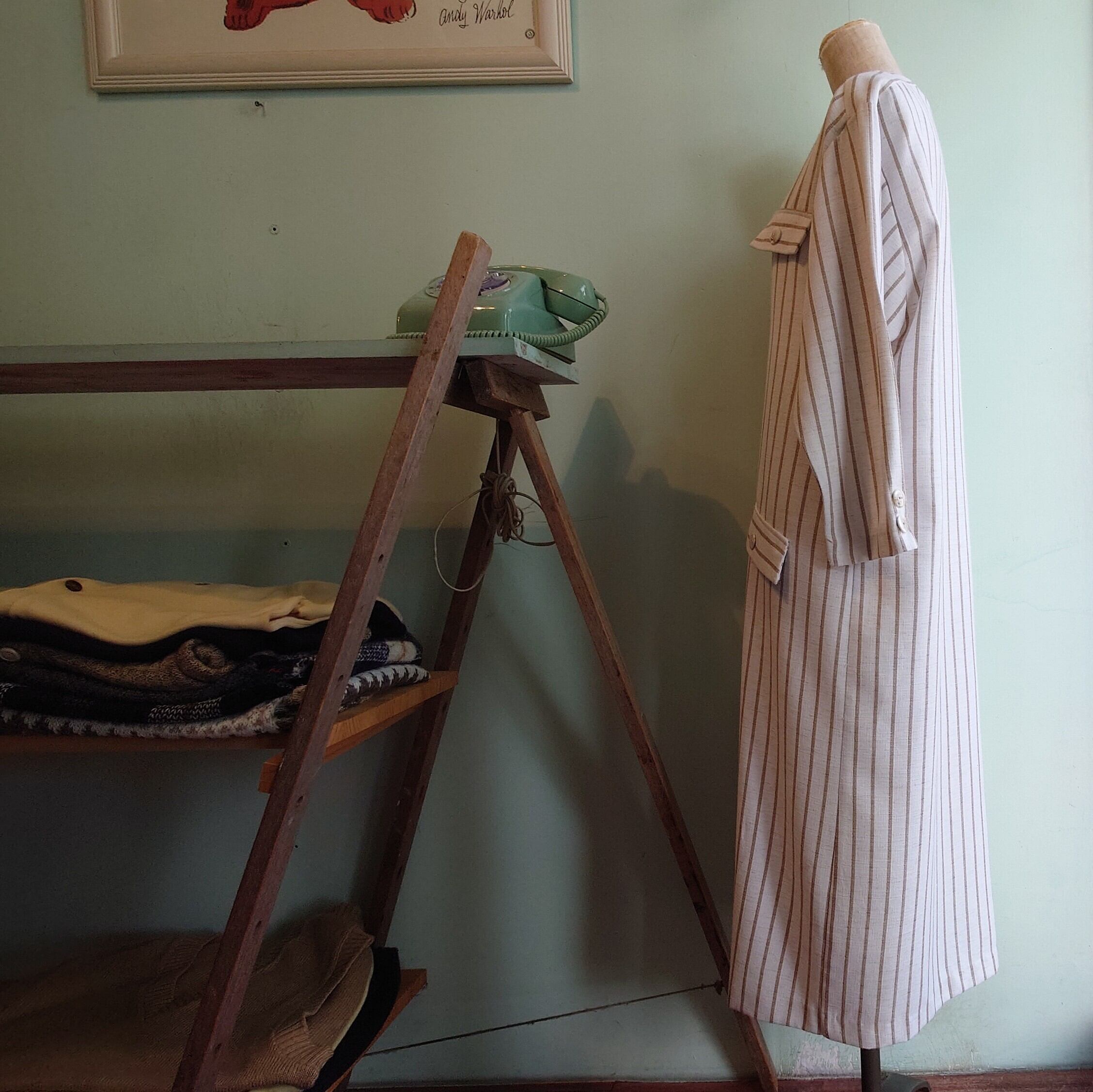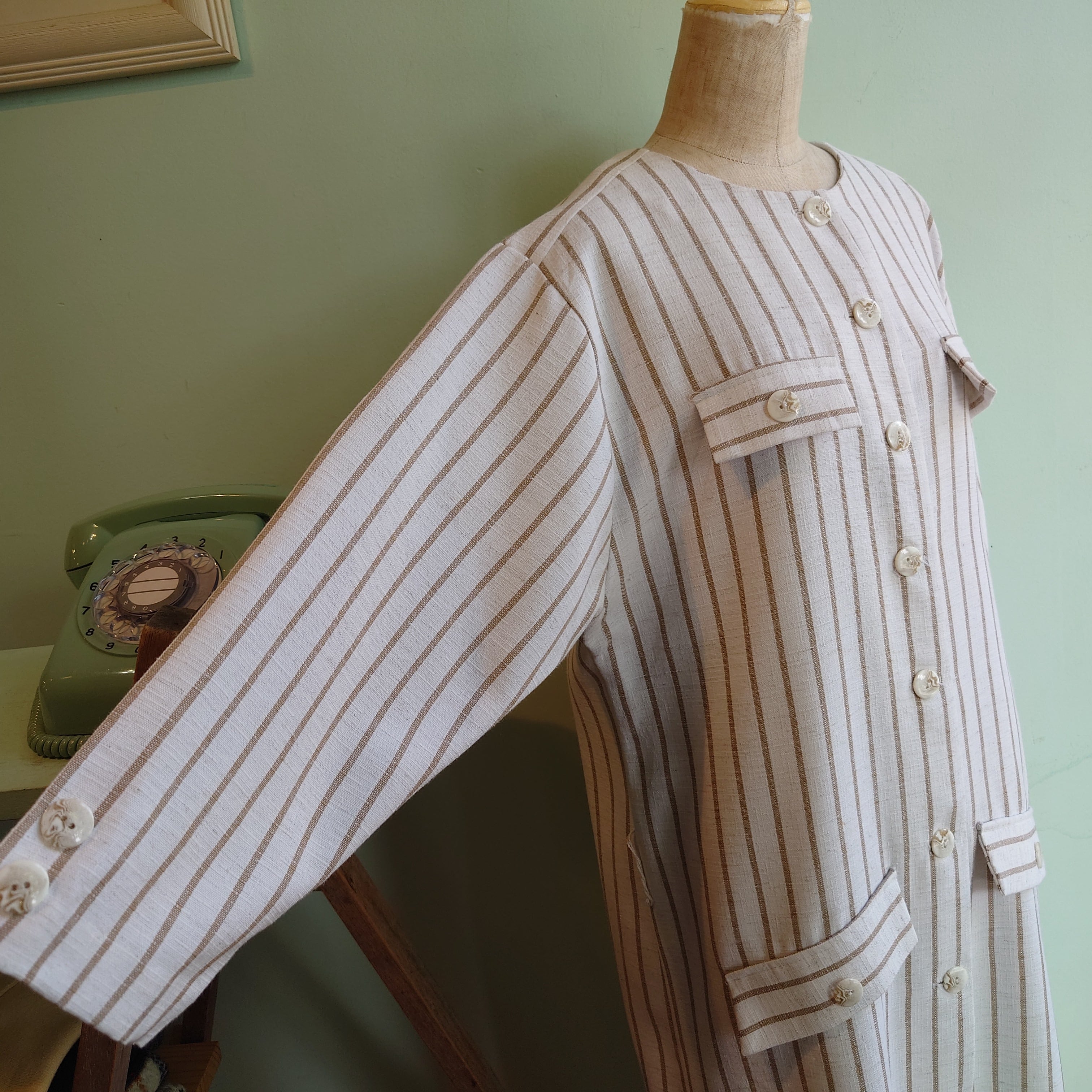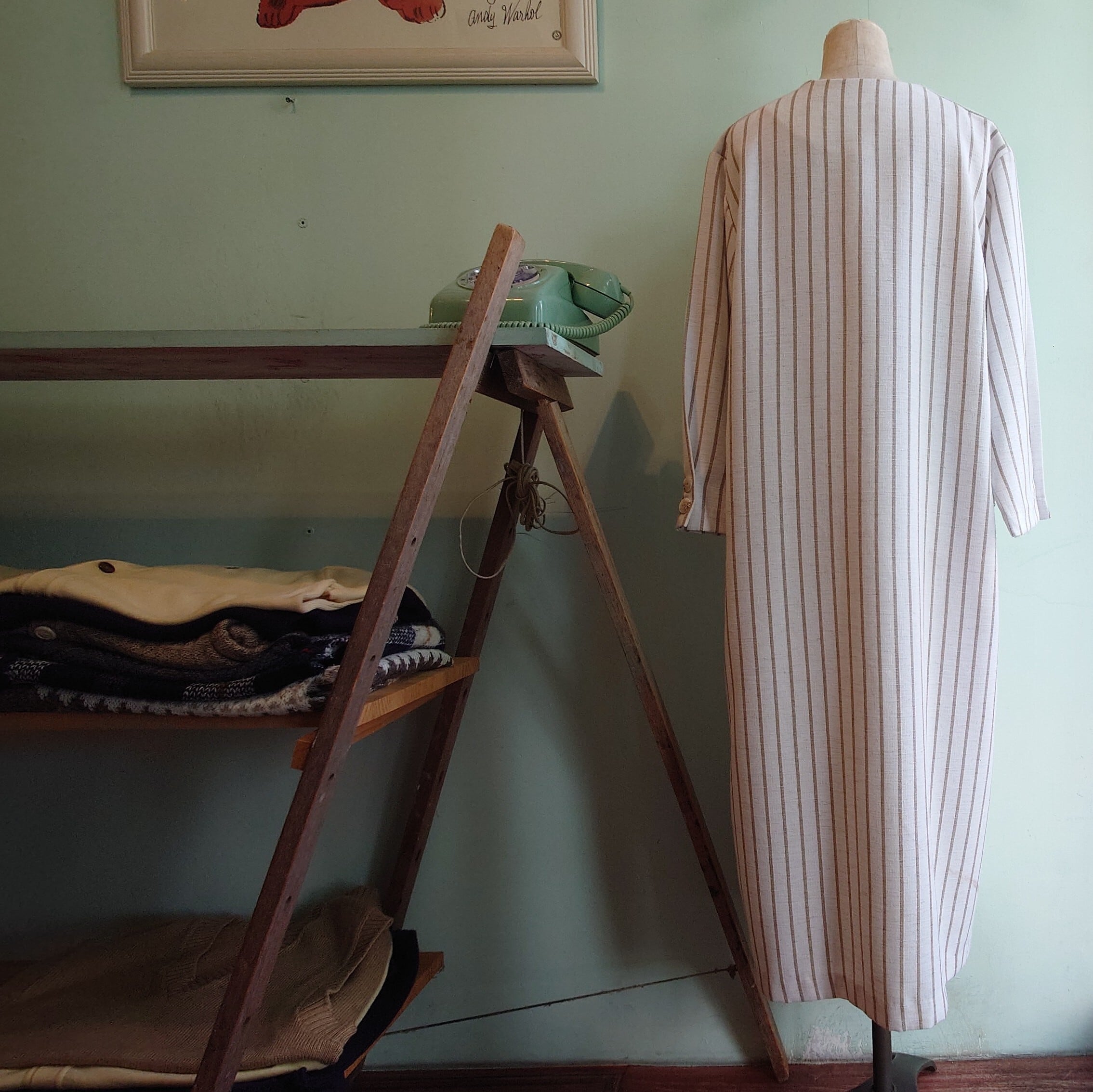 丸襟とストライプがユニセックスなテイスト、ベージュとリネンライク素材がナチュラルなヴィンテージドレス。ストンとしたシルエットはレトロで、より古い時代のレトロフューチャーな雰囲気も。花柄や幾何学系とは違う大人っぽさが◎