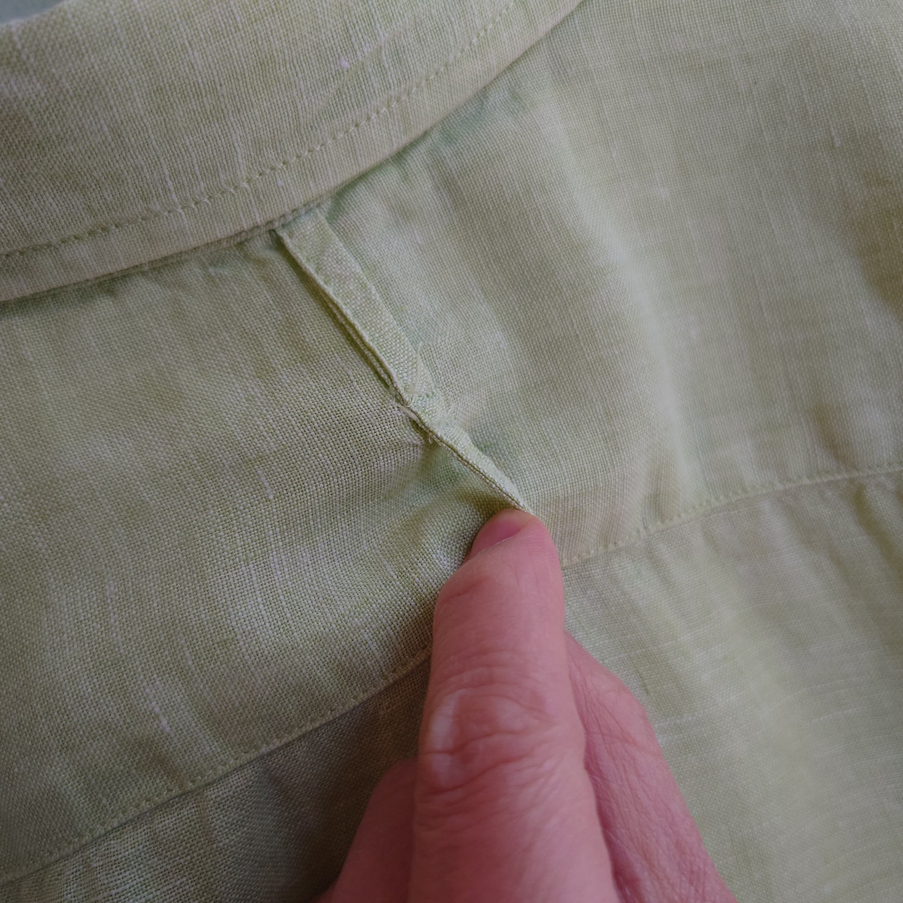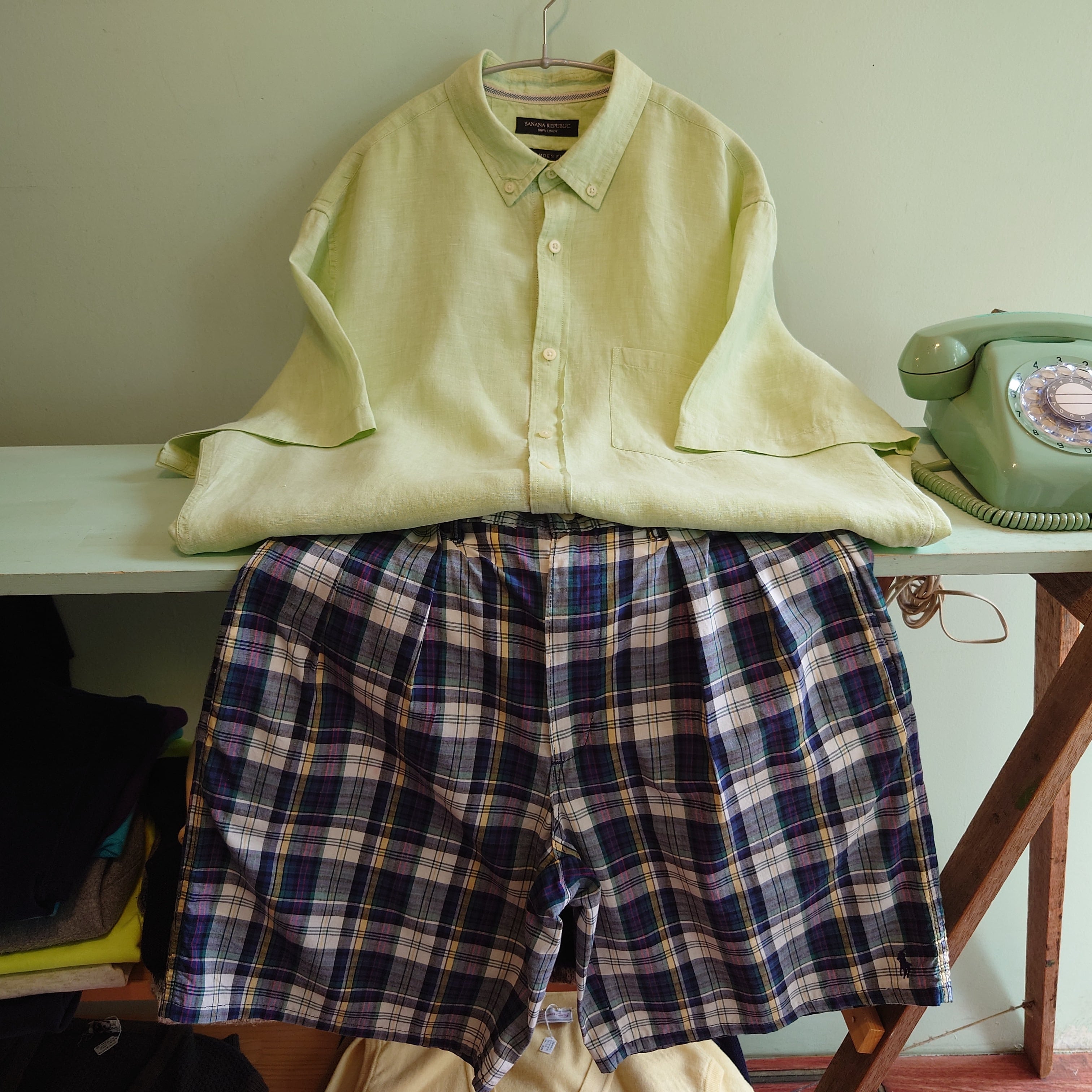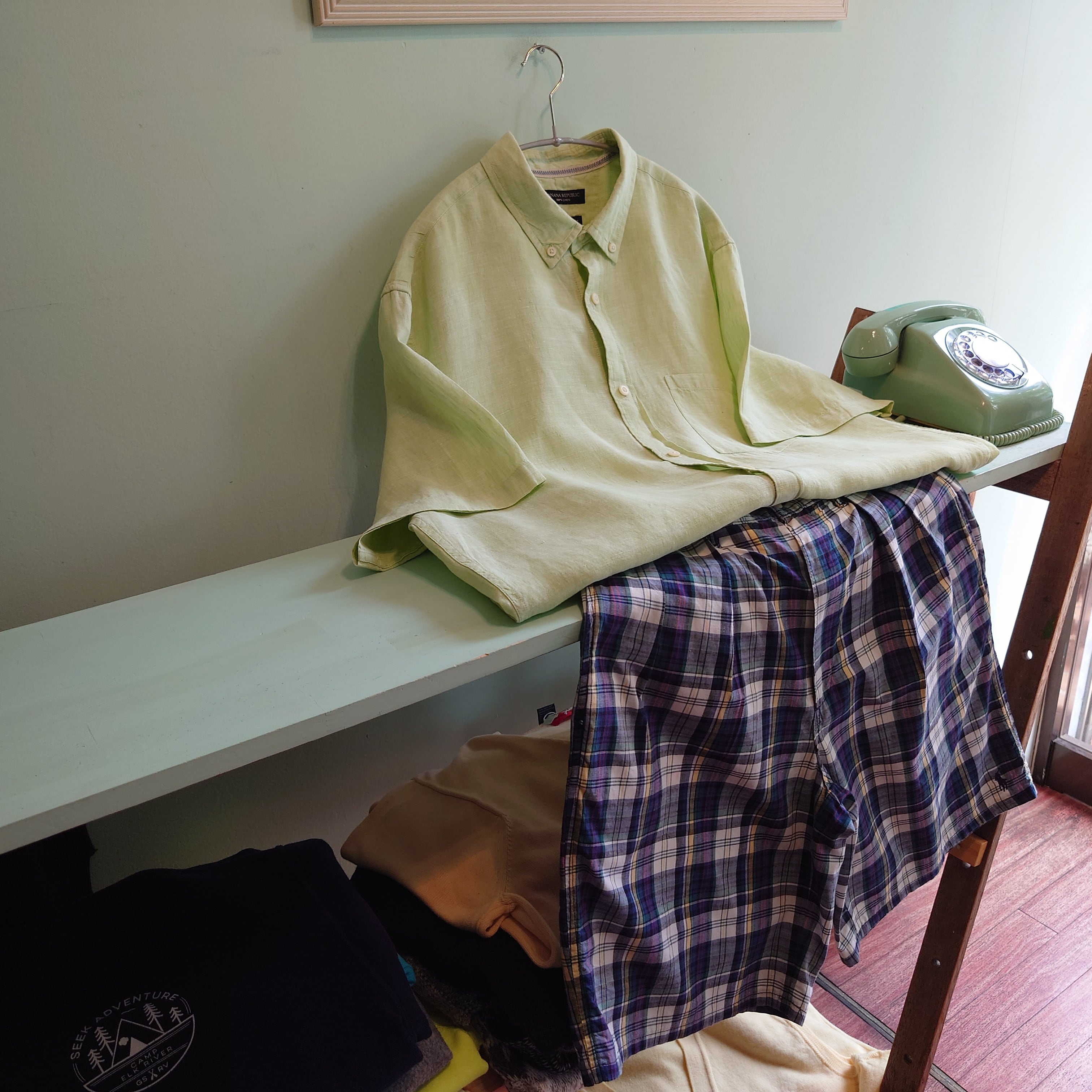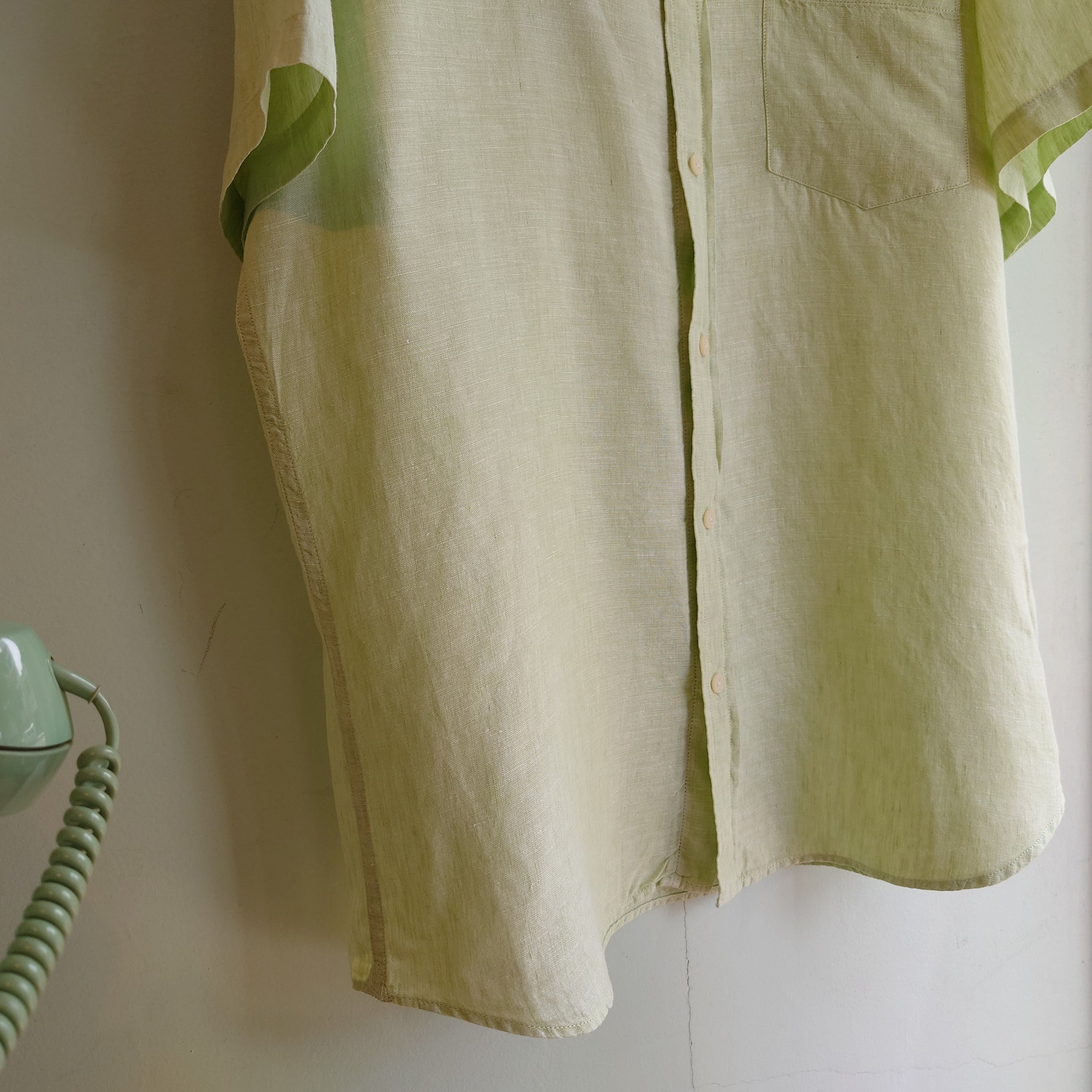 バナナリパブリックのドレスシャツ。緑系ながらナチュラルさ強め名若草色と、リネンのトロっとぷるっとした生地感がマッチした一枚。モダンさありつつ、レトロなフィット感もシーンを選ばない上品さ。