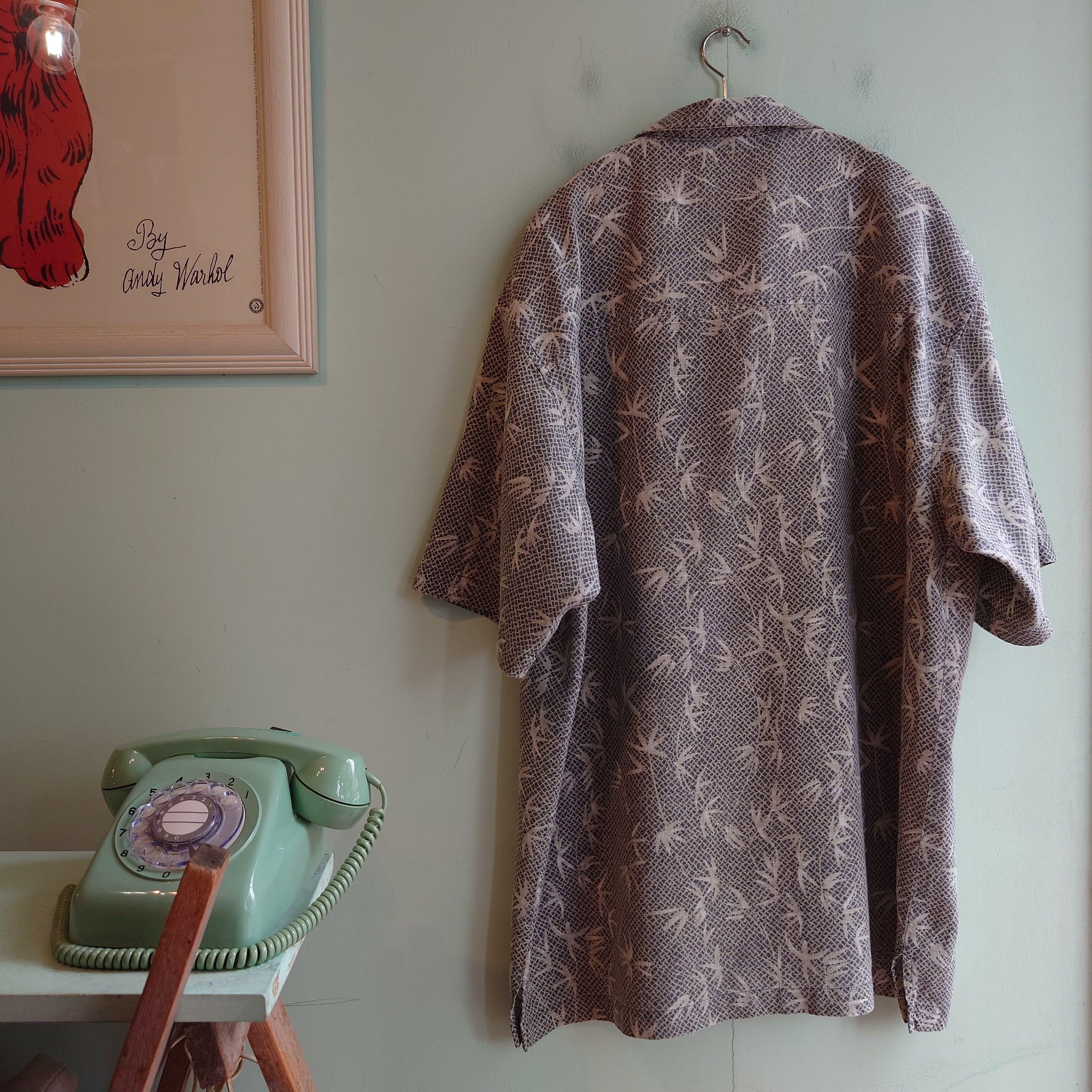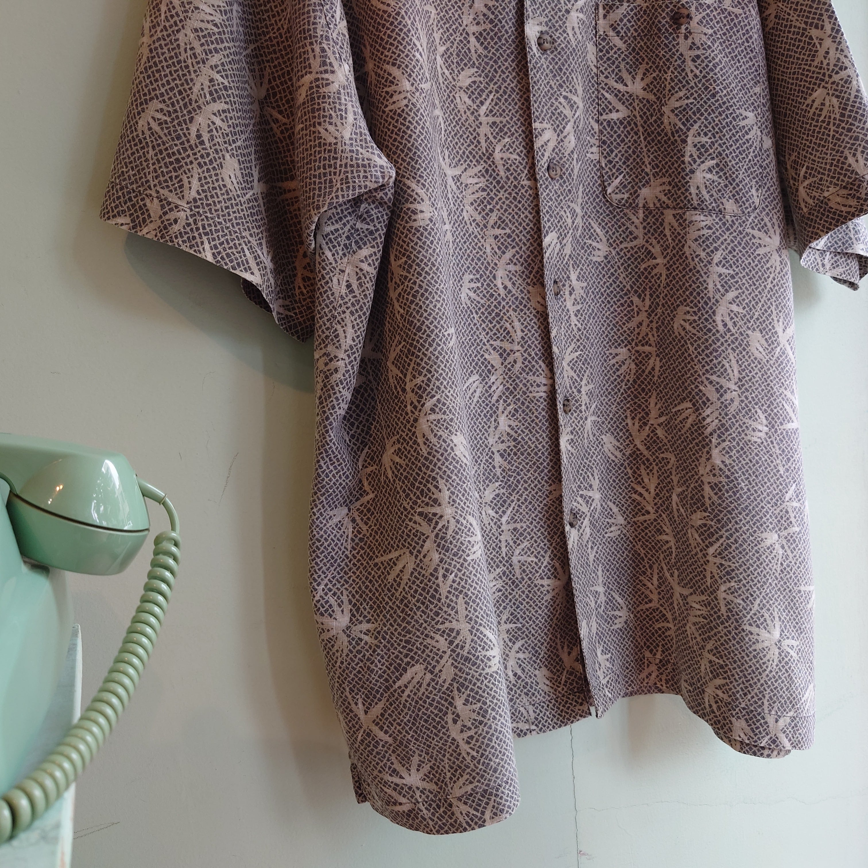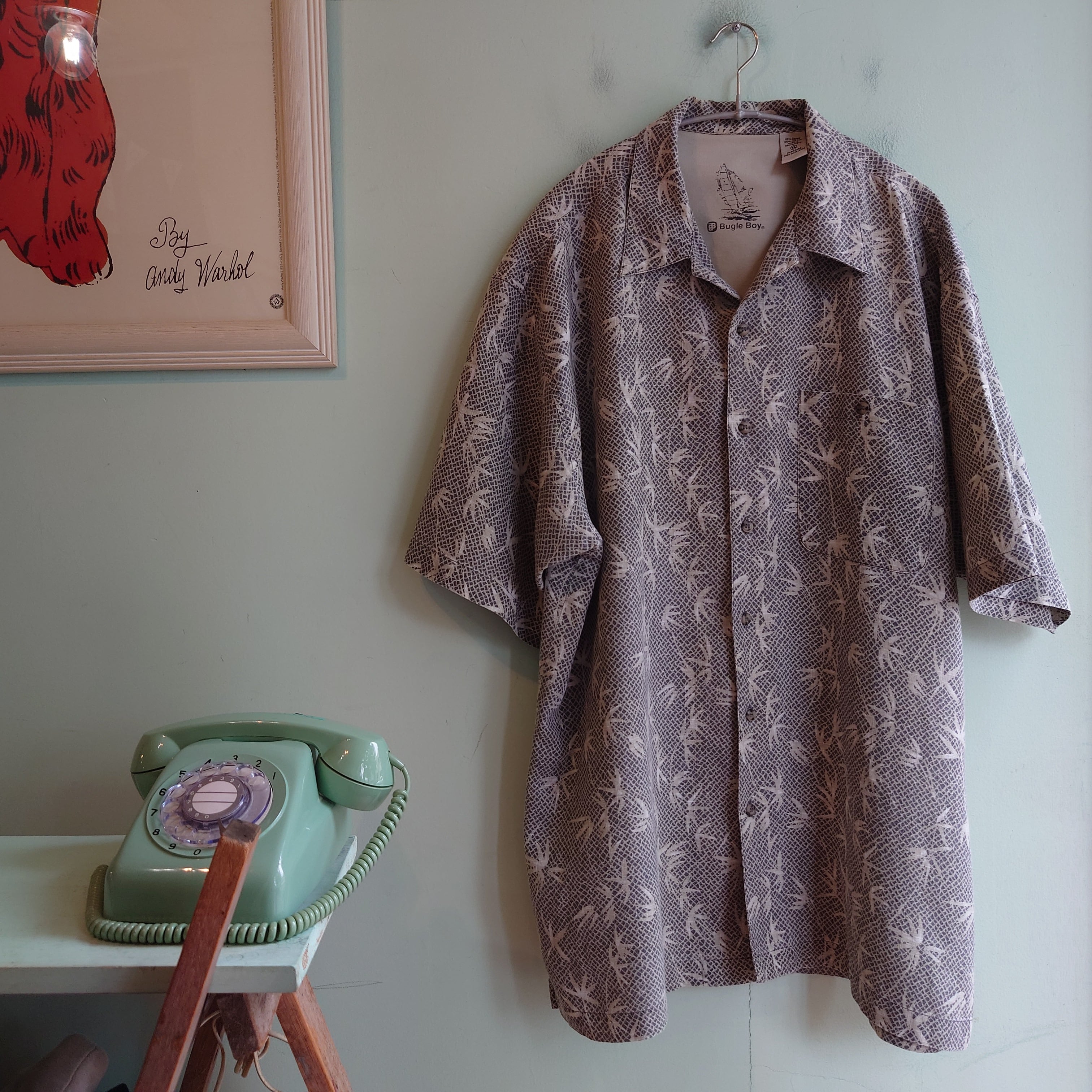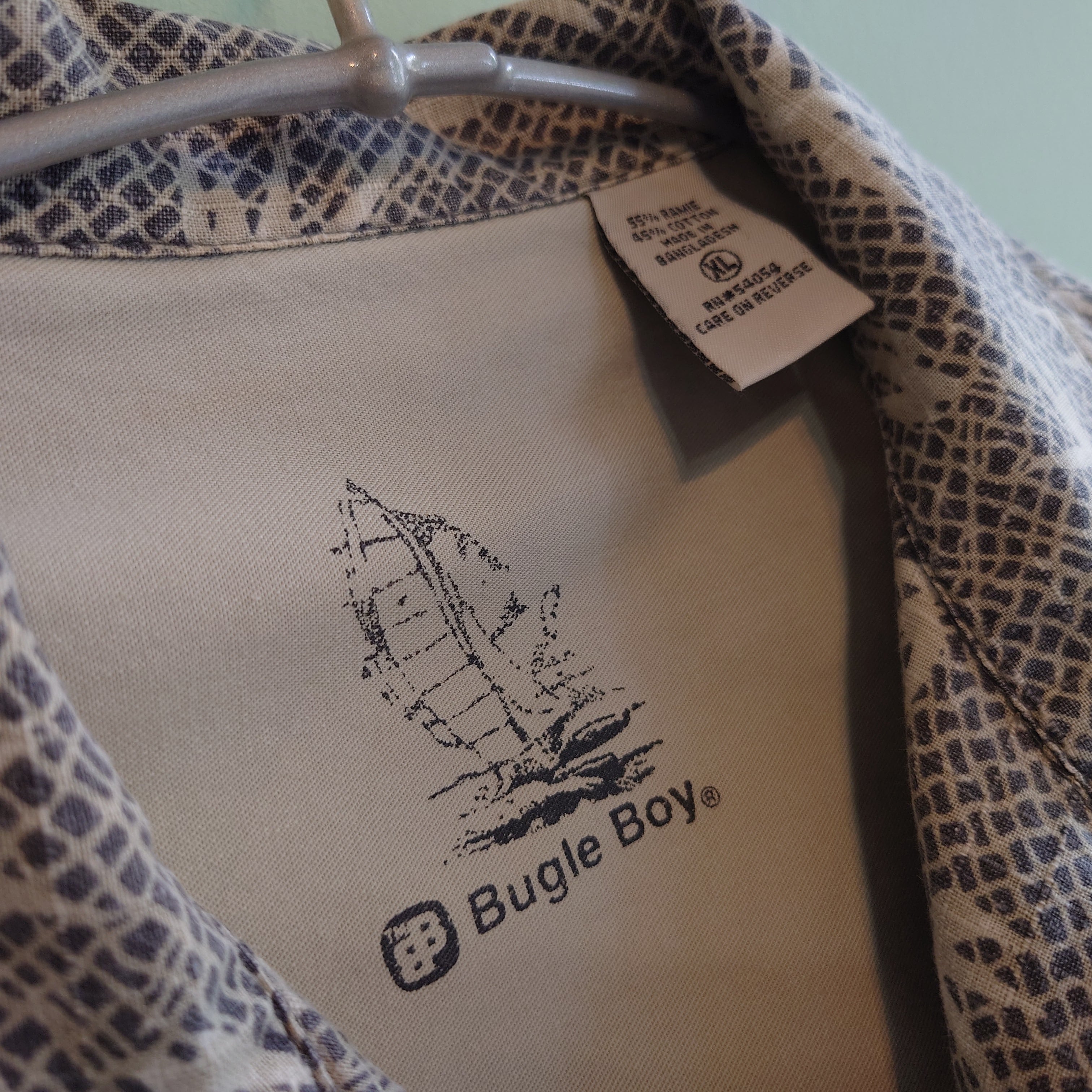 90年代らしい遊び心で人気を博しカジュアルブランド、Bugle Boyの総柄シャツ。リップストップの様な格子の上に、スネークスキンとバンブー柄を合わせた独特な総柄がかっこいい。個性溢れながらもベージュなグレーをベースにしたナチュラルさも魅力的。
