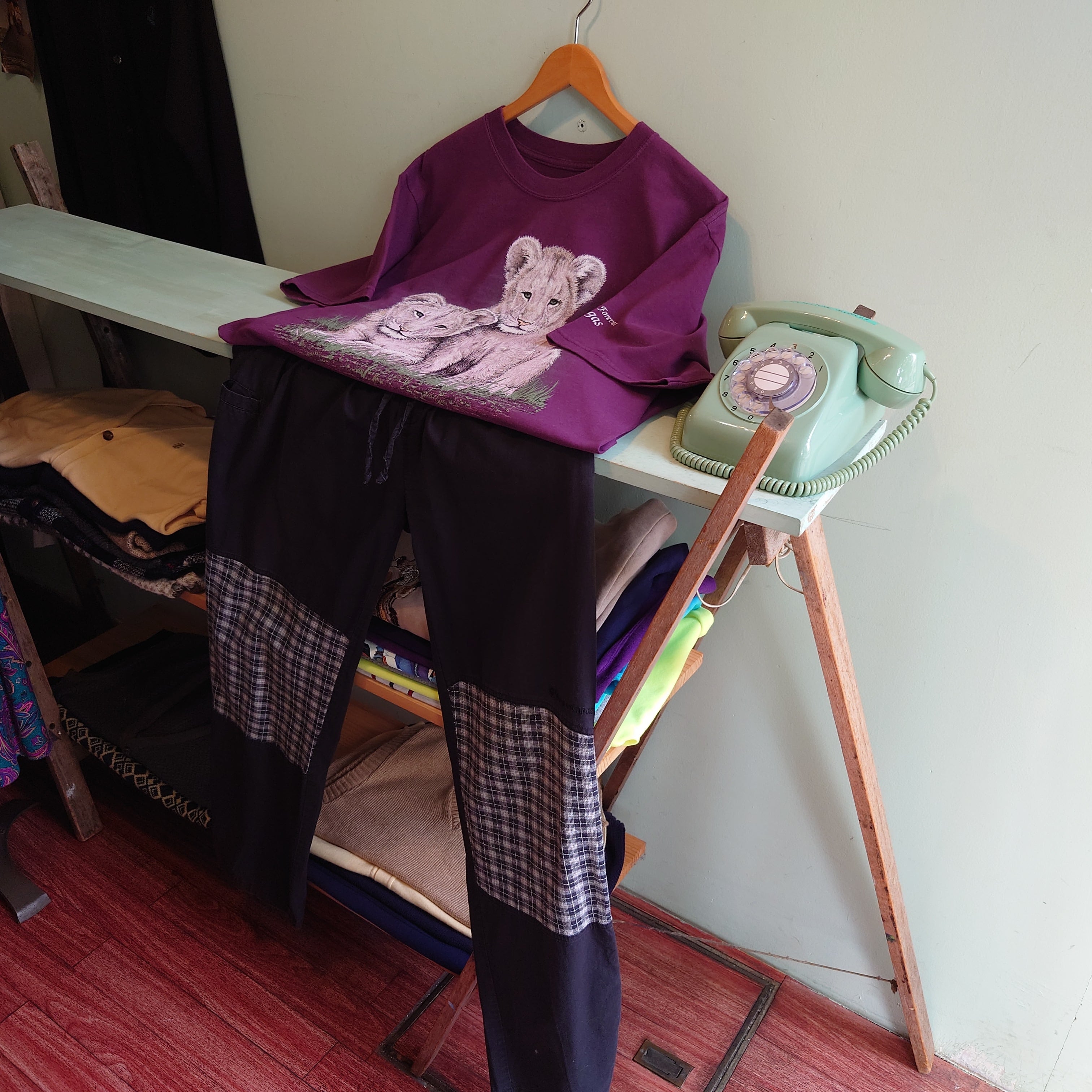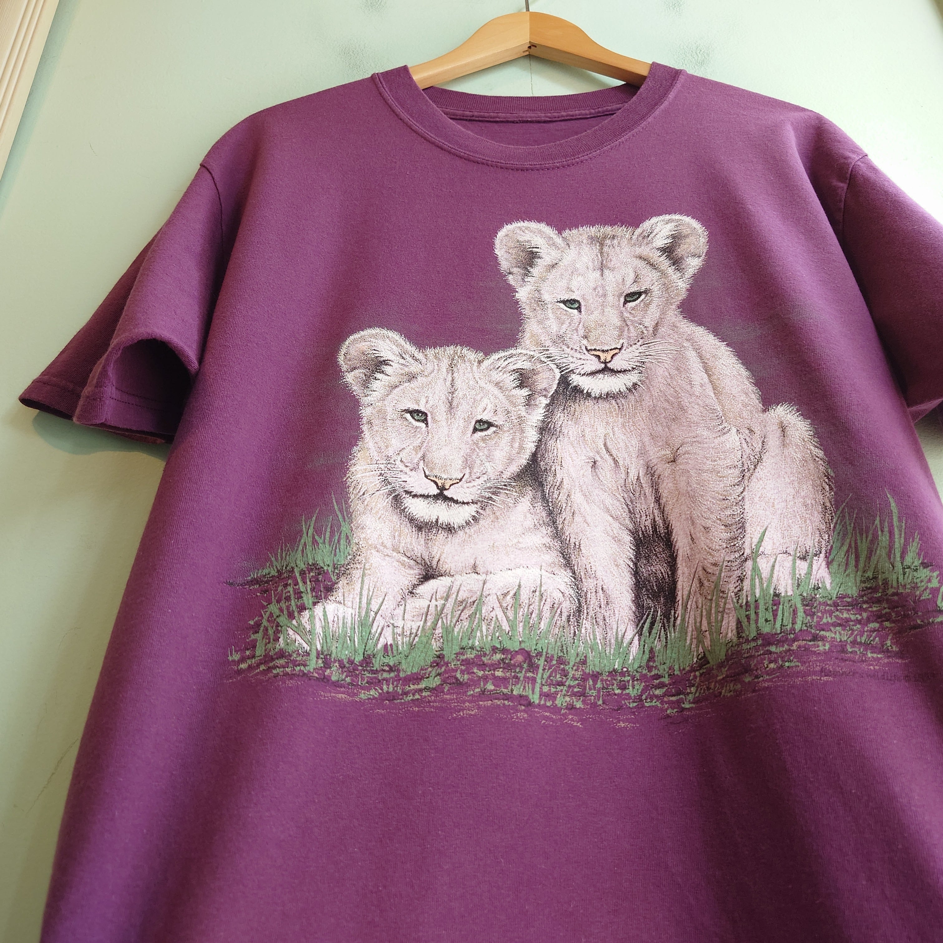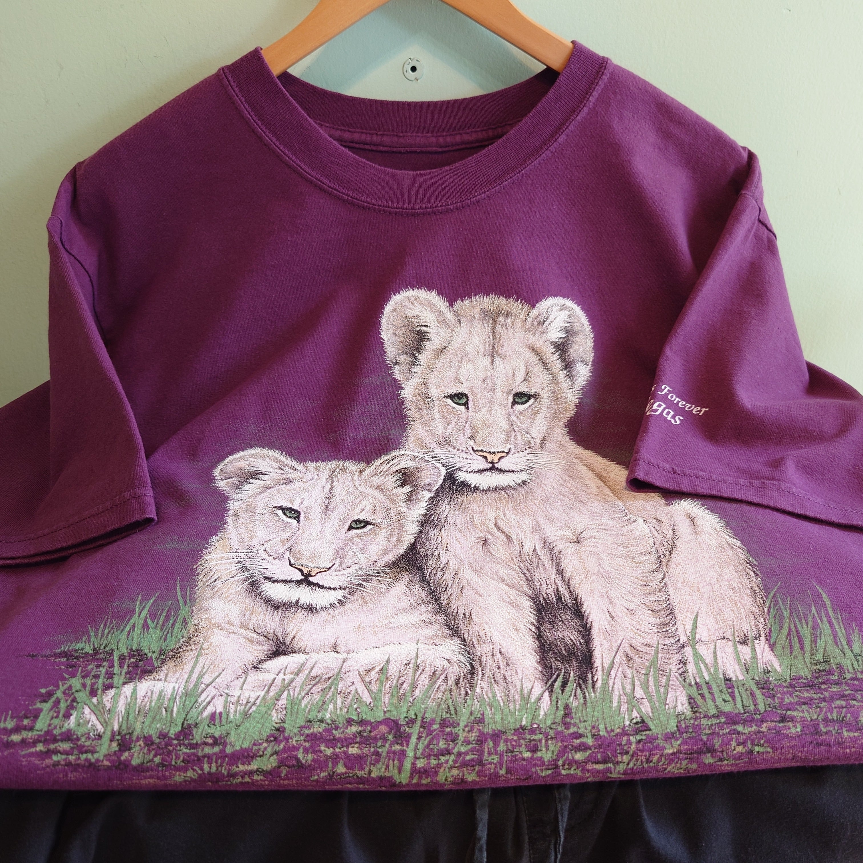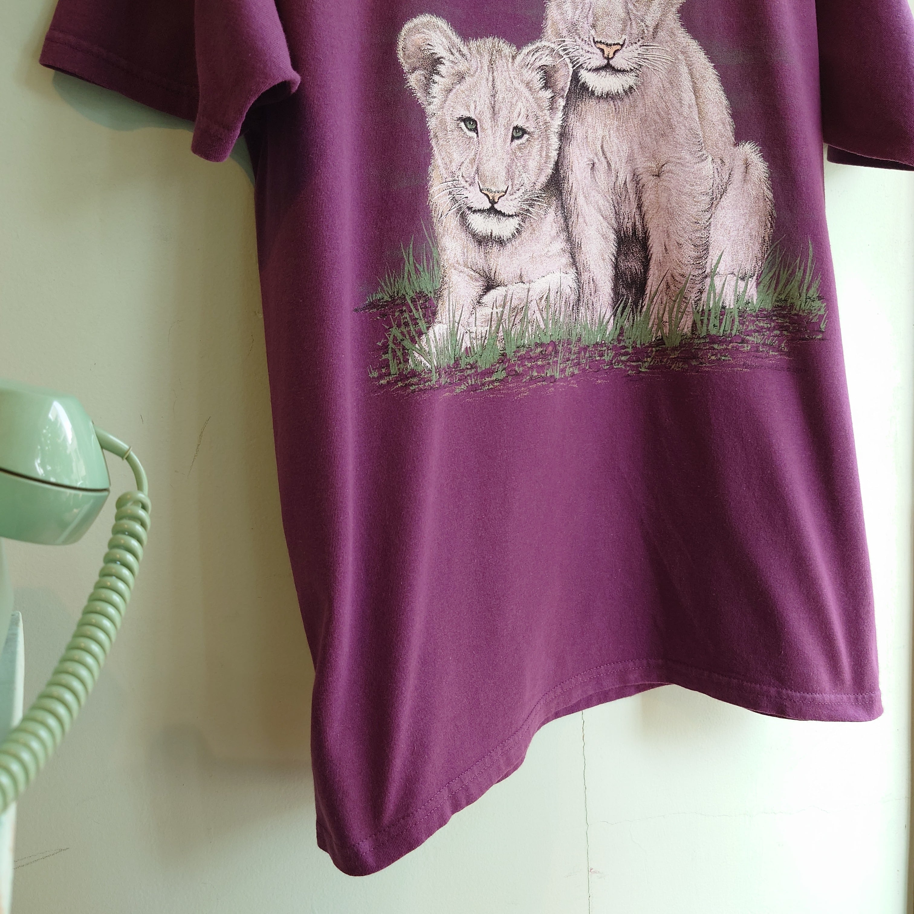 80-90年代の環境保護系ワード、Extinction is Foreverが肩に刻まれた、ネイチャー系のヴィンテージTシャツ。2頭の子ライオンをモチーフにしたハートウォーミングで繊細なアートに注目。バーガンディーとアニマルのギャップも珍しい。