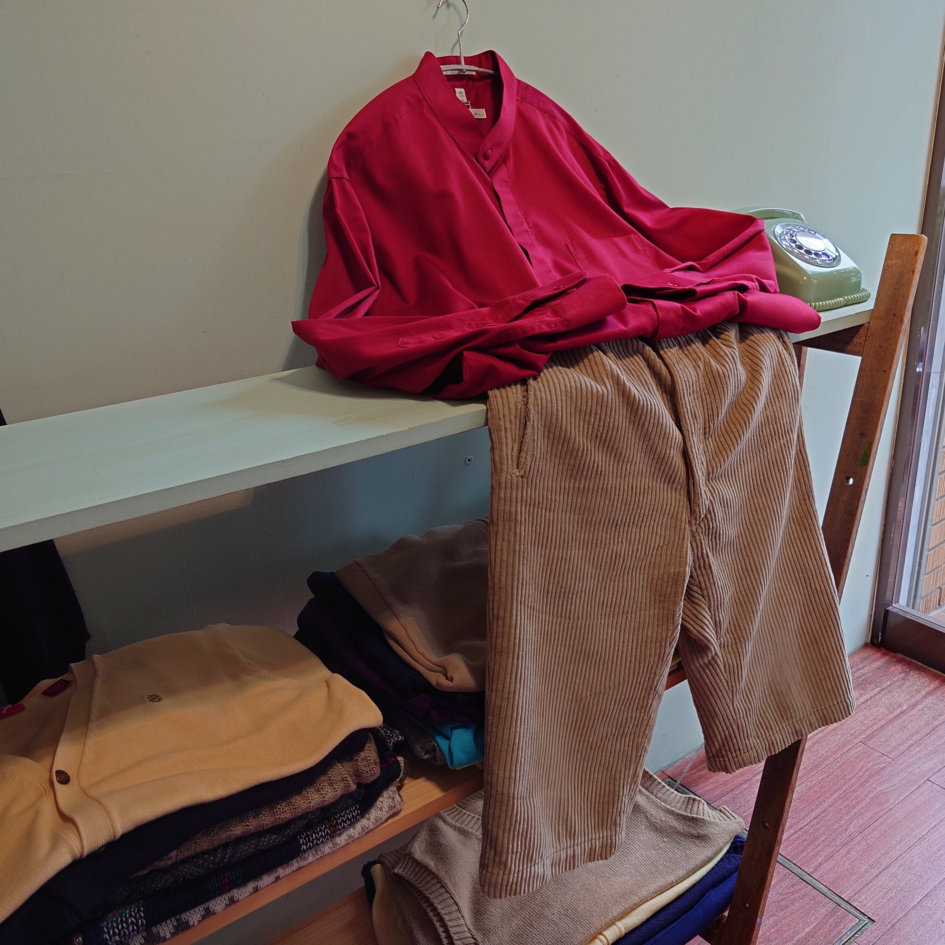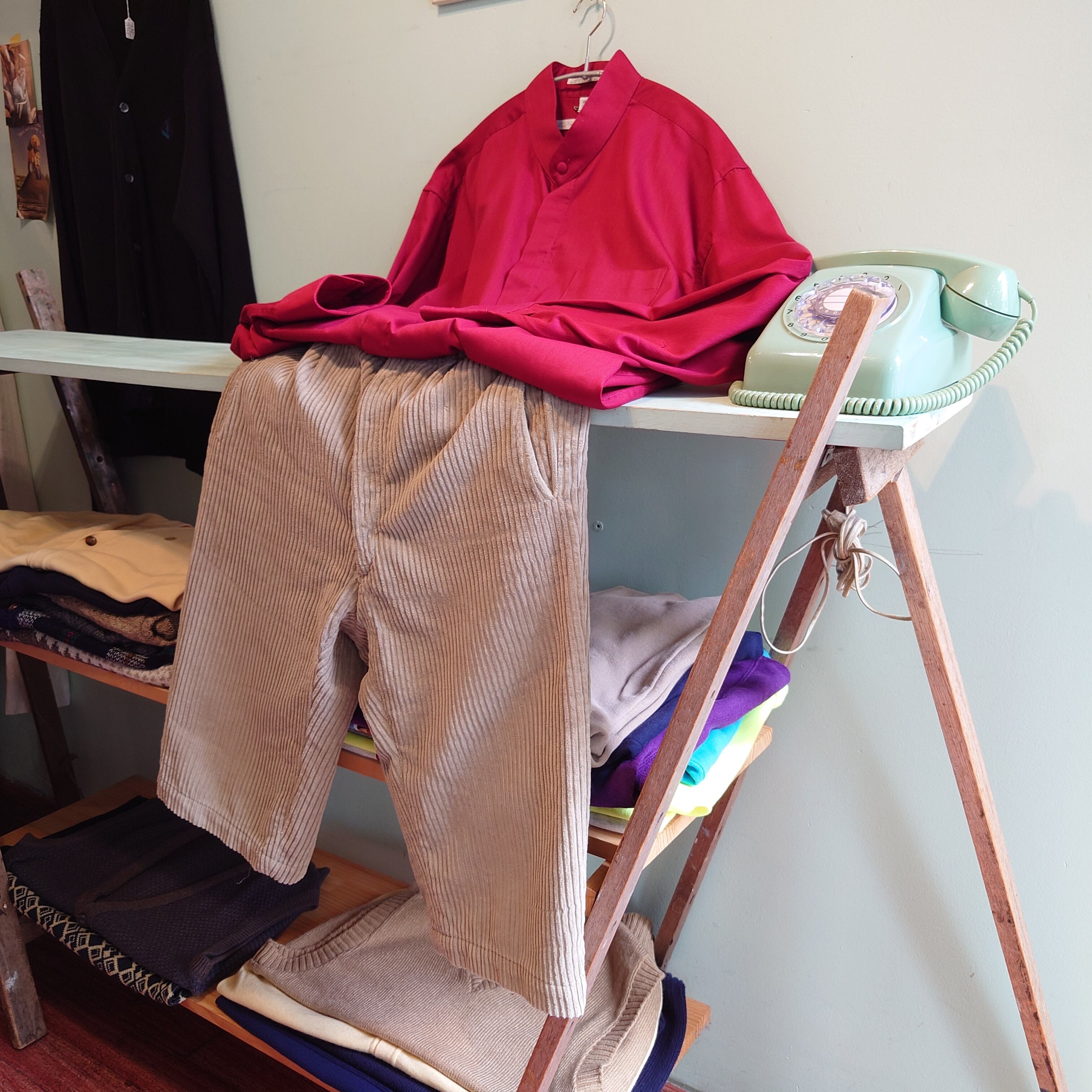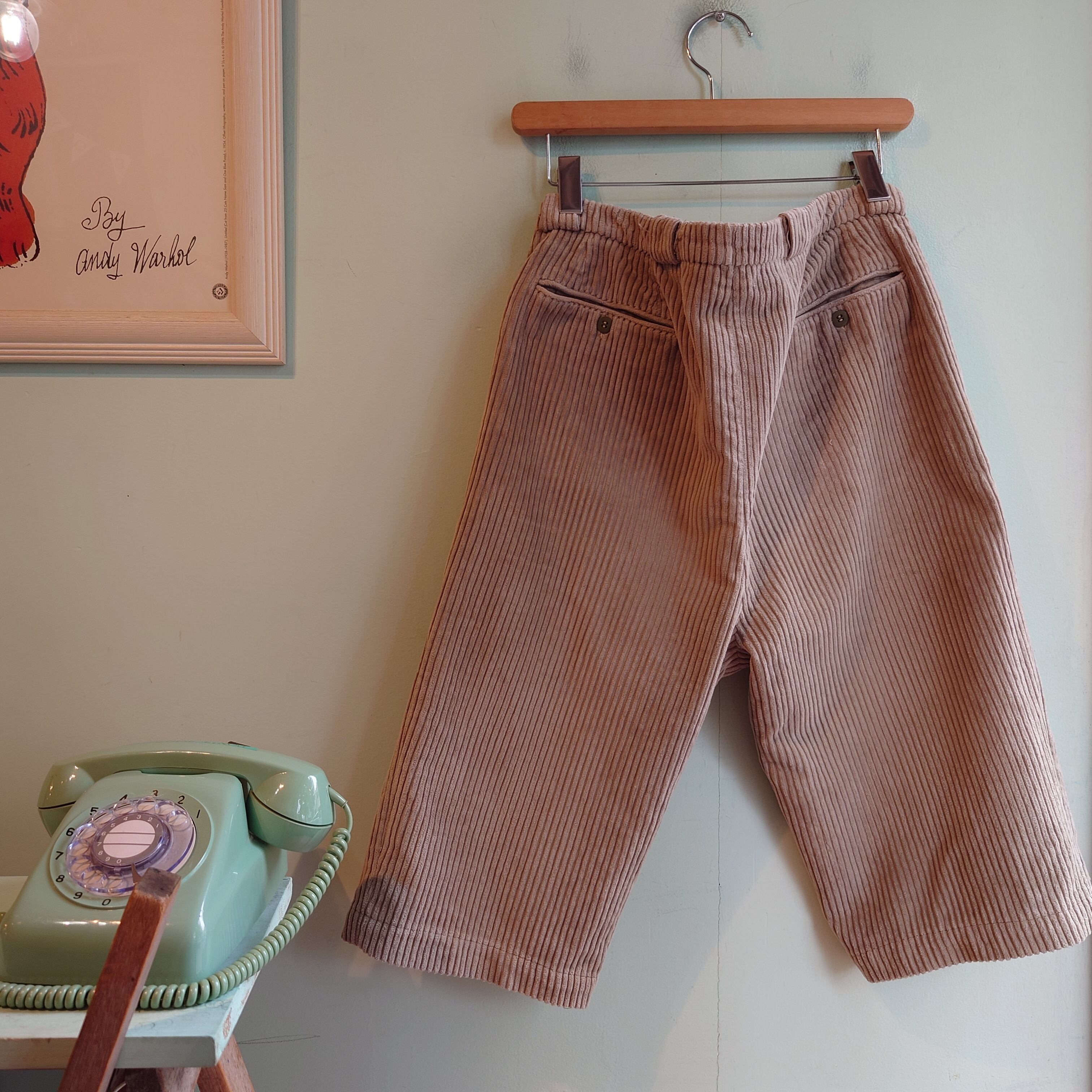 Cantoni社の生地を使った、70s ヴィンテージと思われるコーデュロイショーツ。どちらかといえばシャープなシルエットも、ベルベット感のある畝、ストンとしたカーブと長めなハーフ丈で存在感あり。普段ショーツを履かないお客様にも。