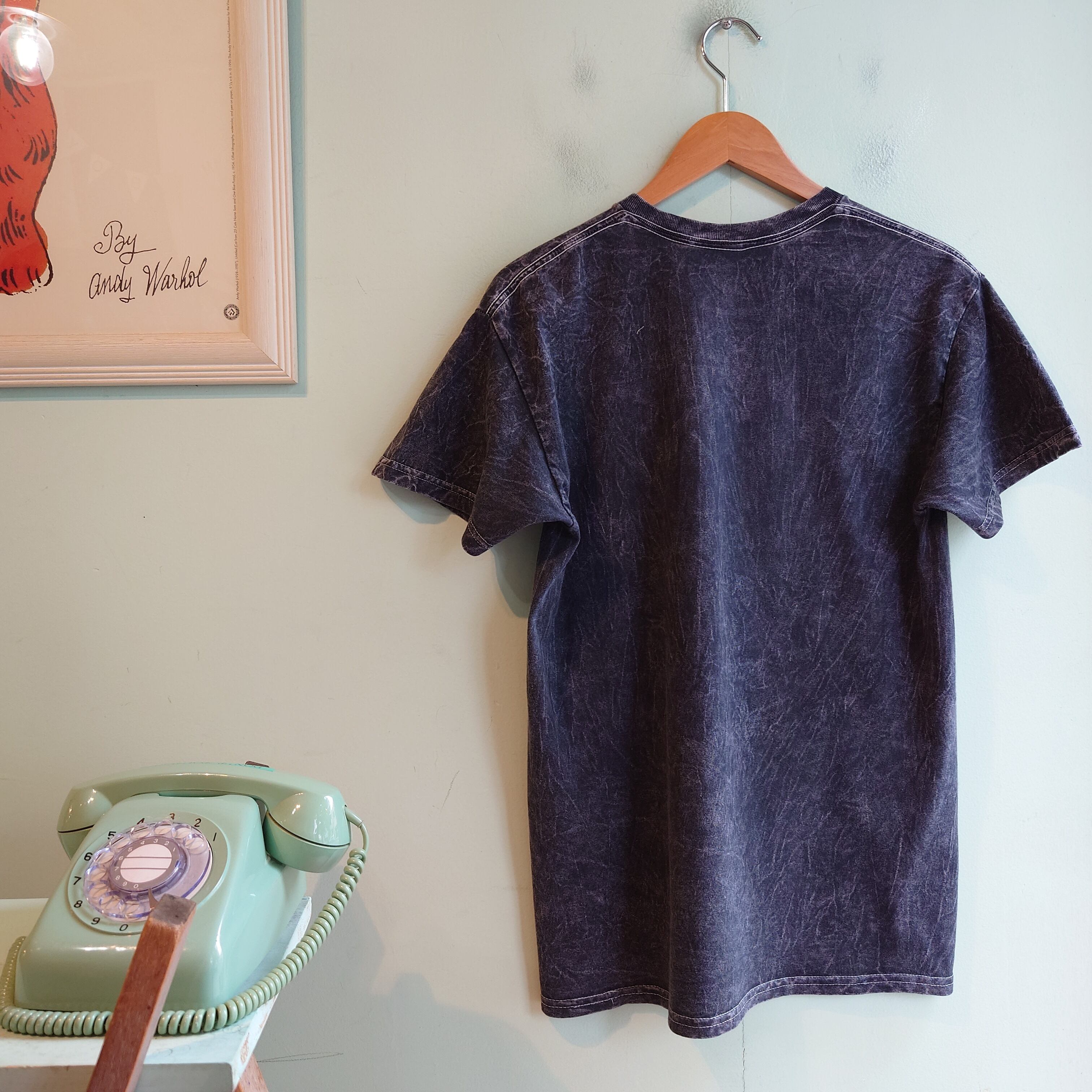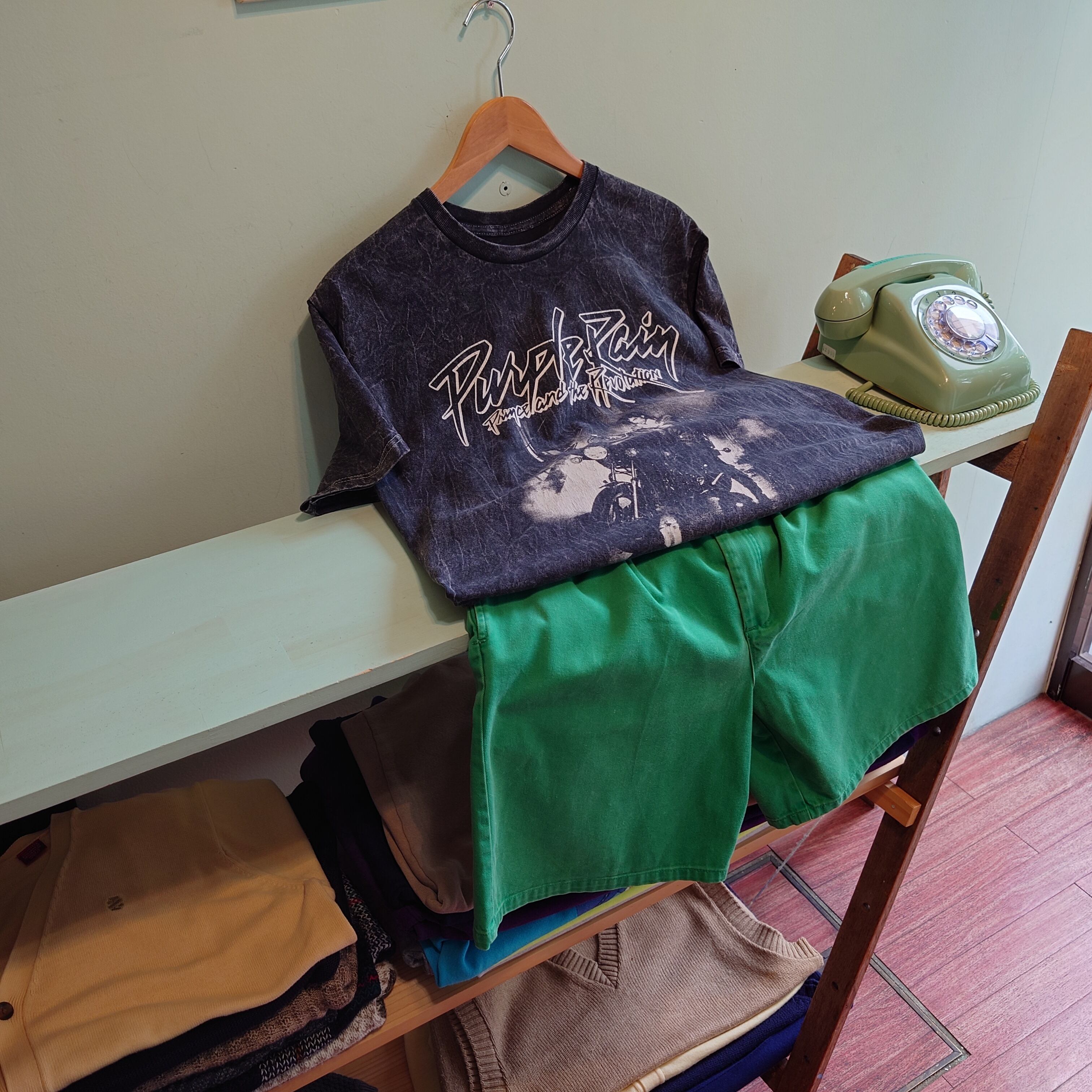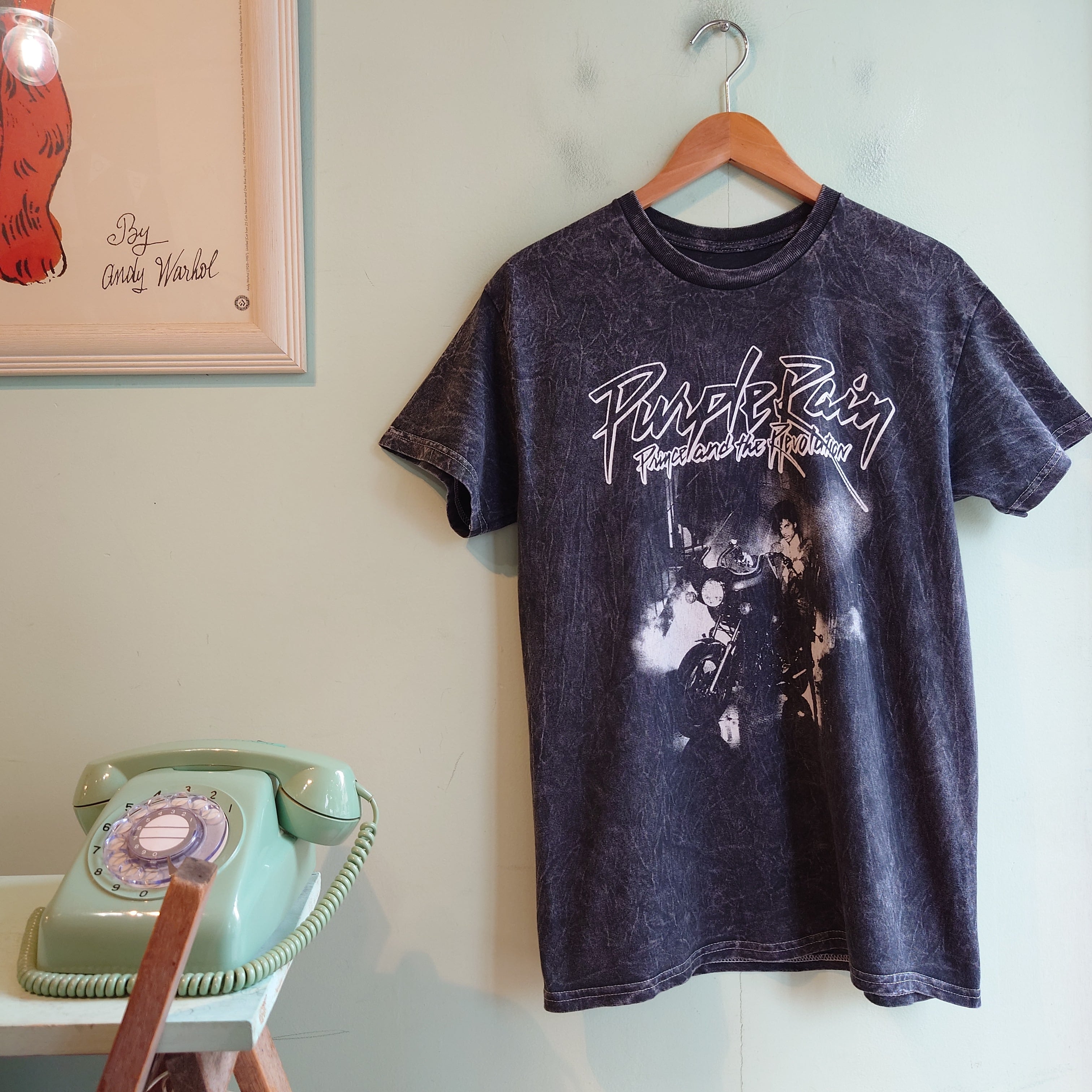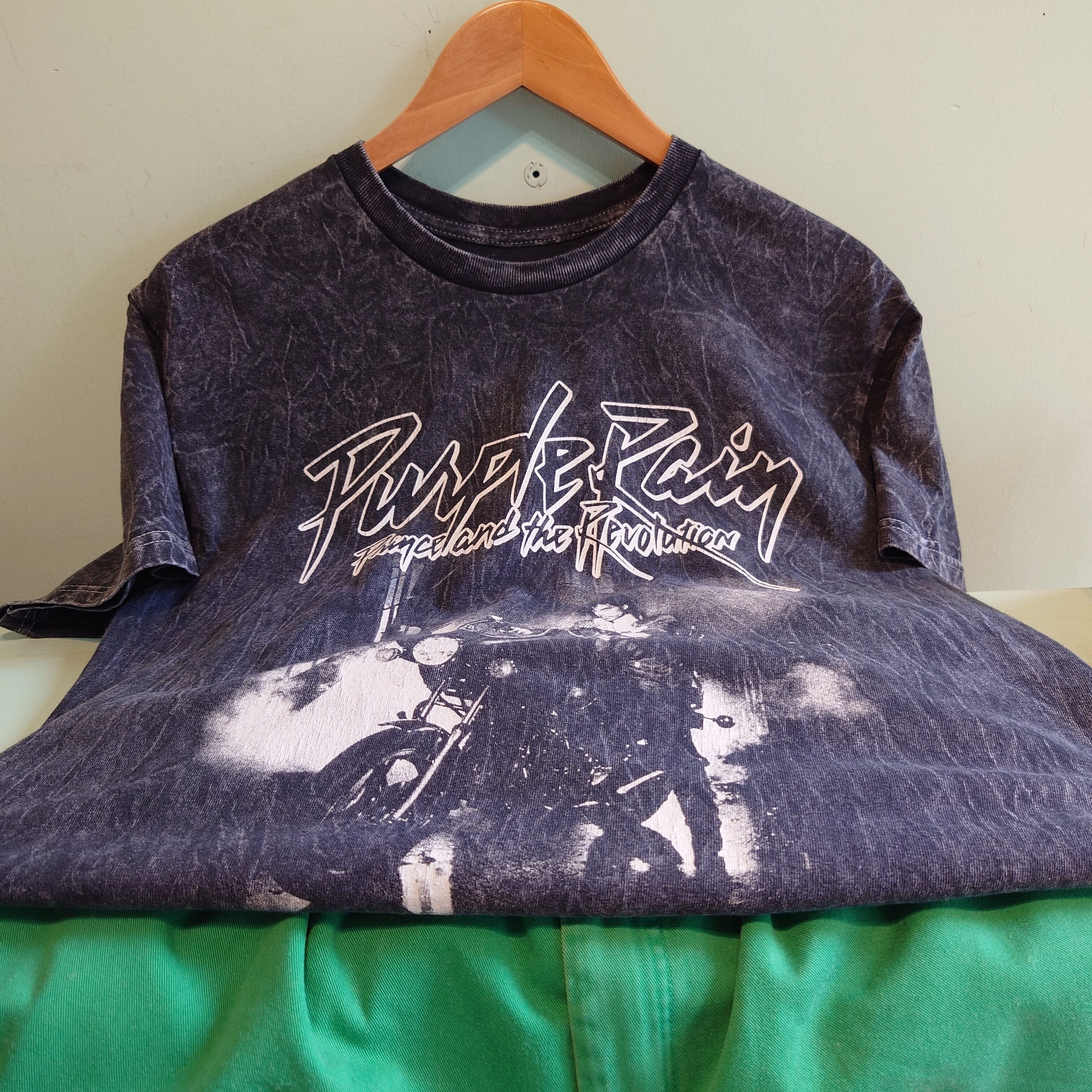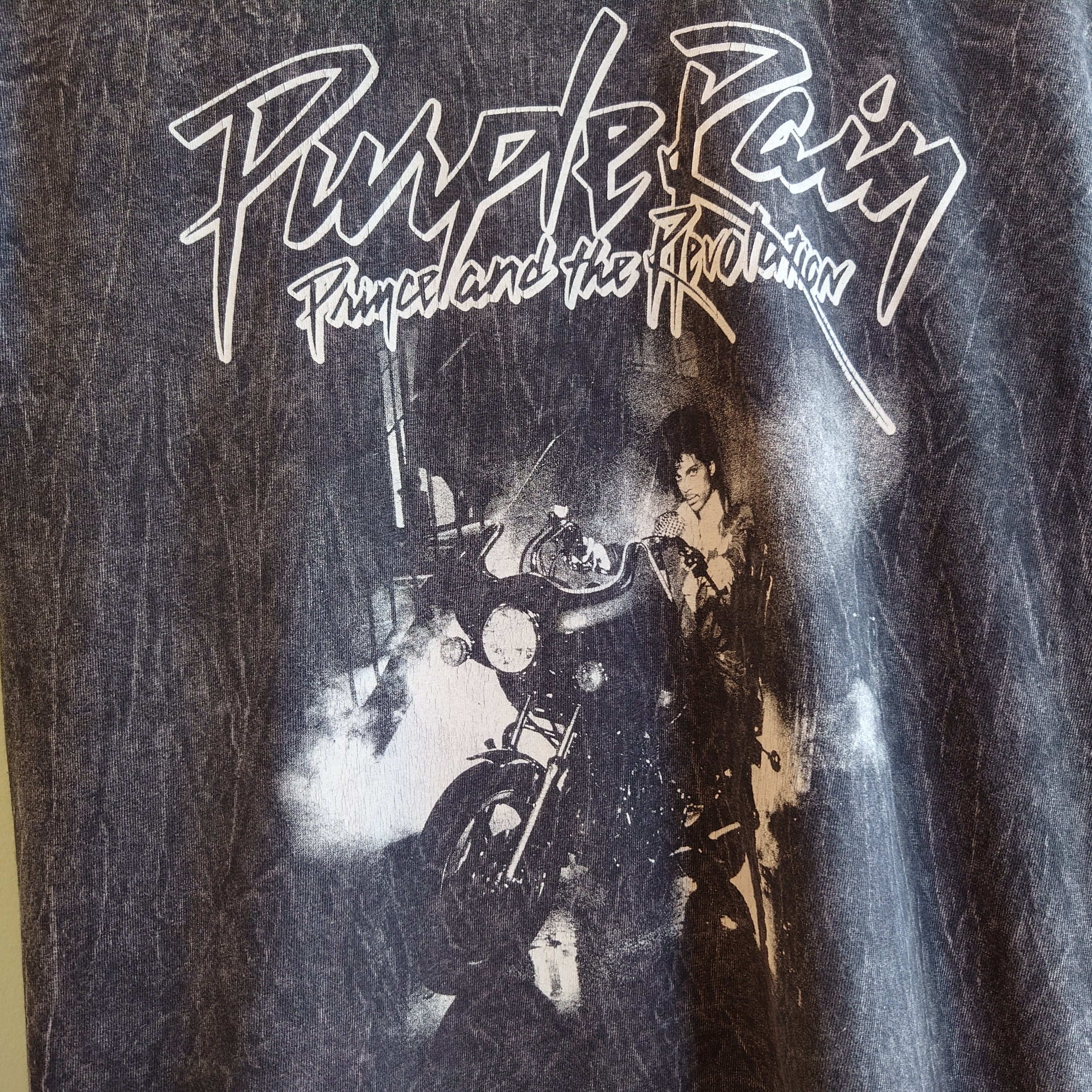 プリンスオフィシャルのグラフィックTシャツ。モチーフは自伝的映画のサウンドトラックにして、名盤中の名盤、パープル・レイン。お馴染みの紫を貴重としたカラフルさとは一線を画す、ドラマチックなブリーチ感が最高。