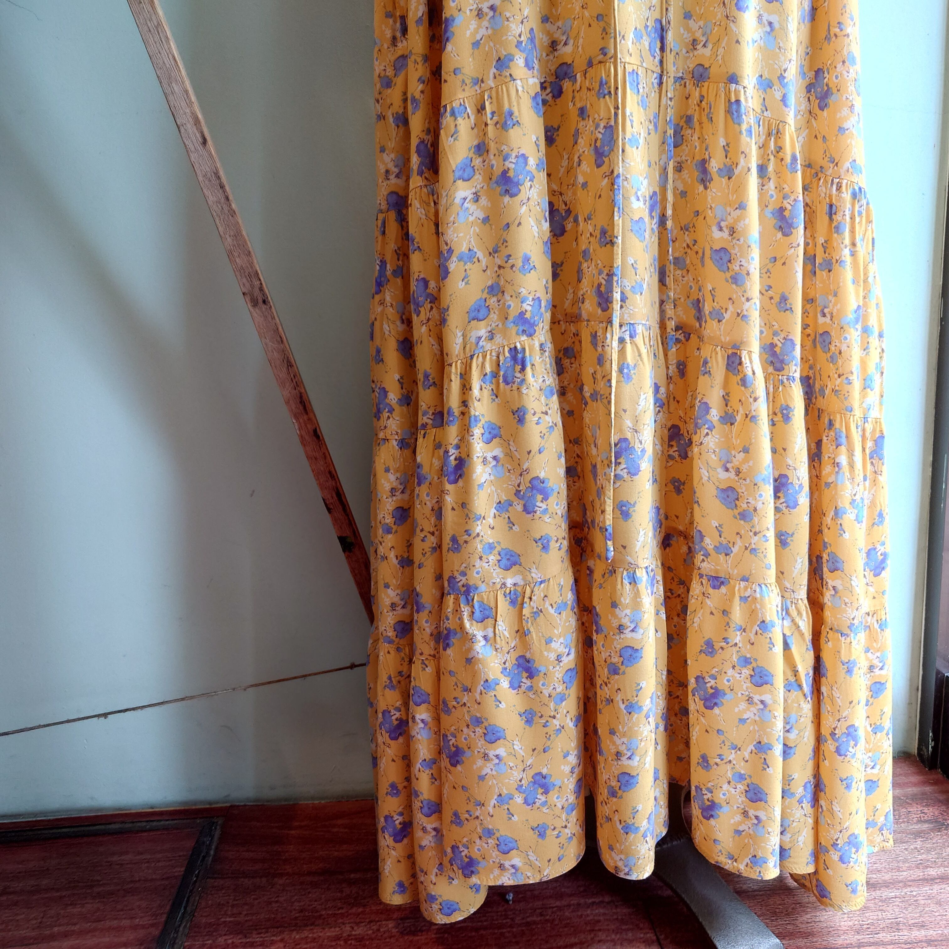 ティアードワンピース ボヘミアンドレス イエロー 花柄 マキシ丈