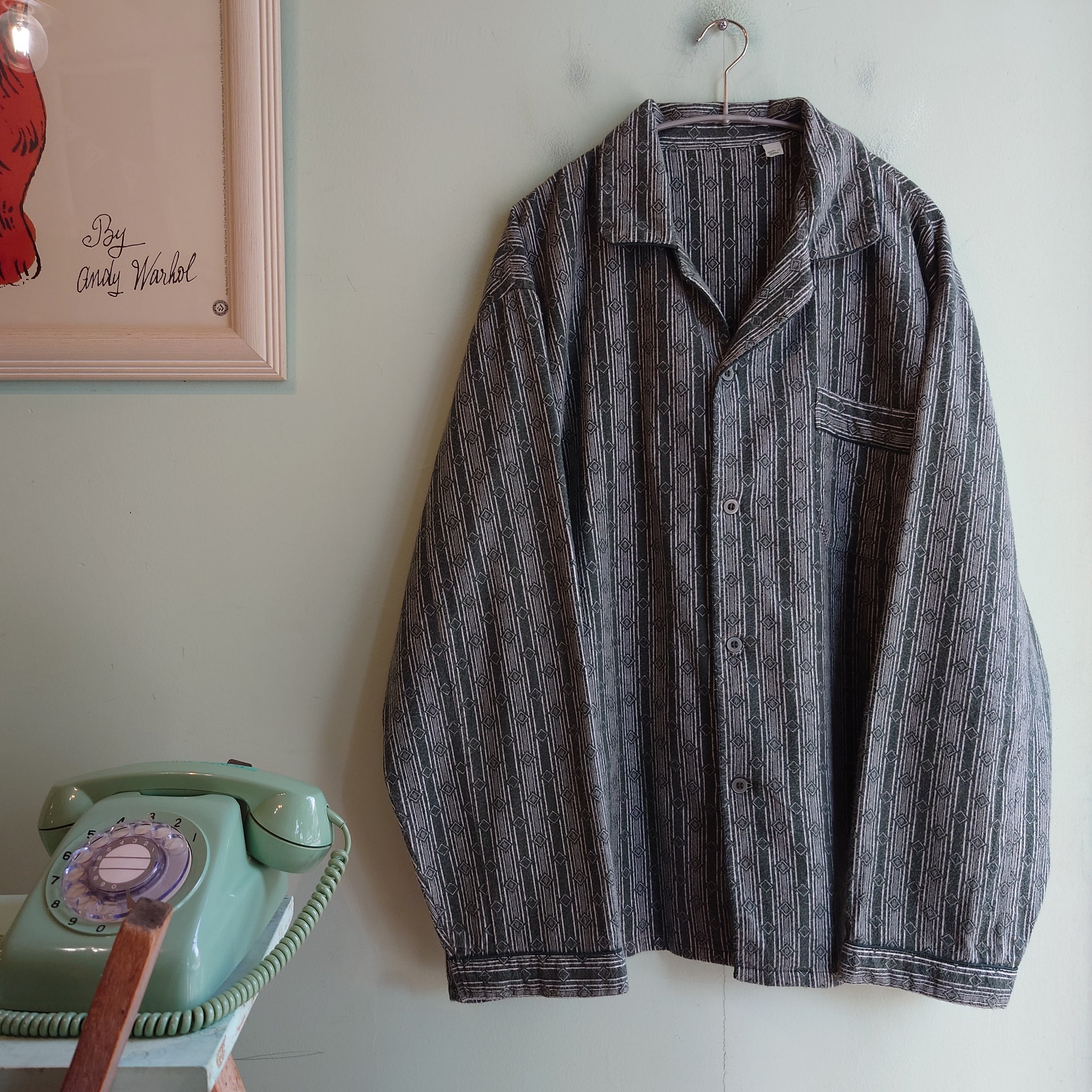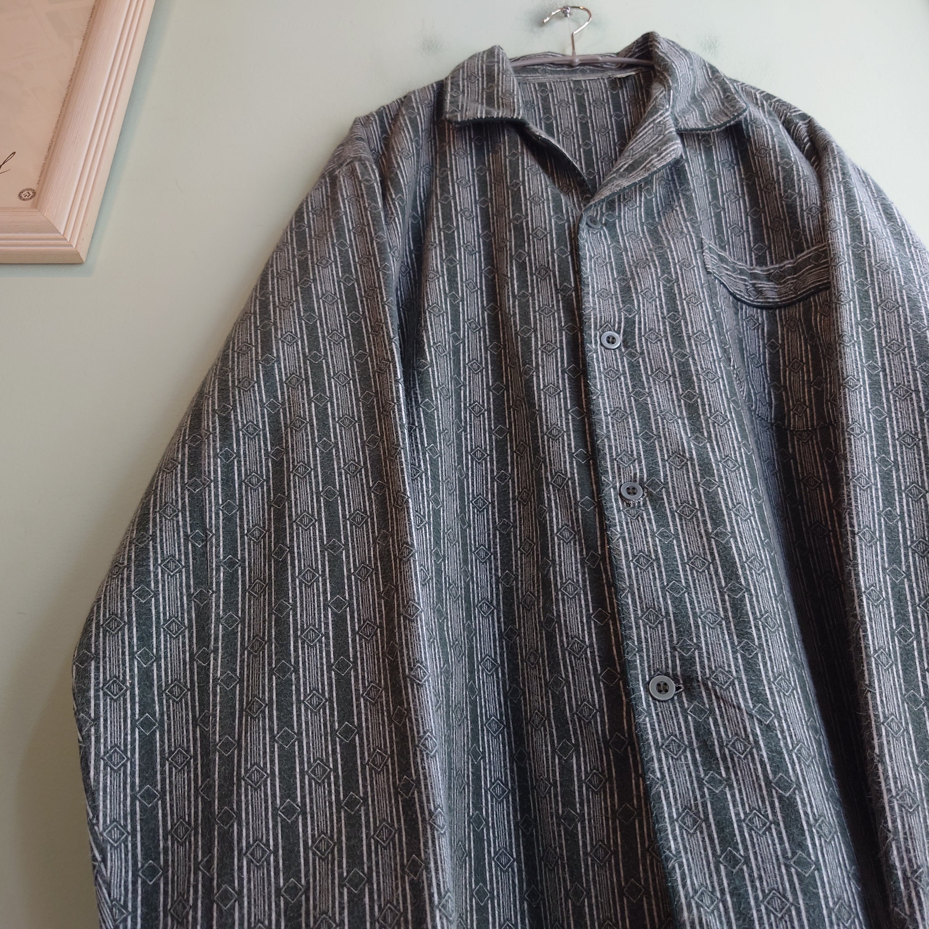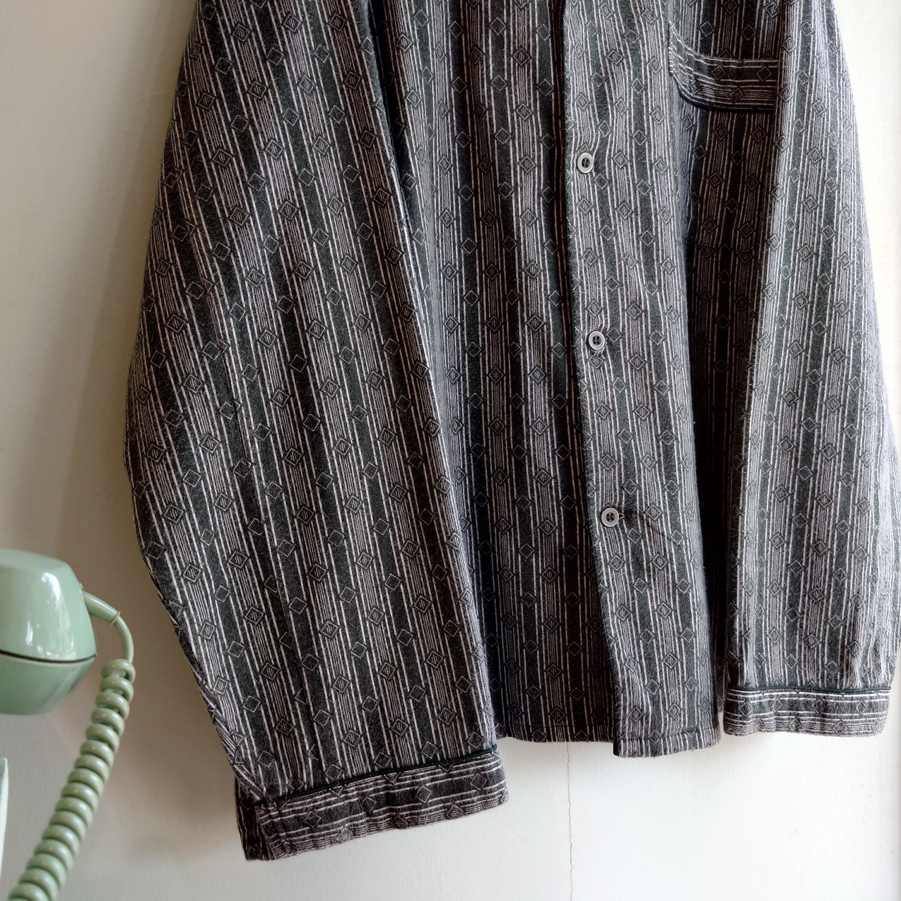フランネル系らしい強めな毛羽立ちがアンニュイな、総柄系のパジャマシャツ。濃いセージグリーンのようなくすみカラーに、ストライプのひし形を組み合わせた幾何学柄。夏の羽織にもおすすめな、フランネルらしい風の抜け方も良し。