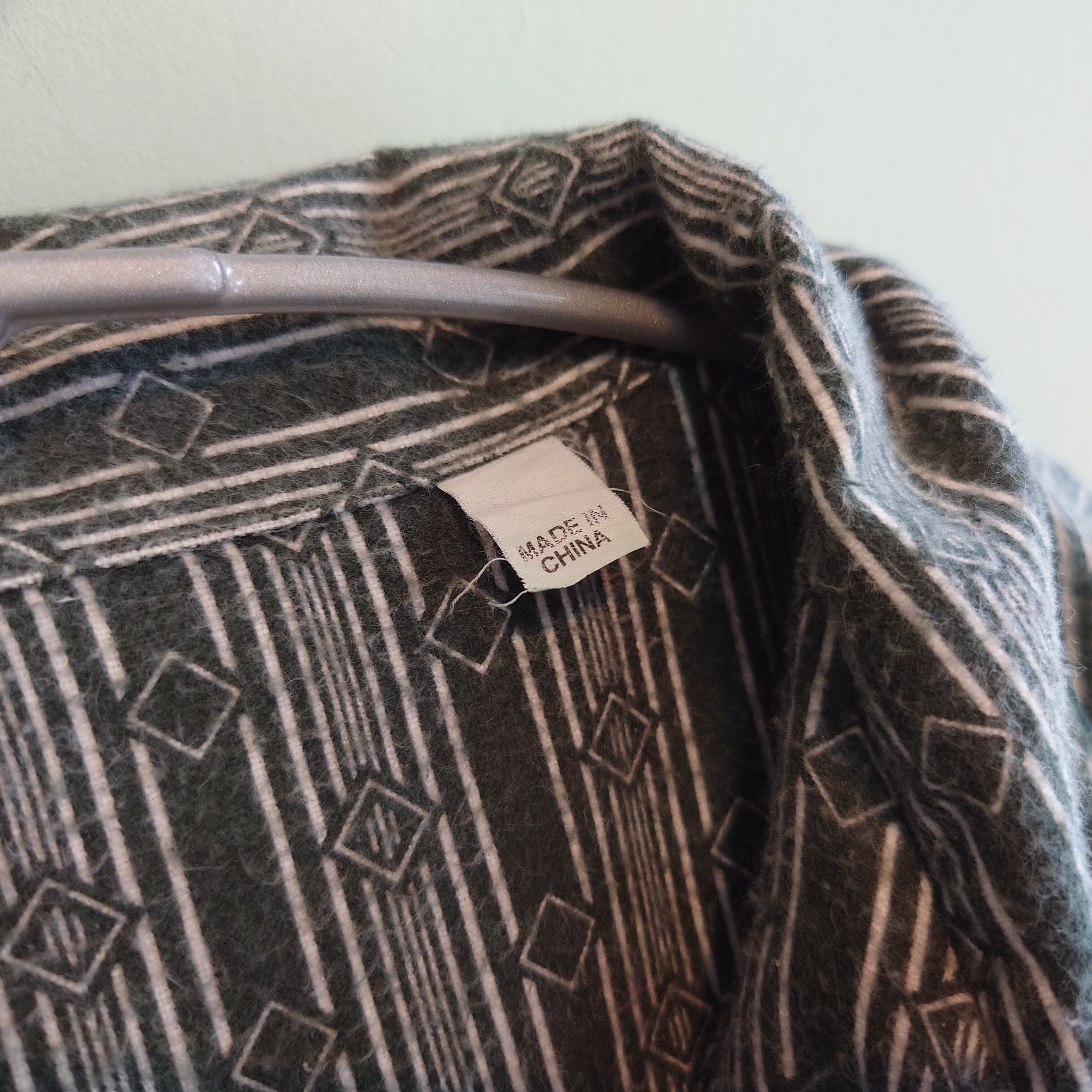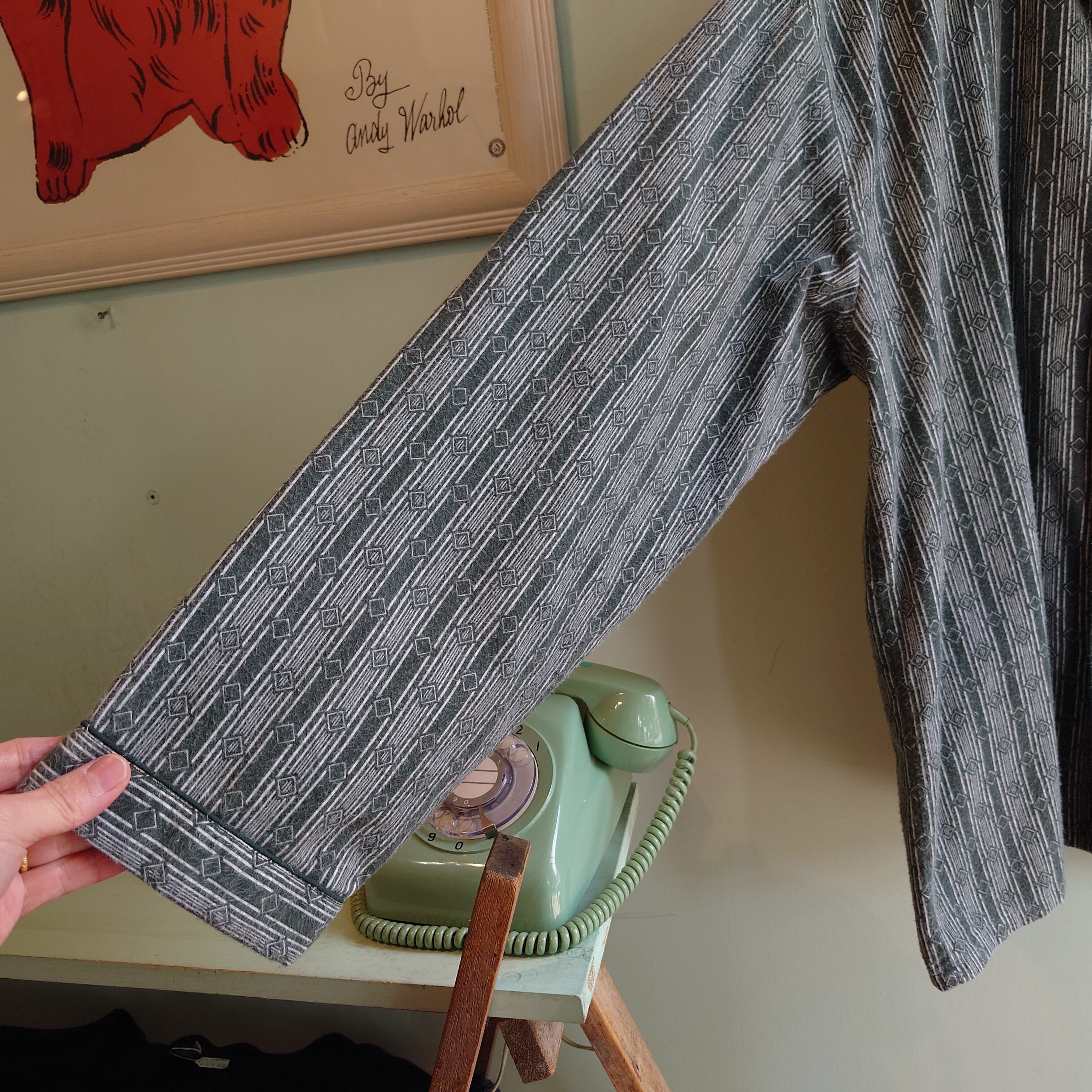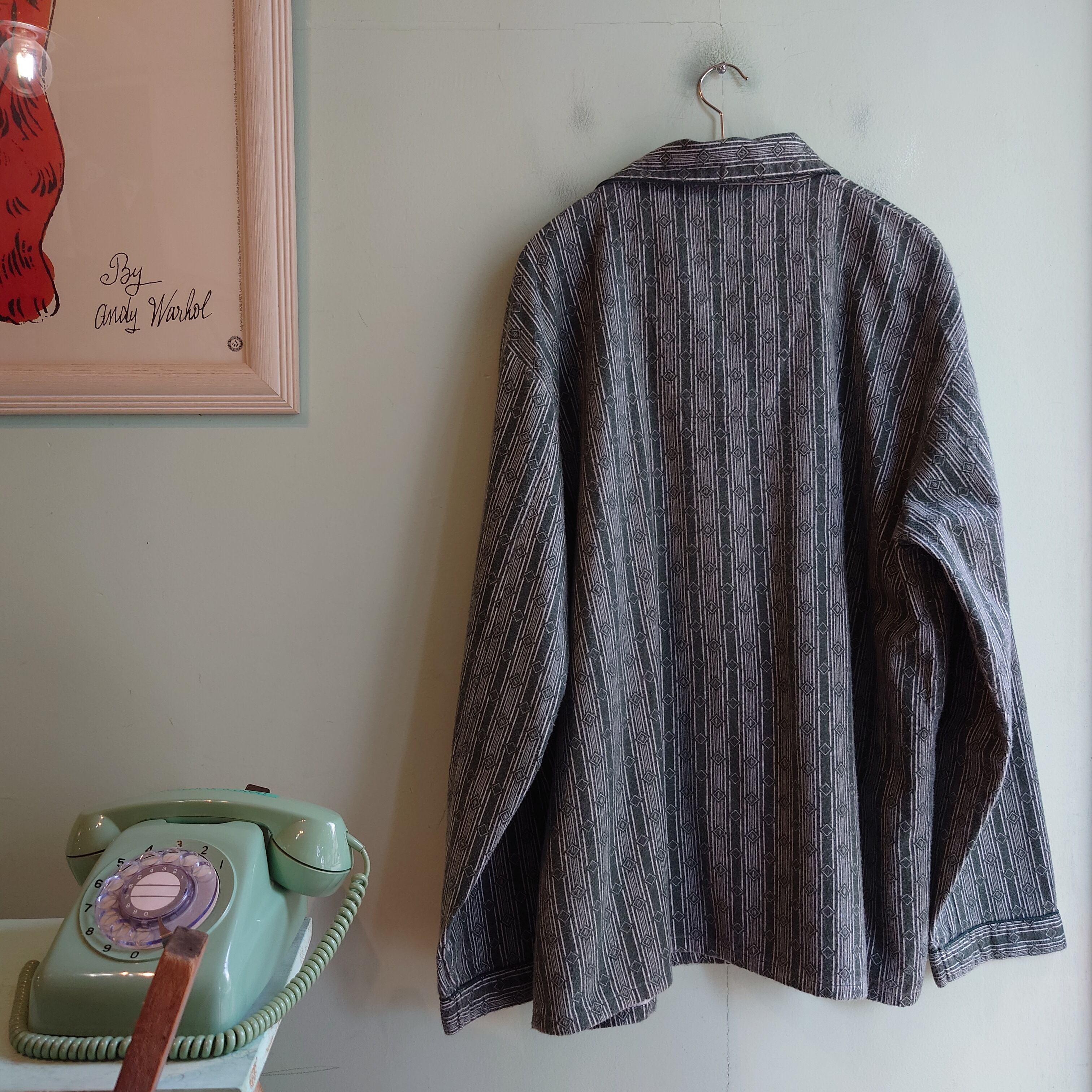 フランネル系らしい強めな毛羽立ちがアンニュイな、総柄系のパジャマシャツ。濃いセージグリーンのようなくすみカラーに、ストライプのひし形を組み合わせた幾何学柄。夏の羽織にもおすすめな、フランネルらしい風の抜け方も良し。