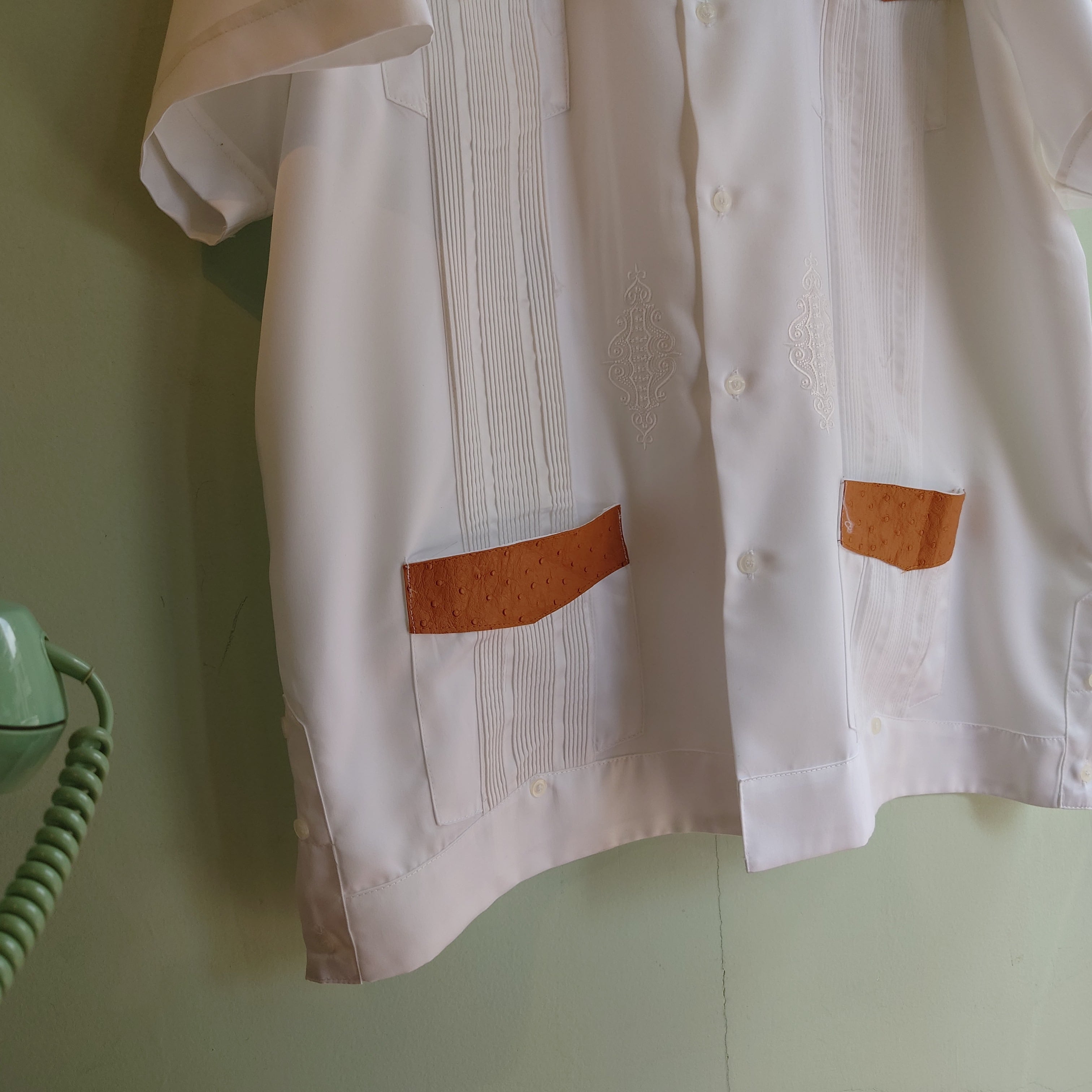 ナイトウエアのようなサテン生地に、フェイクレザーの切り替えがレアなグアヤベラシャツ。縦畝のステッチや、刺繍も光沢感のあるドラマチックな雰囲気で、抜けのある白がいい。一枚で主役になる白シャツをお探しのお客様へ。