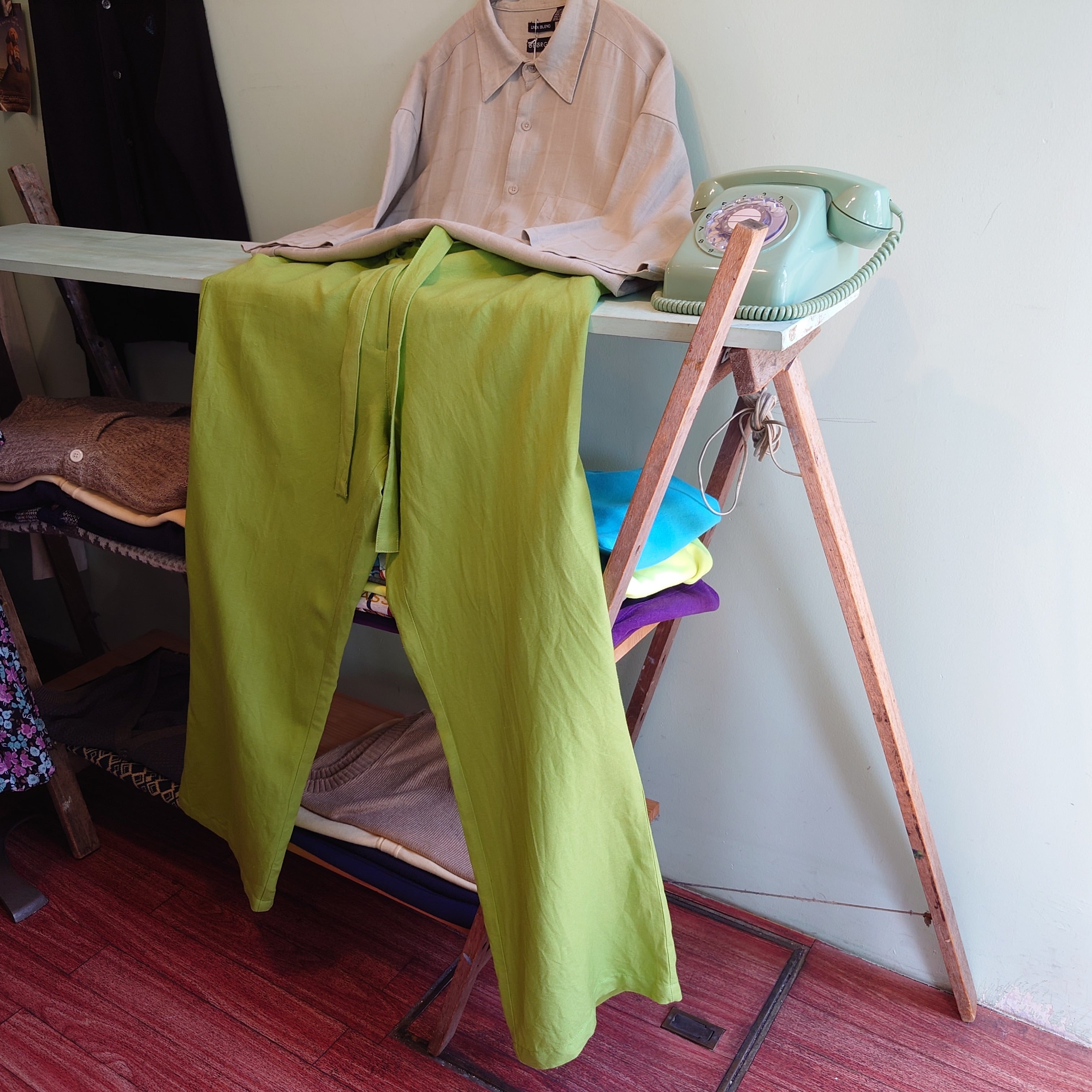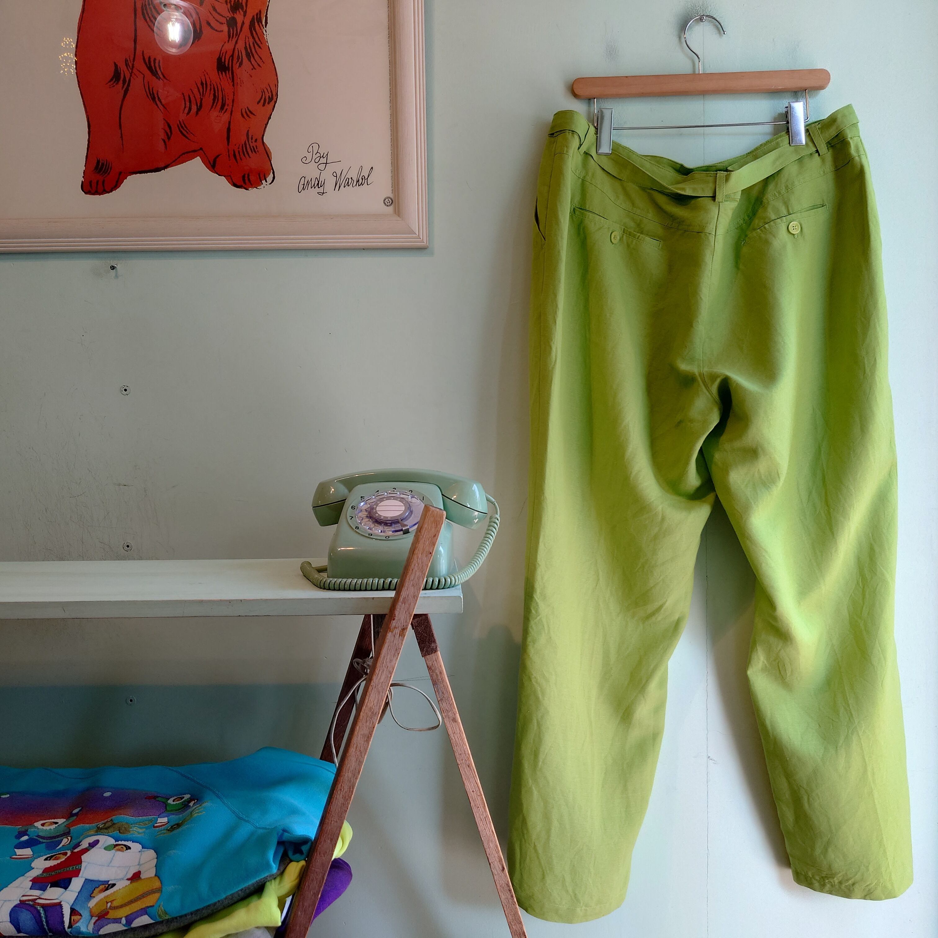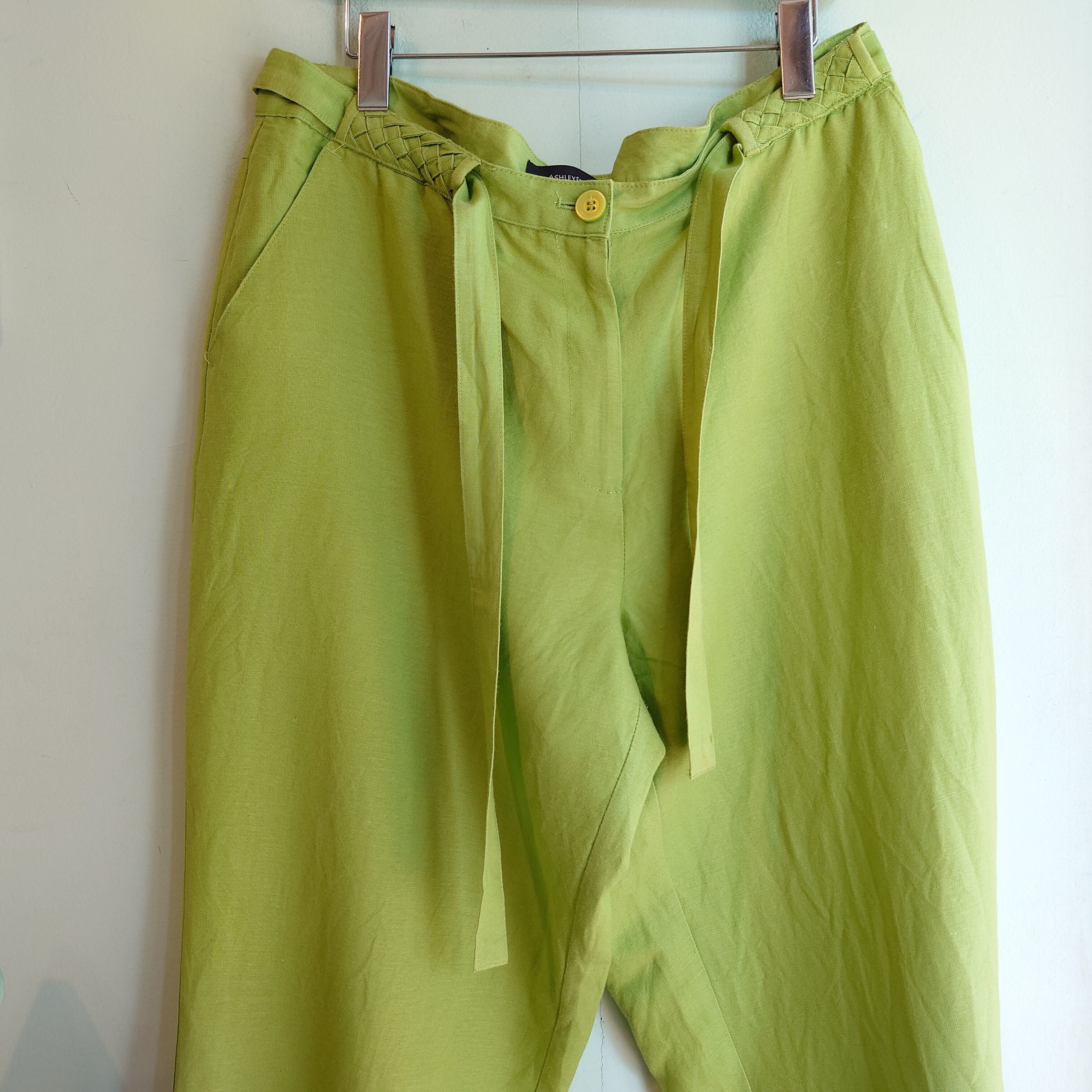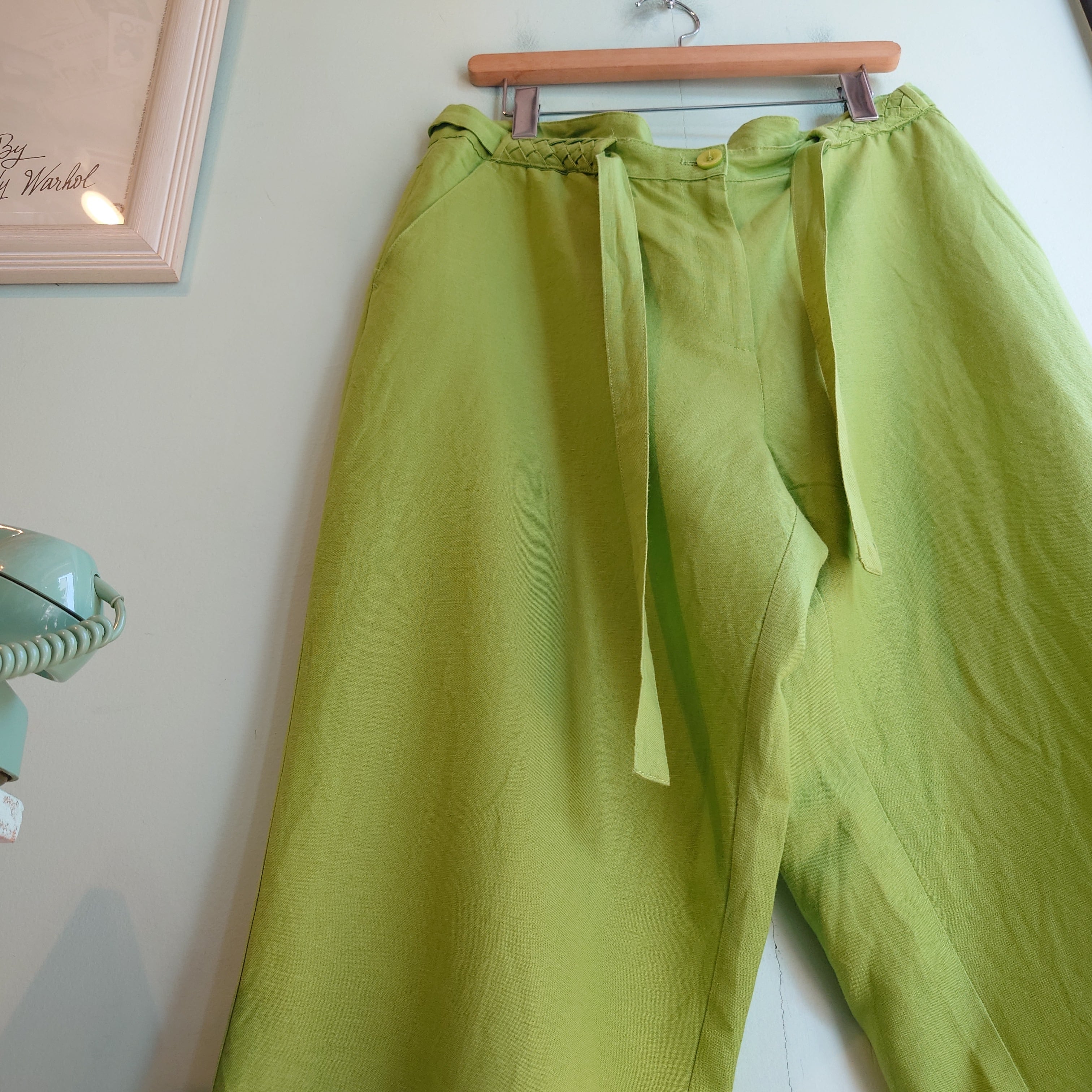 Ashley Stewartのリネン混イージーパンツ。リゾートライクなクタッとしたとろみのある生地感に、強い発色の黄緑がレア。付属の紐でぎゅっと絞るタイプで、ストンと太めなシルエットがかわいい個性派。人とは違うリネン系をお探しのお客様へ。