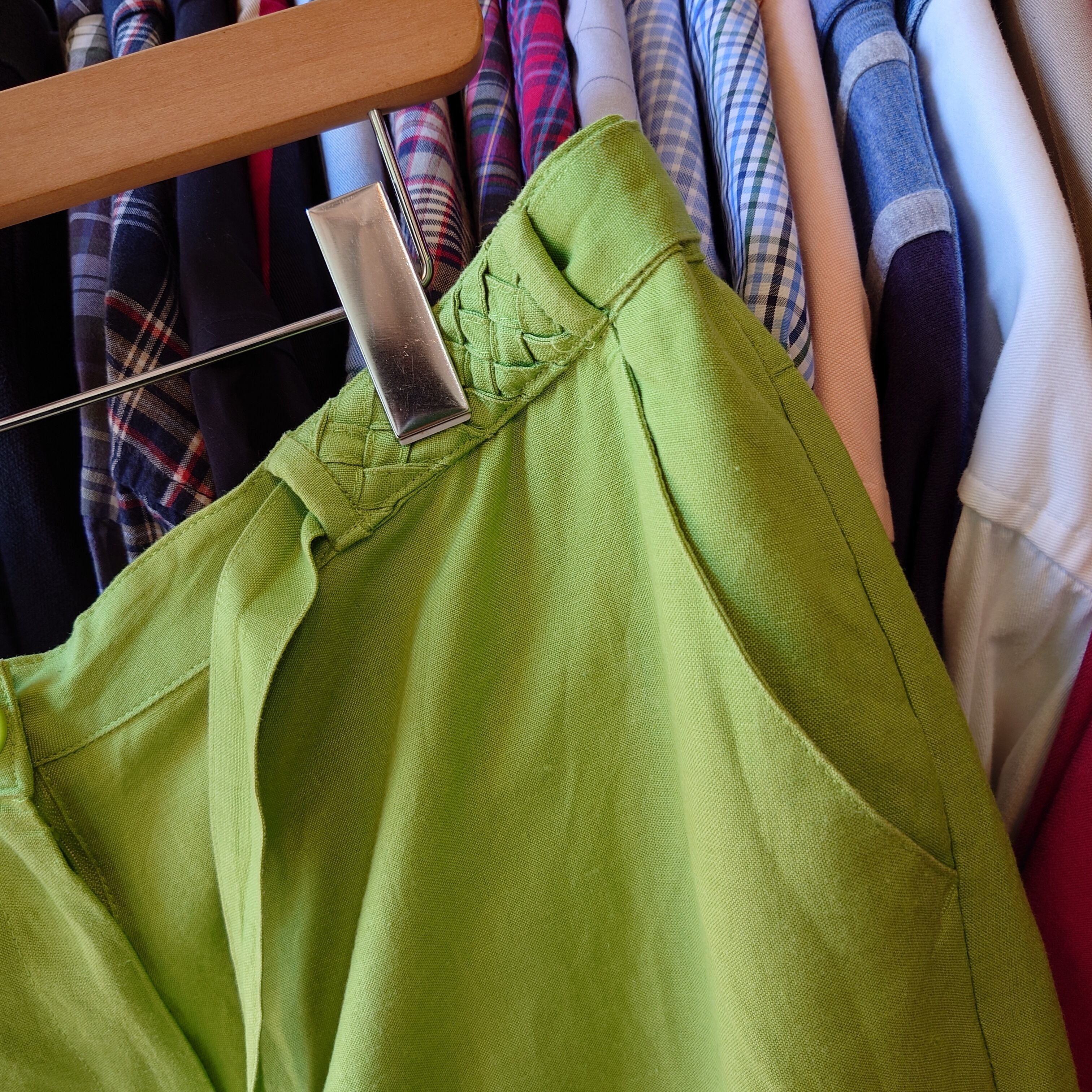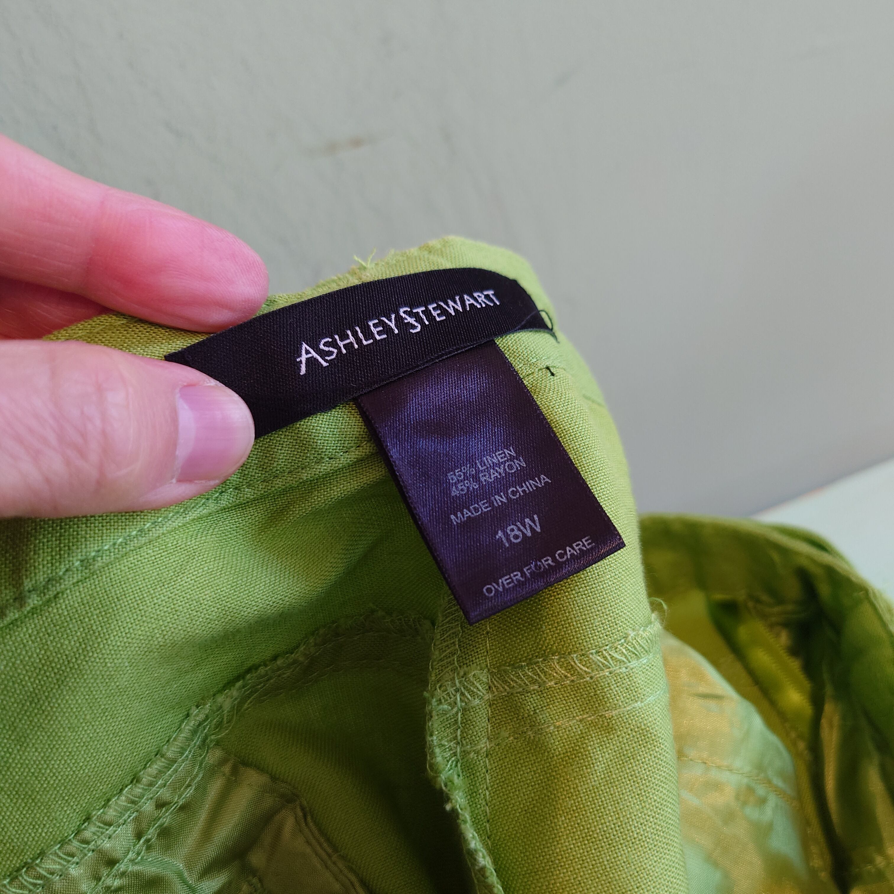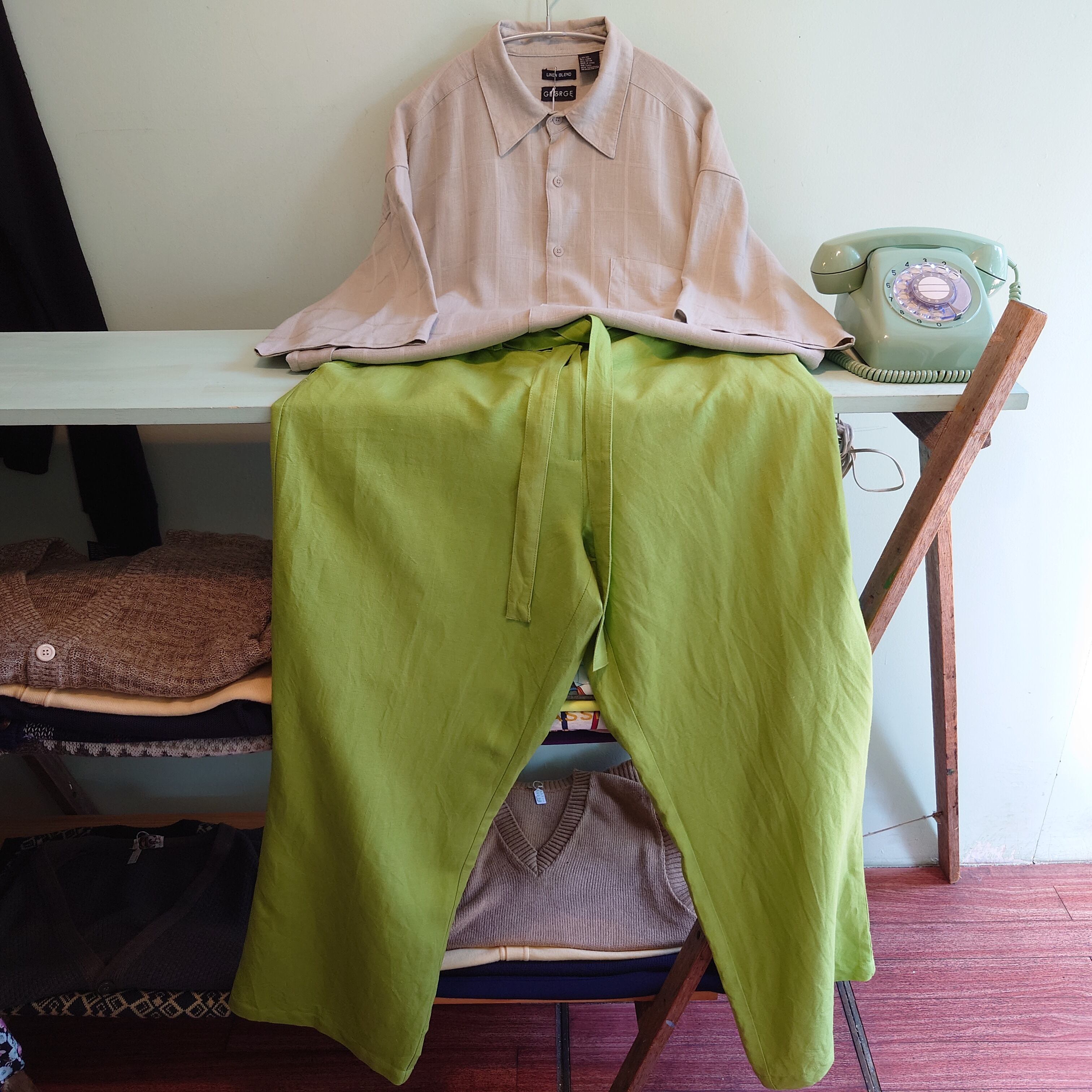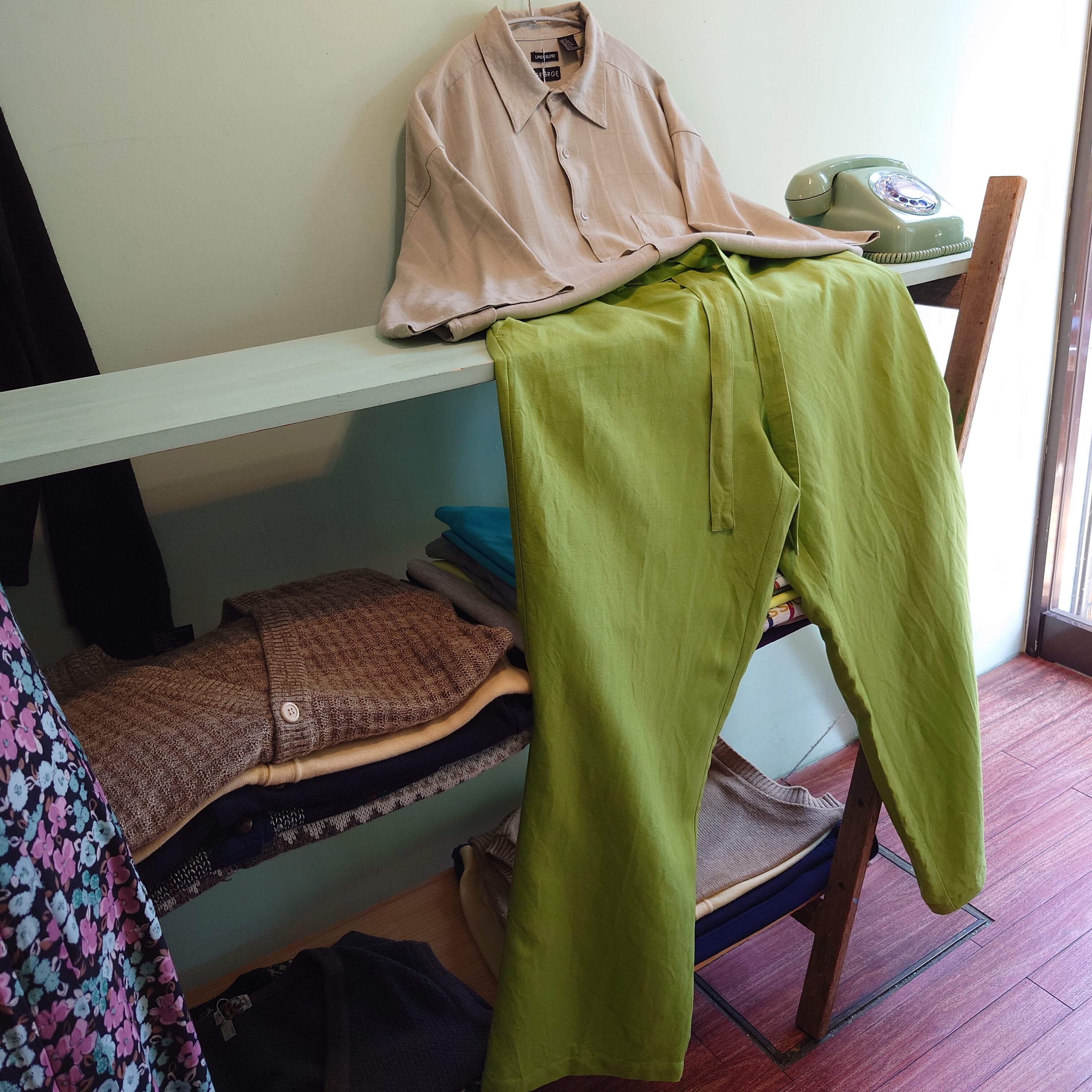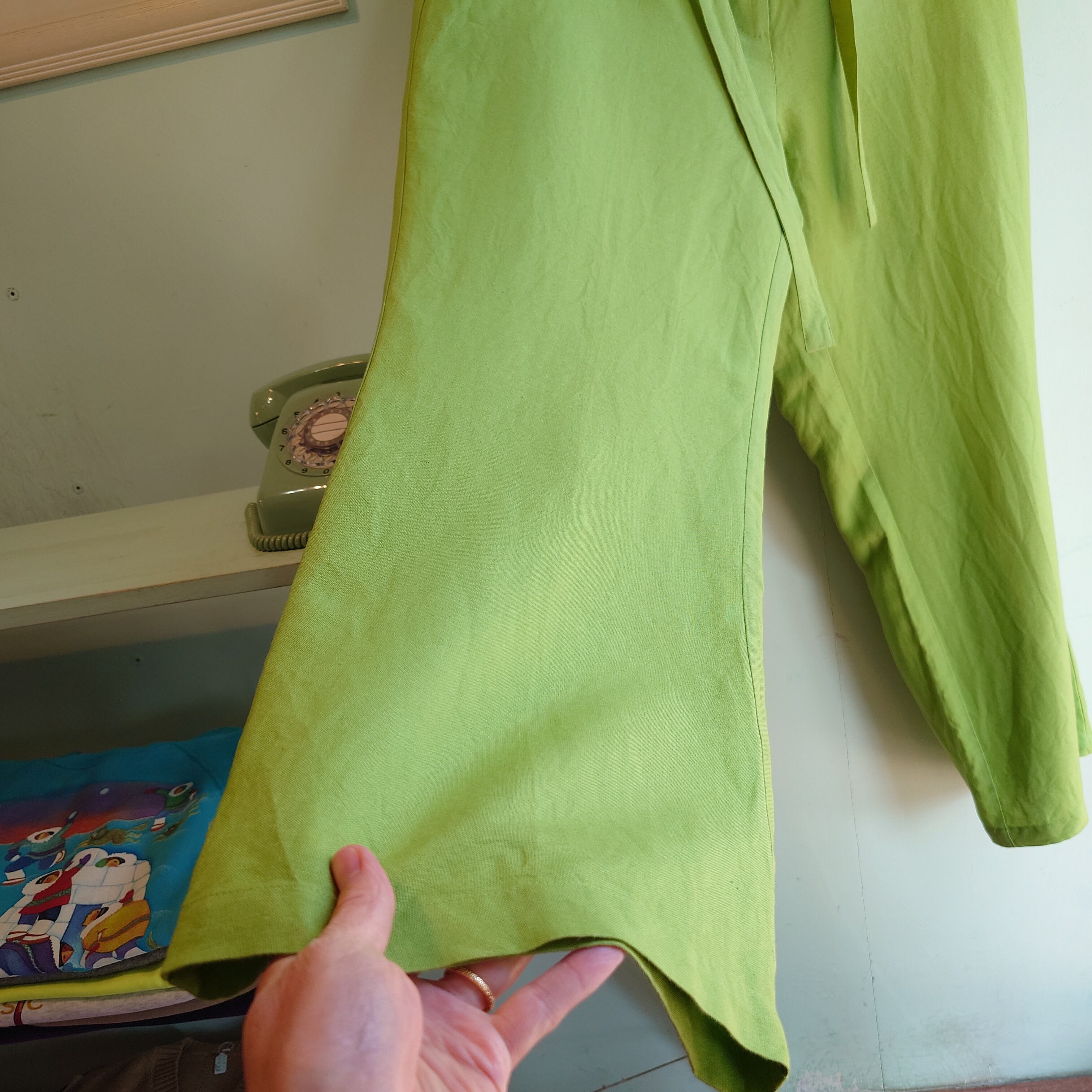 Ashley Stewartのリネン混イージーパンツ。リゾートライクなクタッとしたとろみのある生地感に、強い発色の黄緑がレア。付属の紐でぎゅっと絞るタイプで、ストンと太めなシルエットがかわいい個性派。人とは違うリネン系をお探しのお客様へ。