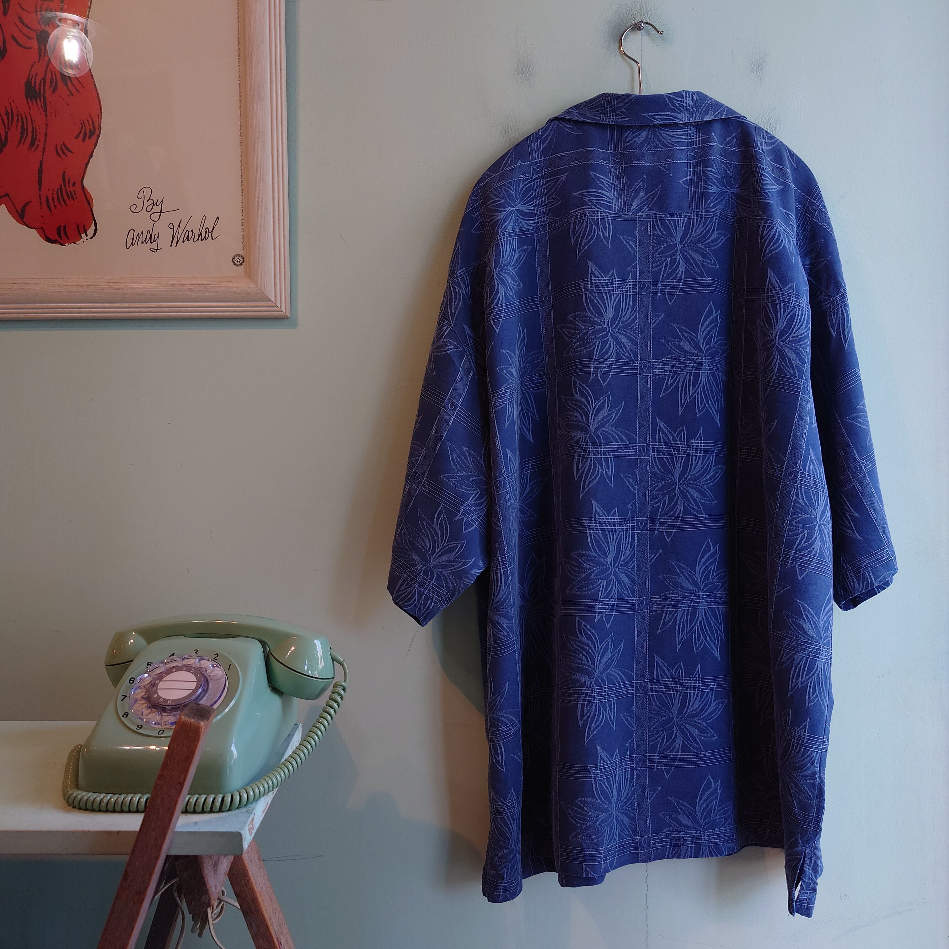 夏の定番、Jamaica Jaxxの総柄シャツ。明るめなネイビーのワントーン、100%シルクのクタッとした風合いが気持ちいい。ボトムを選ばず一気にリラックスムードに。普段柄シャツを着ないお客様にも合わせやすく、Tシャツとは違う涼しさはシルクの開襟ならでは。