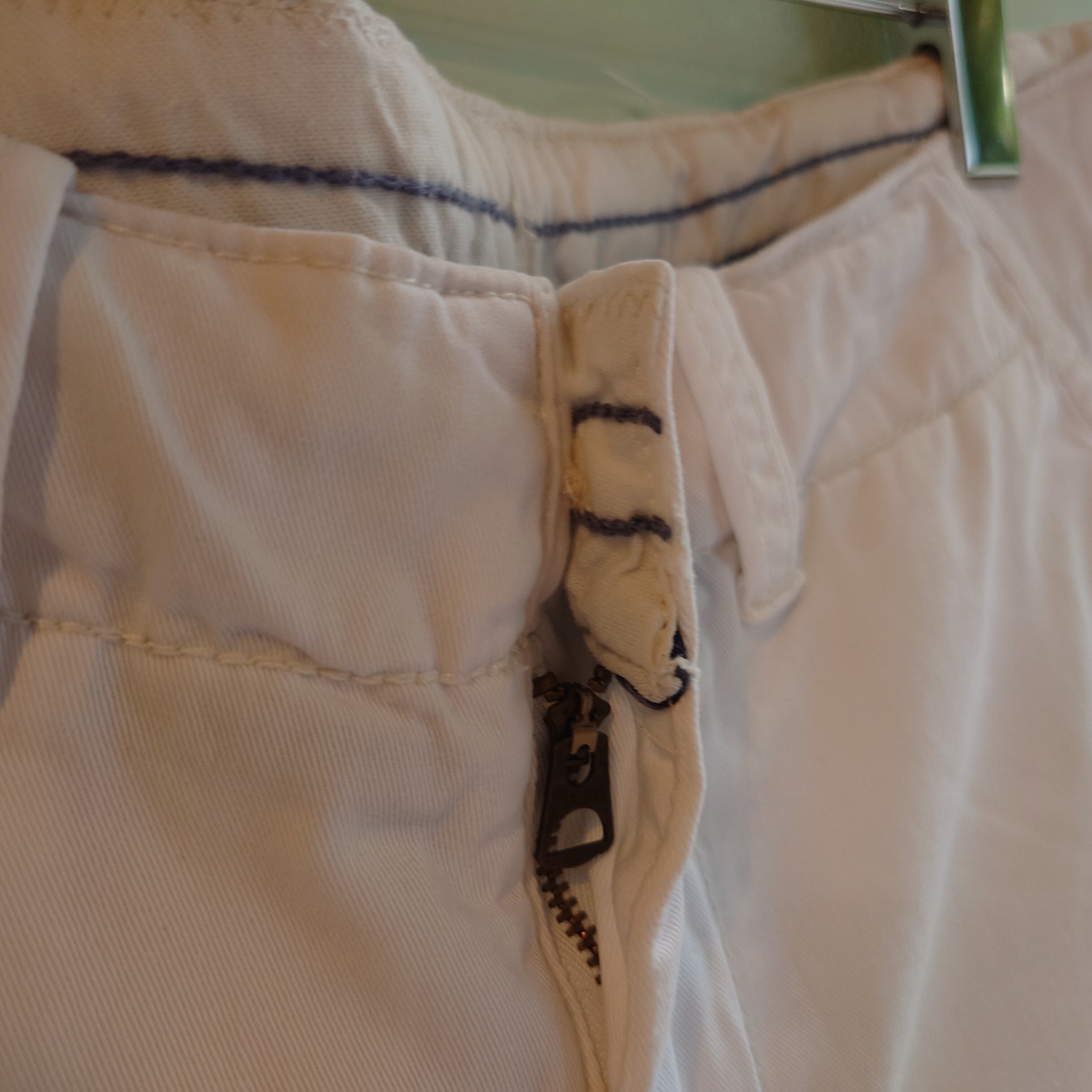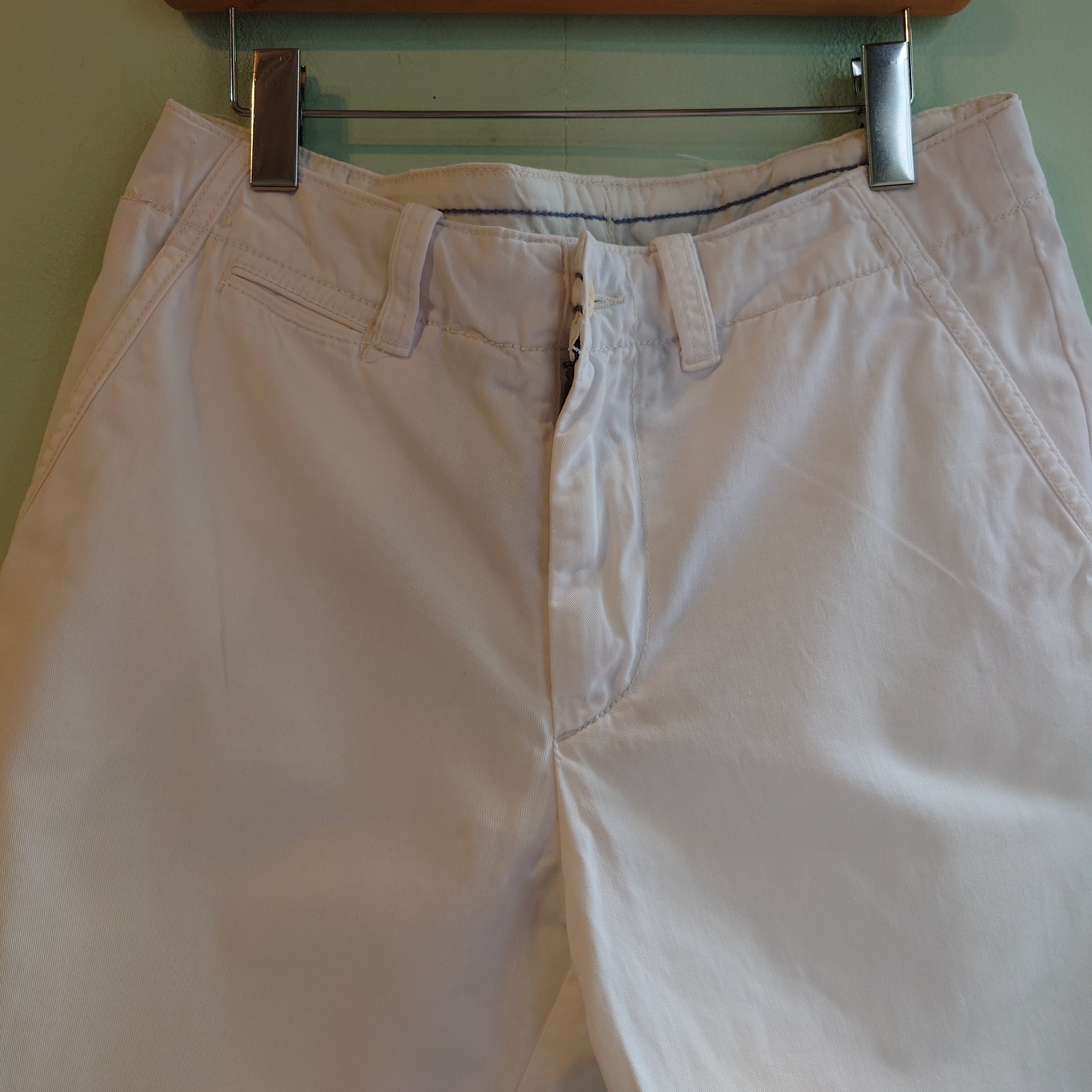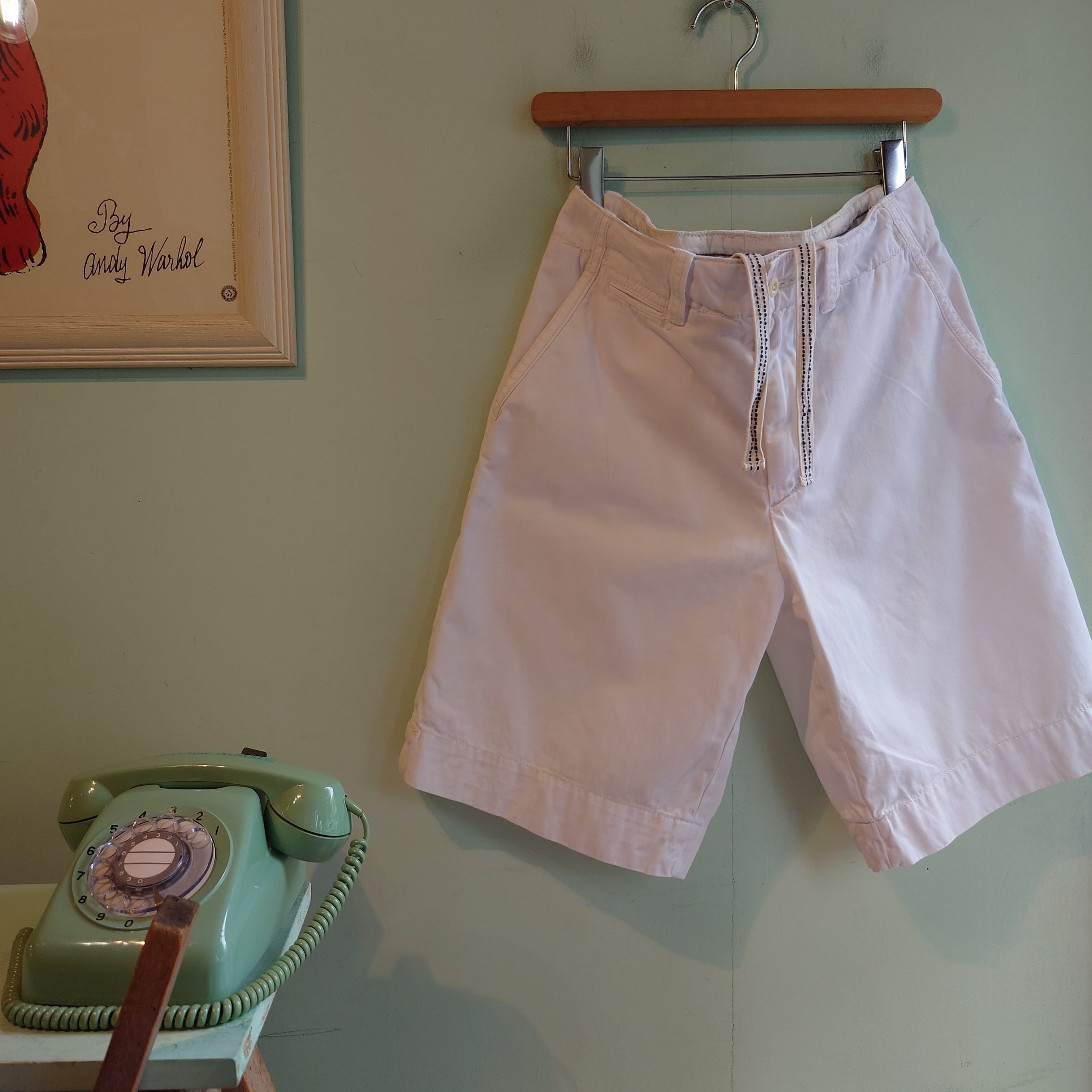 伝統的なボリューム感あるチノショーツをベースに、イージーパンツのように履けるウエスト紐を装備した変わり種コットンショーツ。刺繍のアクセントや、やや長めな丈感など、90s後半から00s 初頭らしいデザインが光る一本。女子コーデにも活躍間違いなしの白ショーツです。