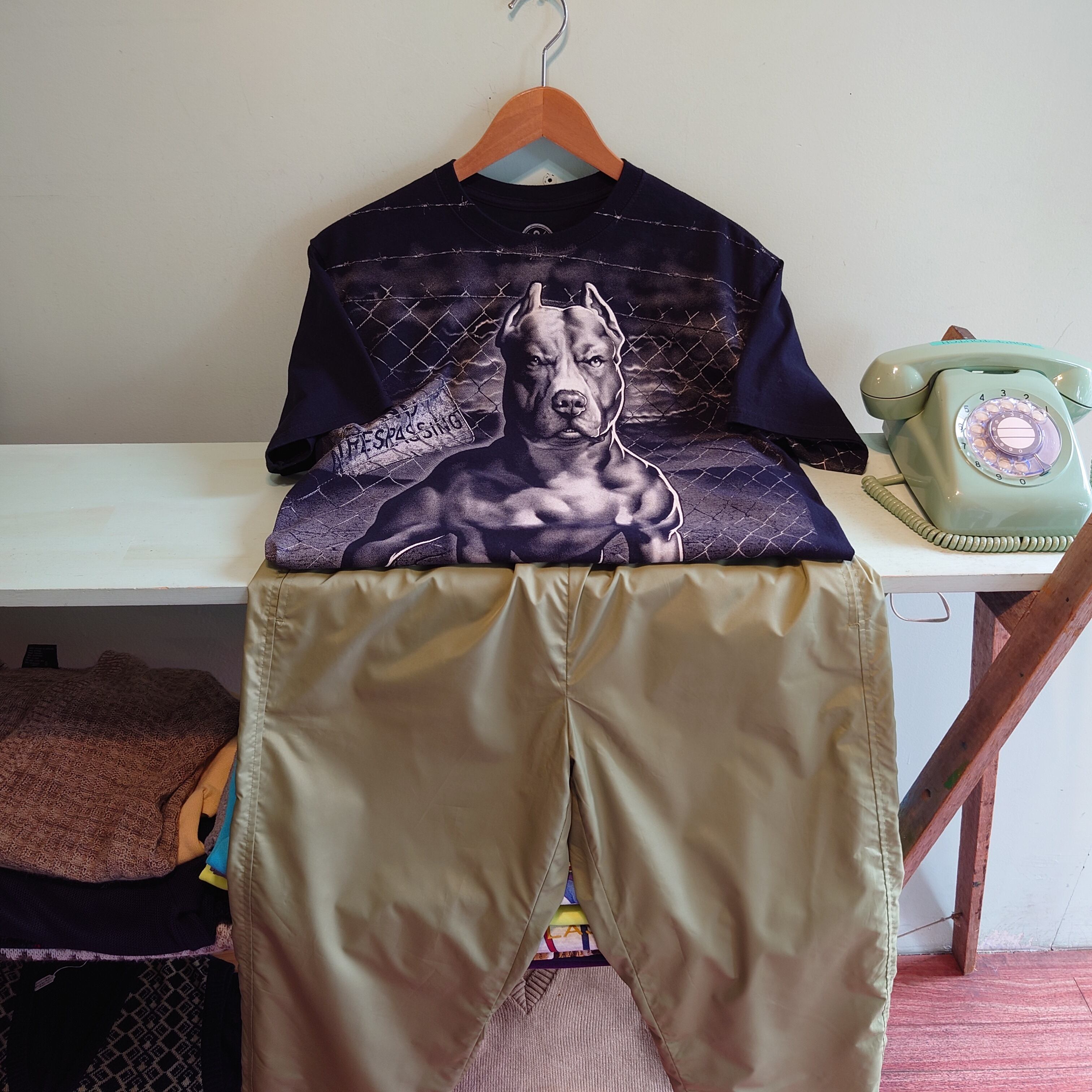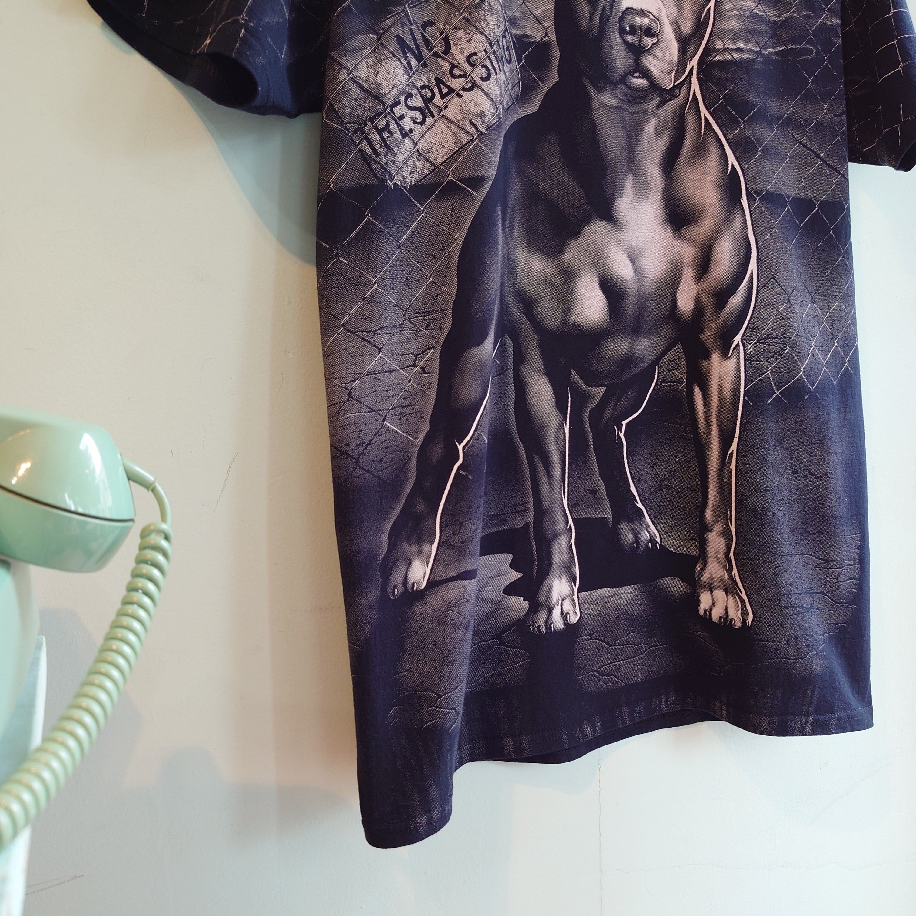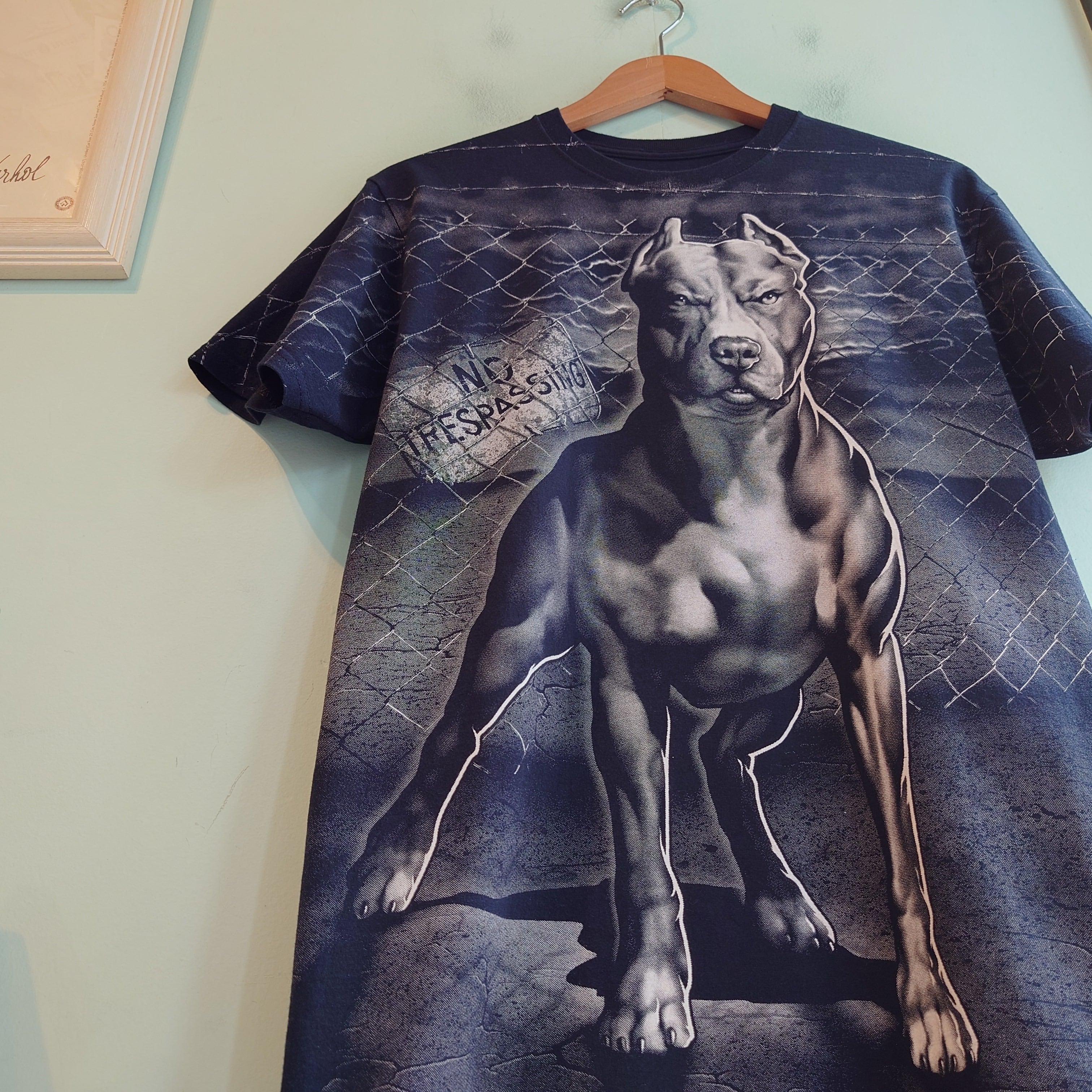 狂犬らしく金網のフェンスを背景に「立入禁止」の看板と、フォトライクに力強く描かれたピットブルのグラフィックTシャツ。90年代のハードコアバンドのジャケットを思わせる、独特な雰囲気がかっこいい。