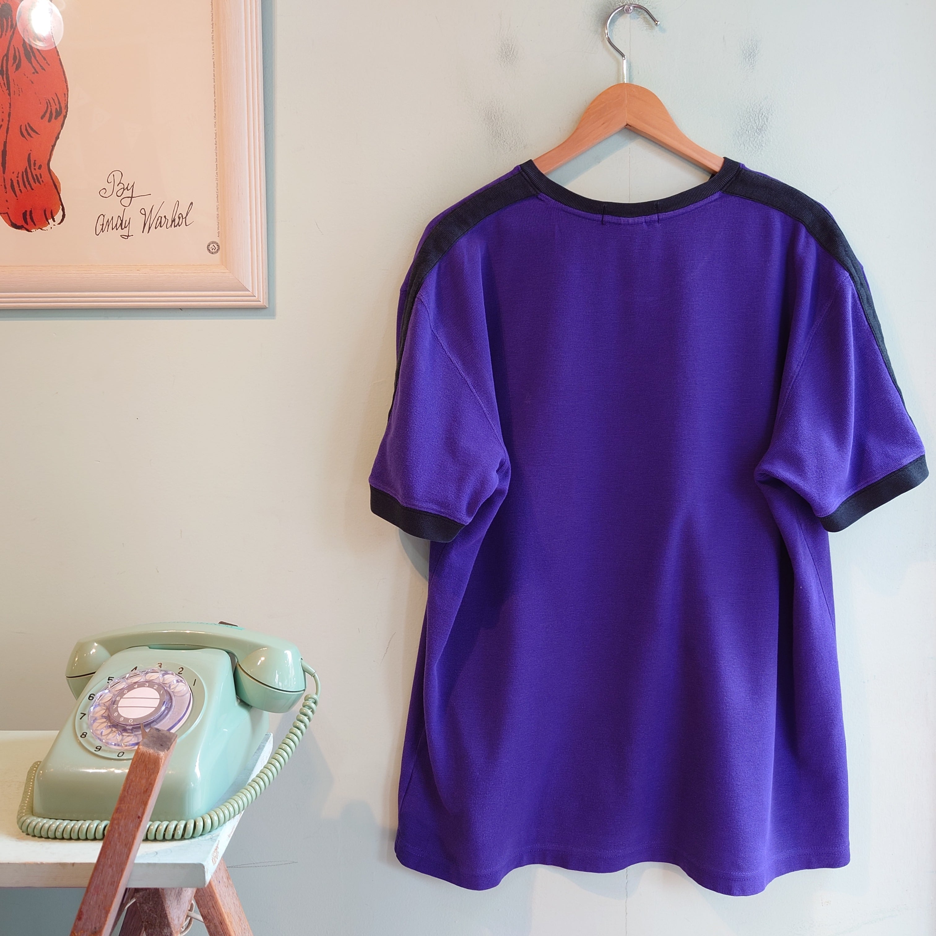 ラルフローレンのショルダーラインTシャツ。スポーティーな袖の切り替え、リンガー、フットボールTシャツのような襟が、鹿の子系素材に乗った超レアタイプ。鹿の子素材はポロシャツよりもサラッとした生地感で涼しさ良し。かぶらないラルフローレンをお探しのお客様へ。