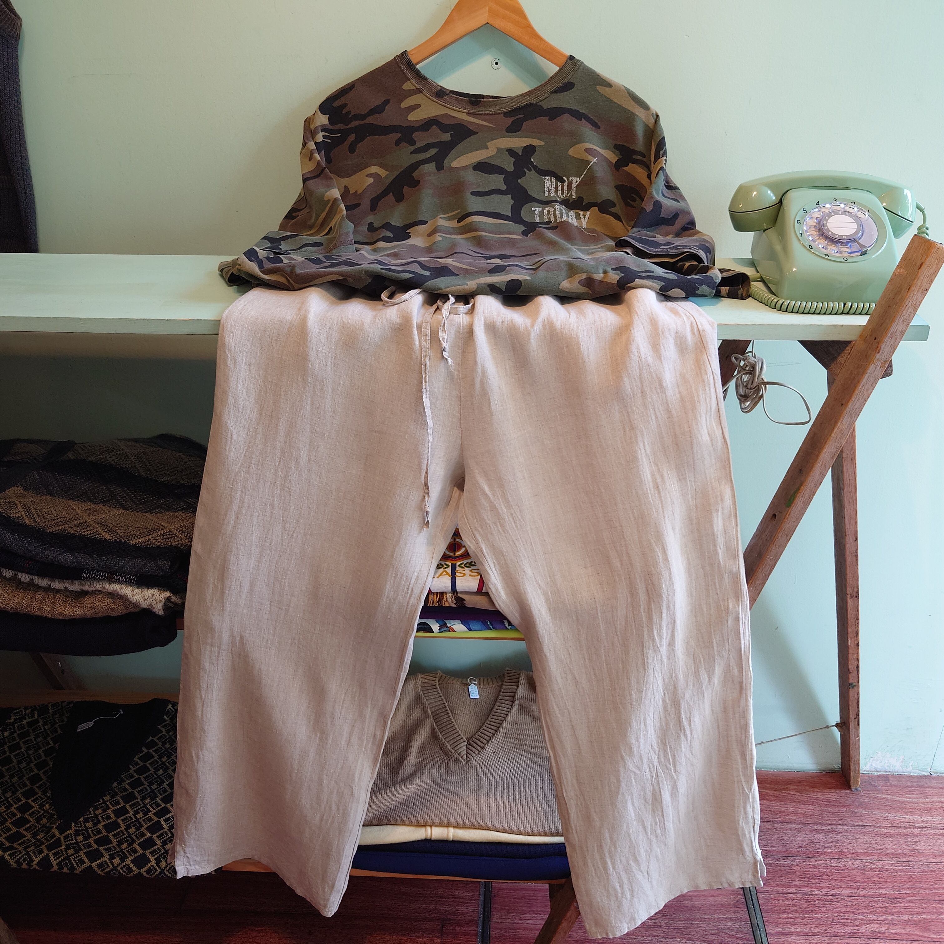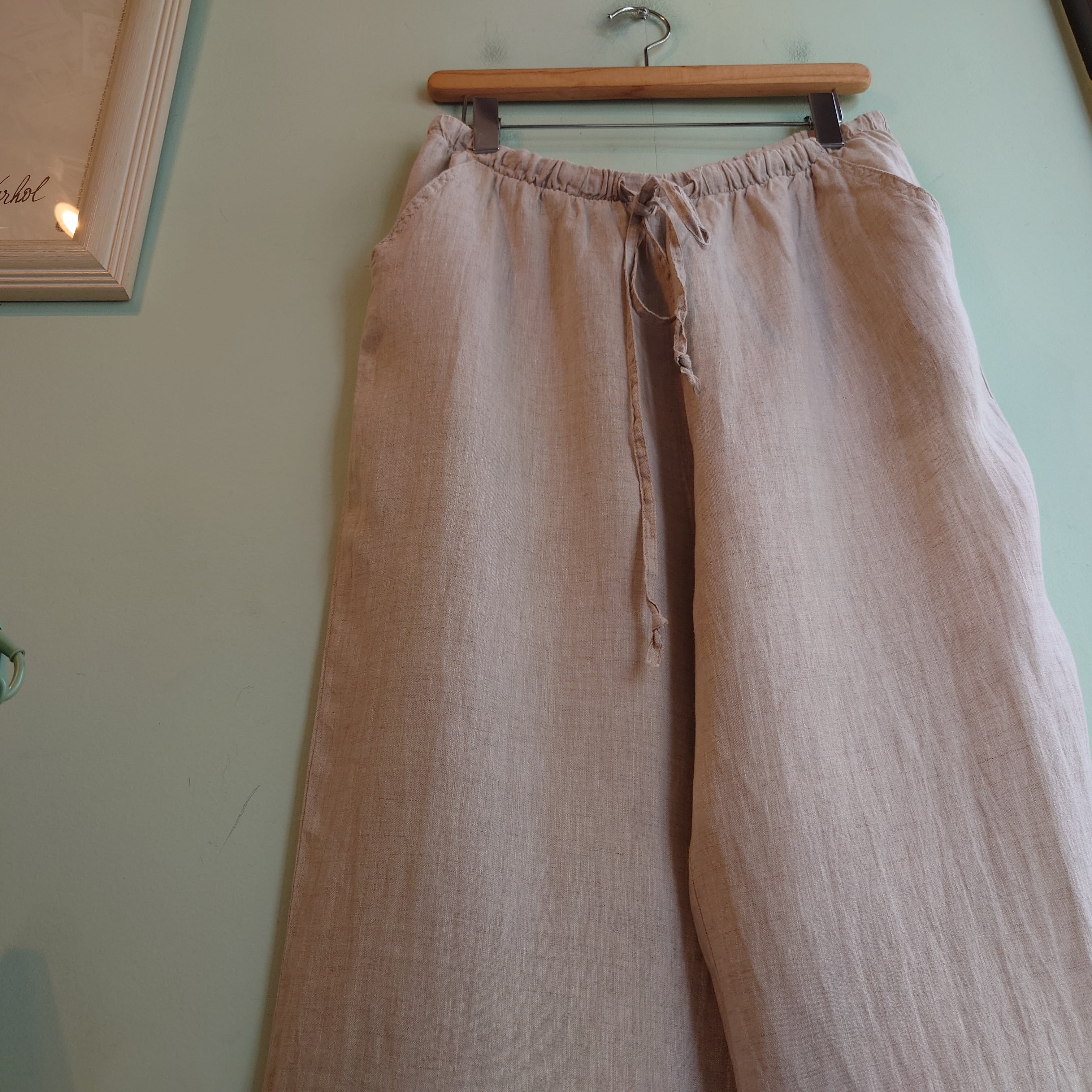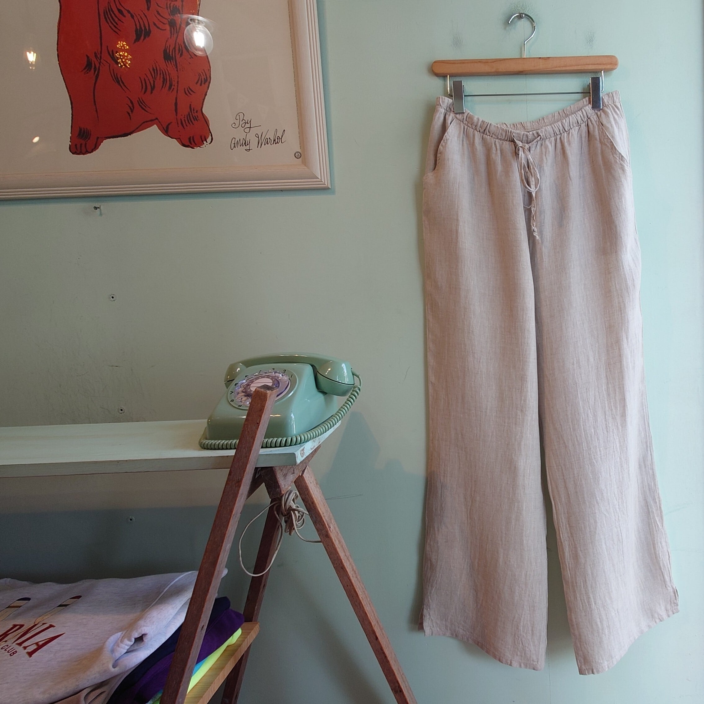 米高級ブティック、Sashayのリネンイージーパンツ。レディースXLサイズでメンズにも◎、ワイドにストンと落ちるシルエット、リネン100%らしいとろみ強めがかわいい。非常に上品なタッチで、リゾートライクな雰囲気からちゃんとしたシーンまで使える一本。