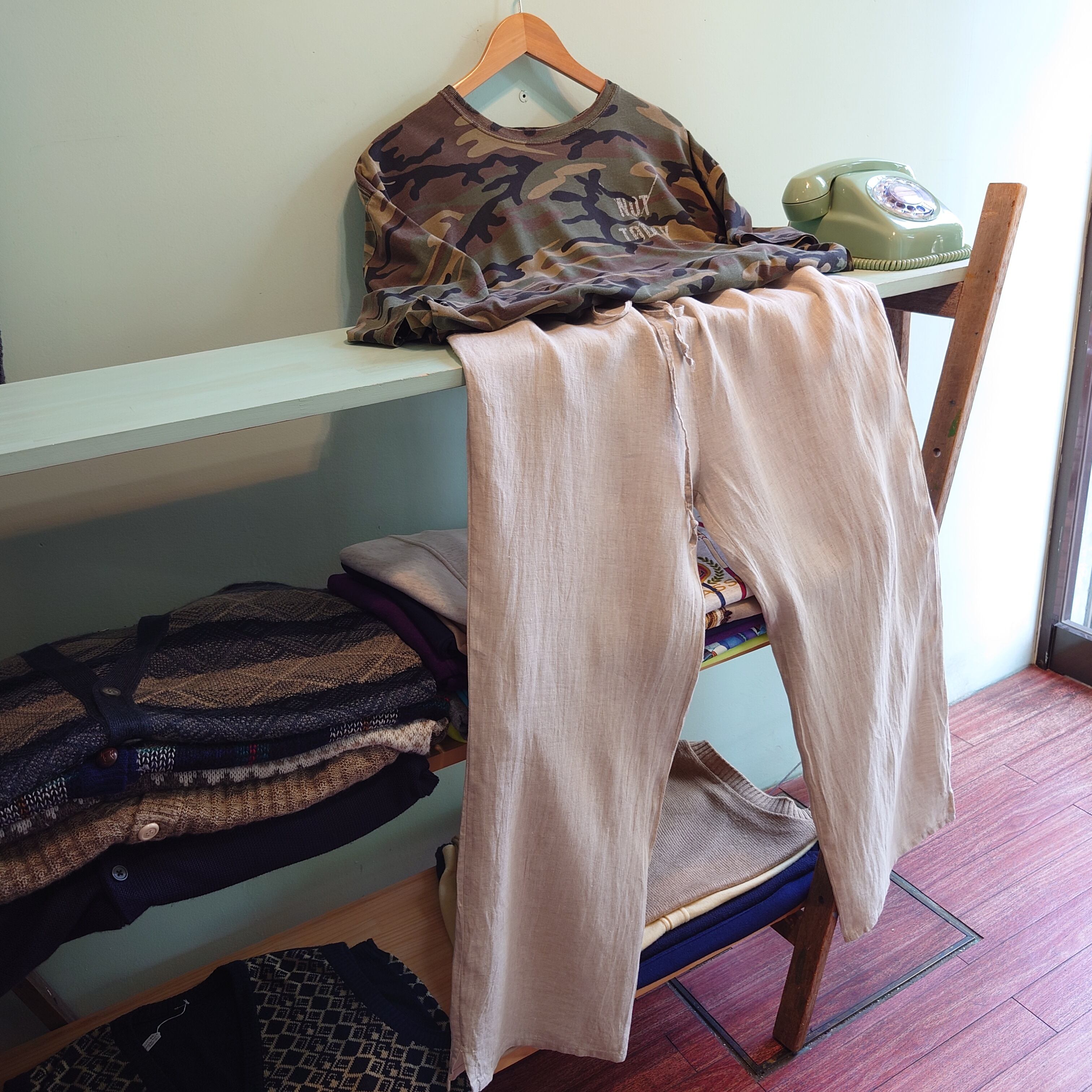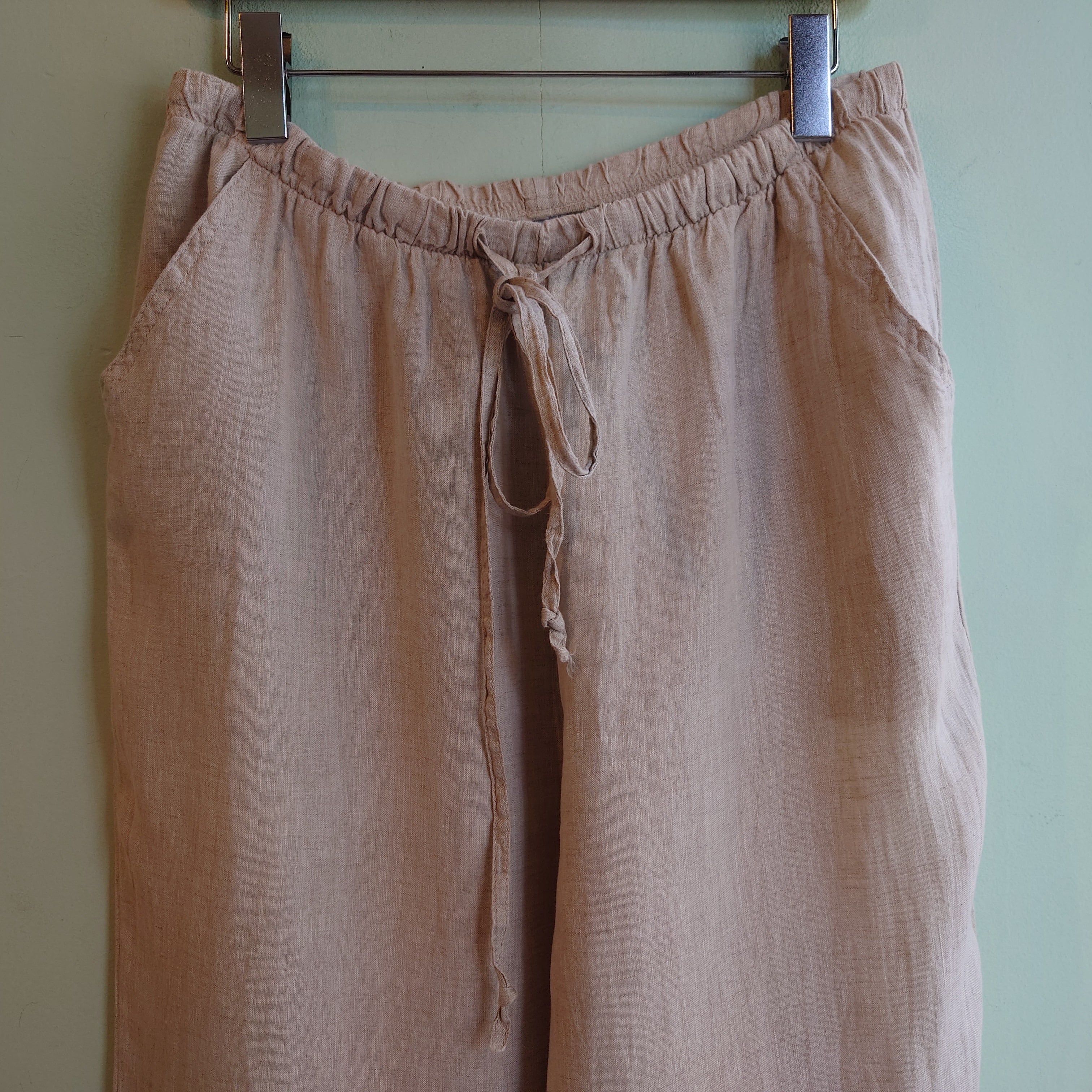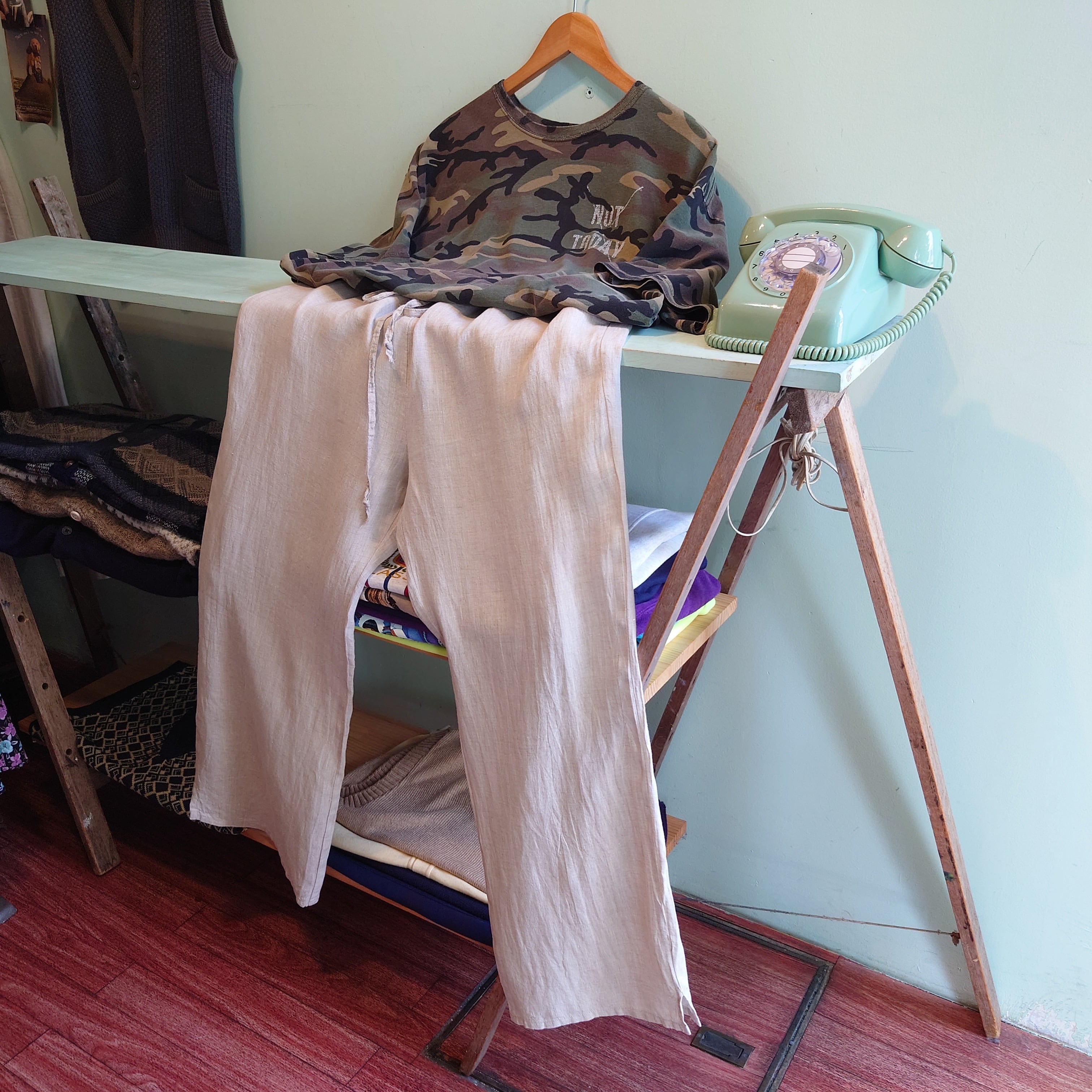 米高級ブティック、Sashayのリネンイージーパンツ。レディースXLサイズでメンズにも◎、ワイドにストンと落ちるシルエット、リネン100%らしいとろみ強めがかわいい。非常に上品なタッチで、リゾートライクな雰囲気からちゃんとしたシーンまで使える一本。