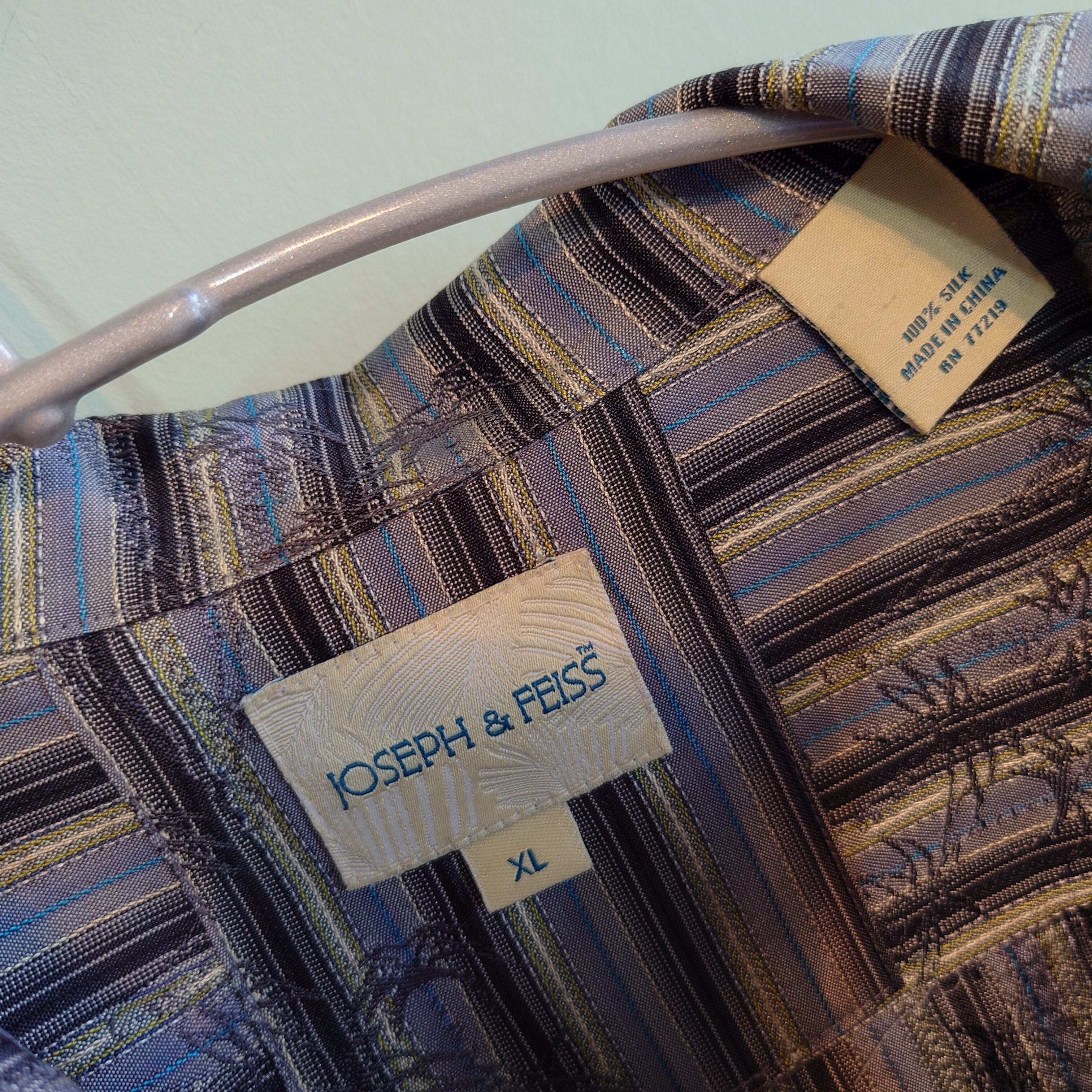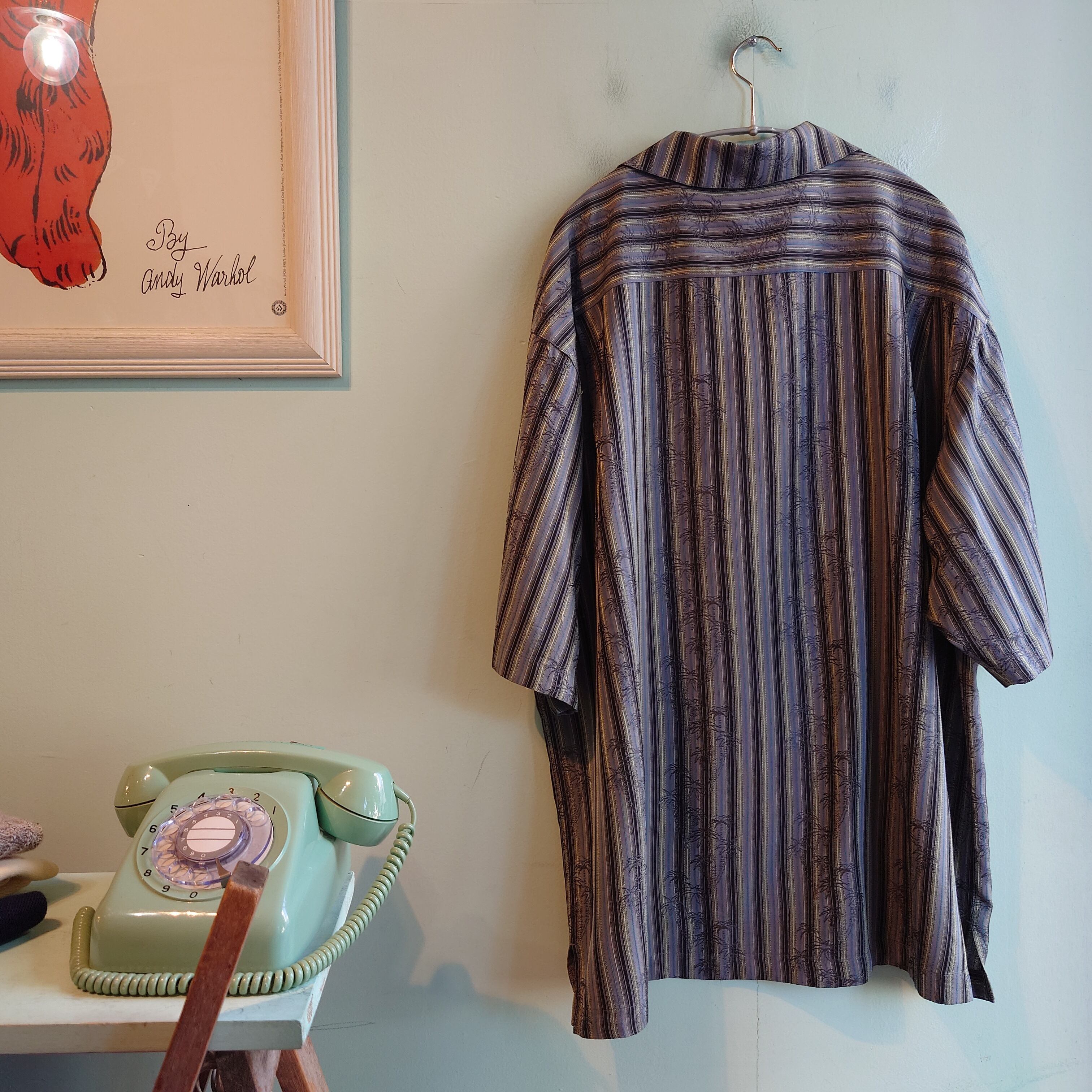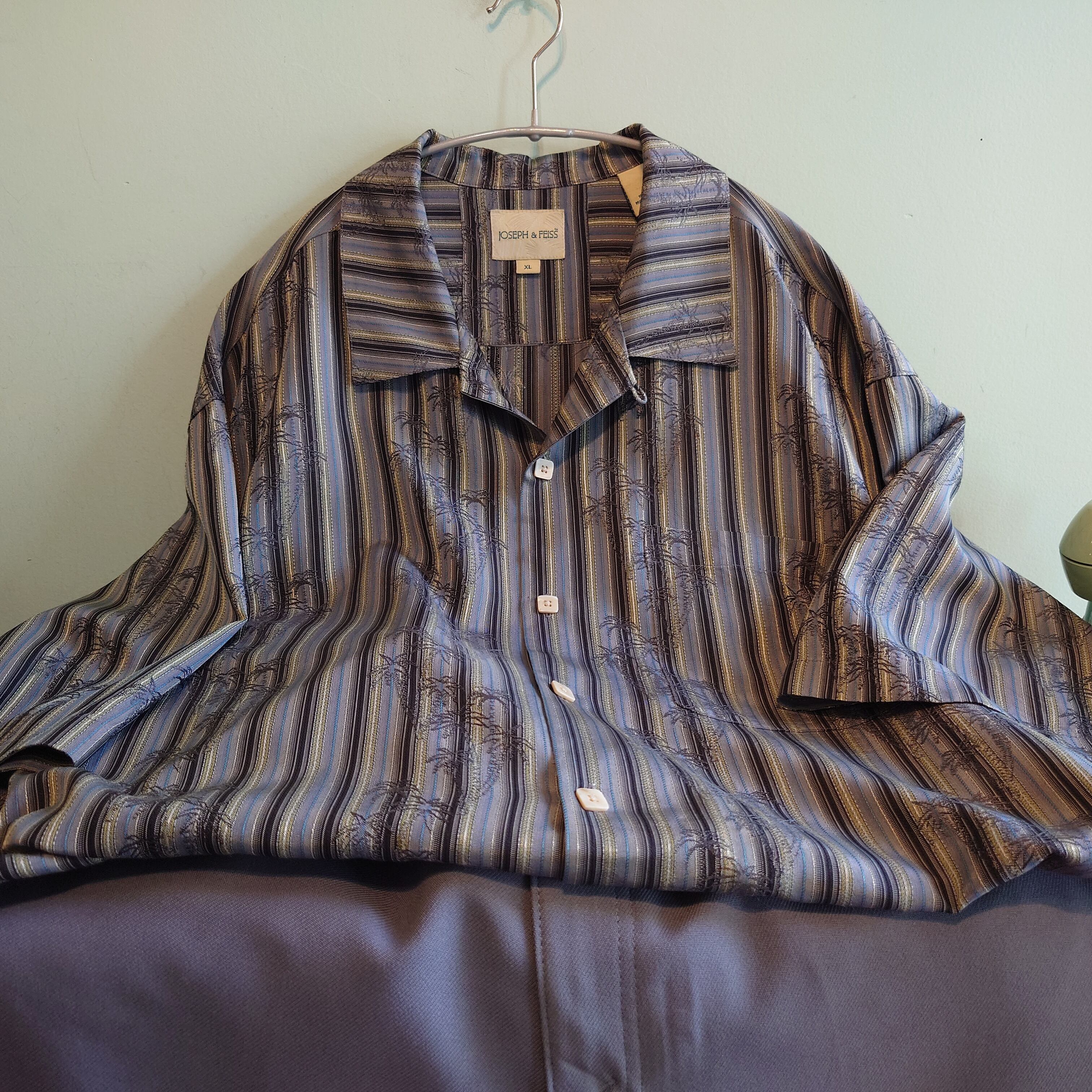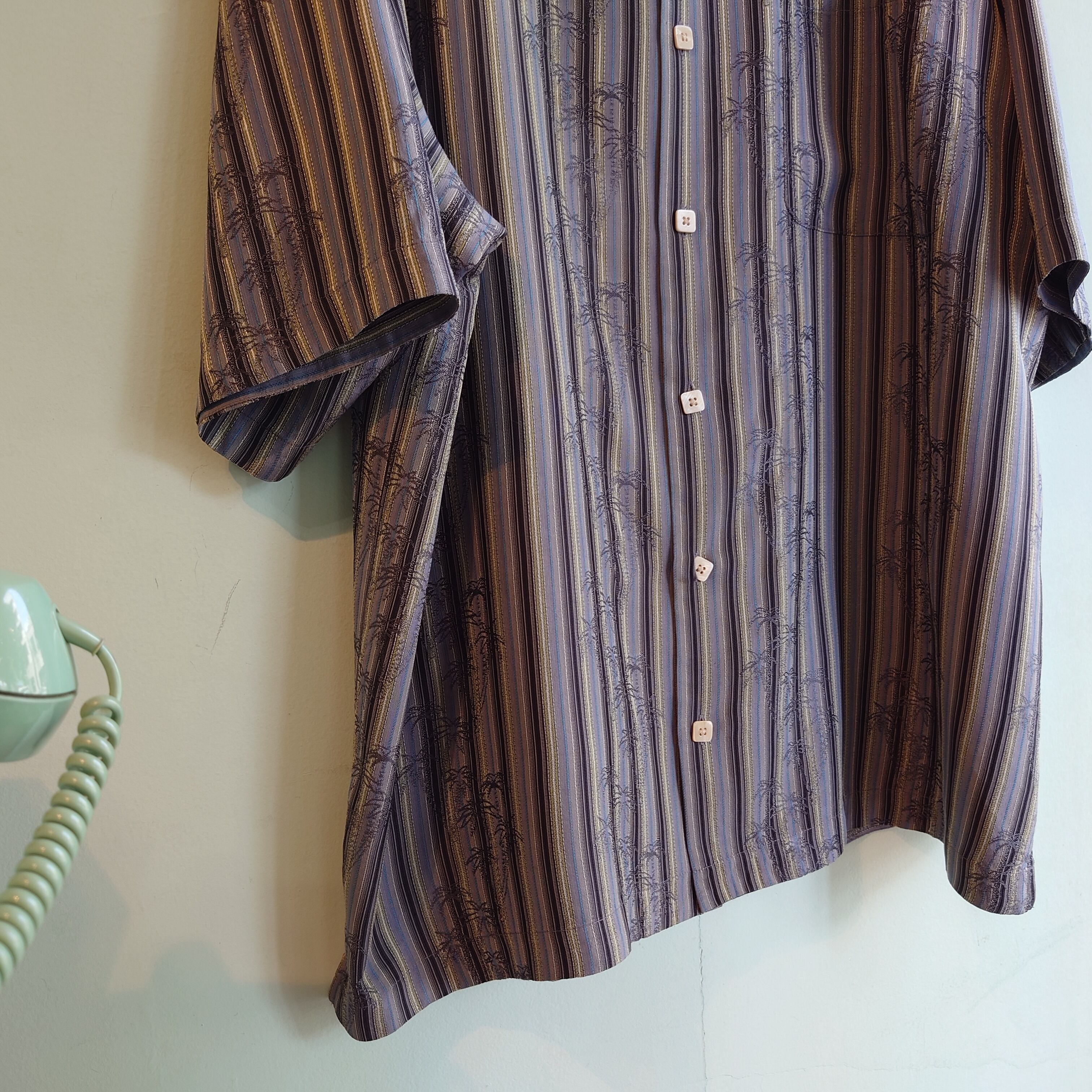 名門、Joseph & Feissの総柄シルクシャツ。ジャガードのように織り込まれたストライプ、総柄は、シンプルに見えて絶妙な糸目の作り込み。トロサラっとしたシルクの風合いで、シルエットと特別な動き感。王道ハワイアン系とは一味違う個性が光る柄シャツです。