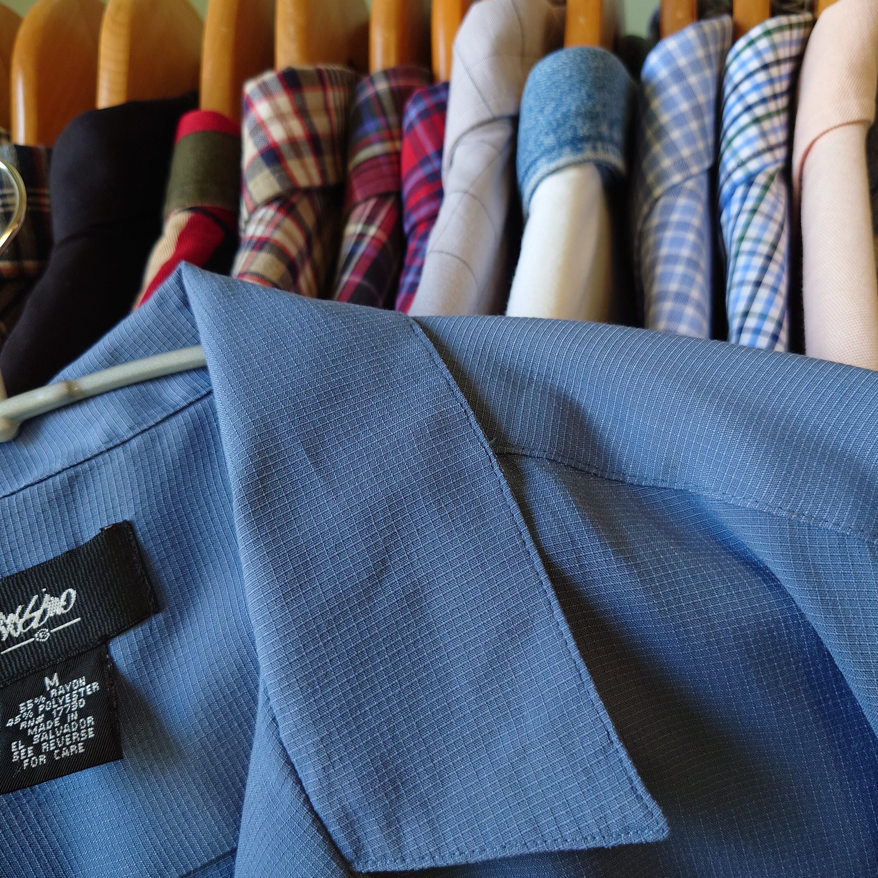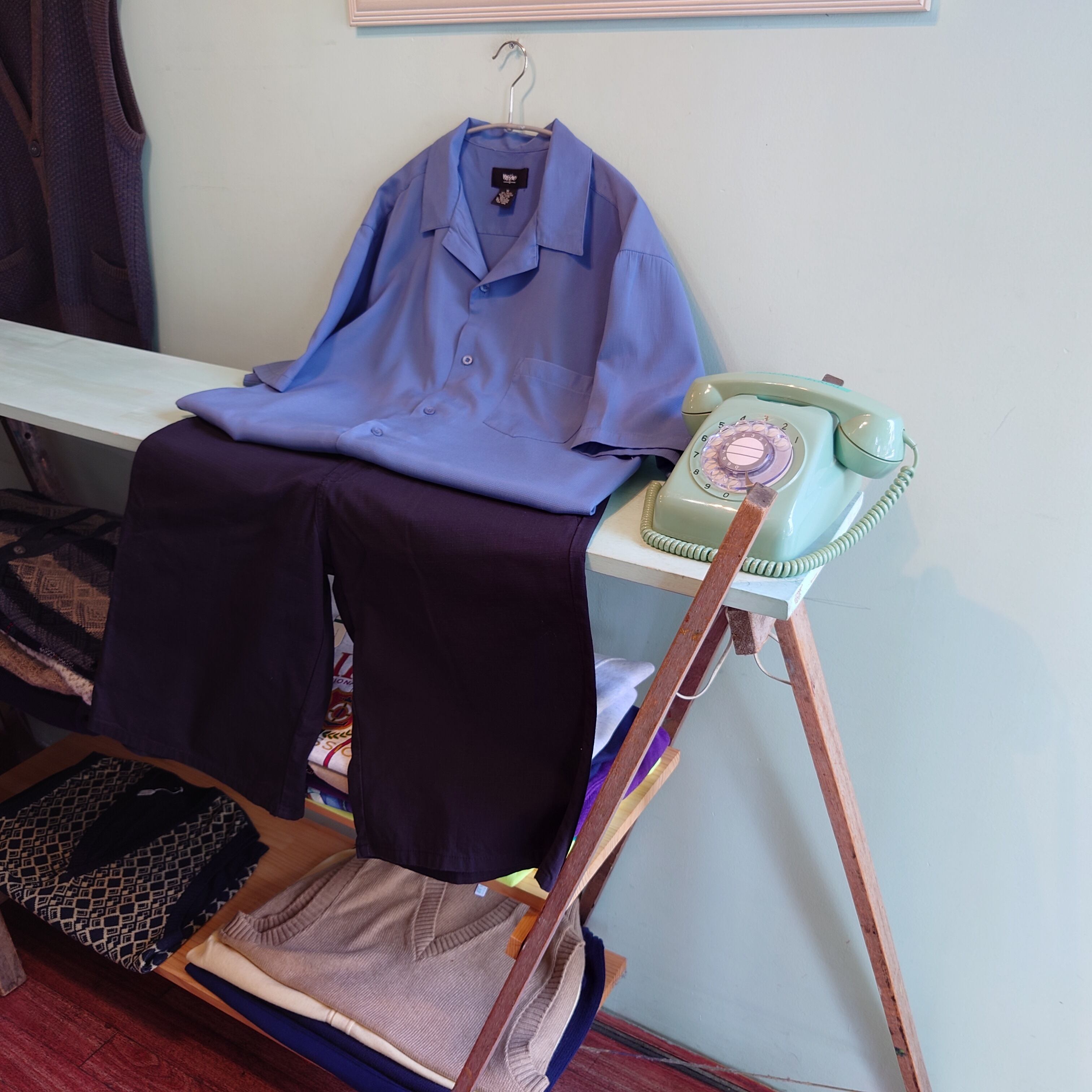 90-00sの人気ブランド、モッシモのドレスシャツ。スクエアーなシルエットと広すぎない開襟スタイル、くすんだブルーがシンプルにセンス良し。生地には格子状の模様付きで、ザラッっとしたタッチも夏らしい。
