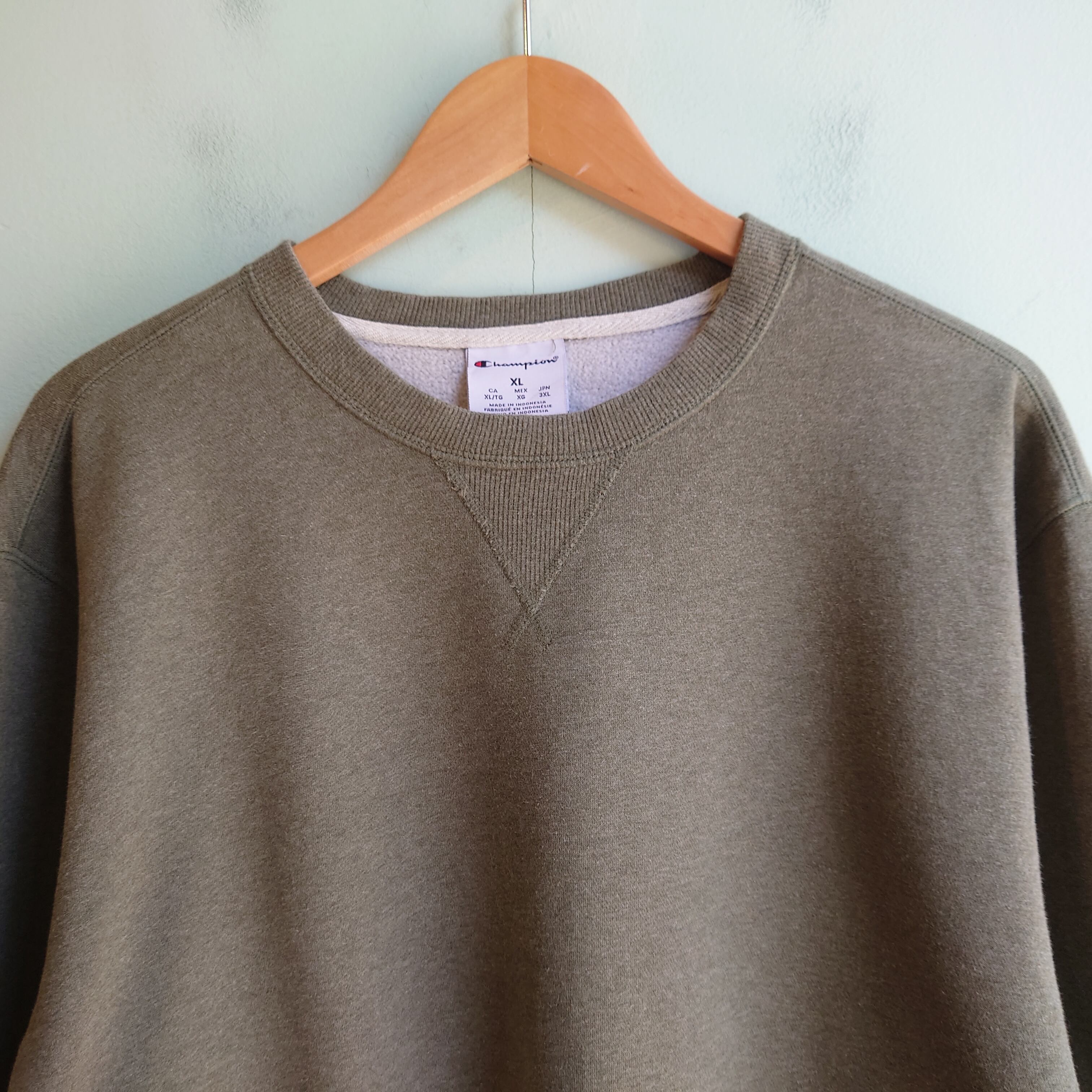 ★若草色に杢が入ったレトロで春らしい色味が絶妙なChampionスウェット。丸さよりもストンとしたシルエットに、ガゼット、裾タグのアクセントがこだわり系。