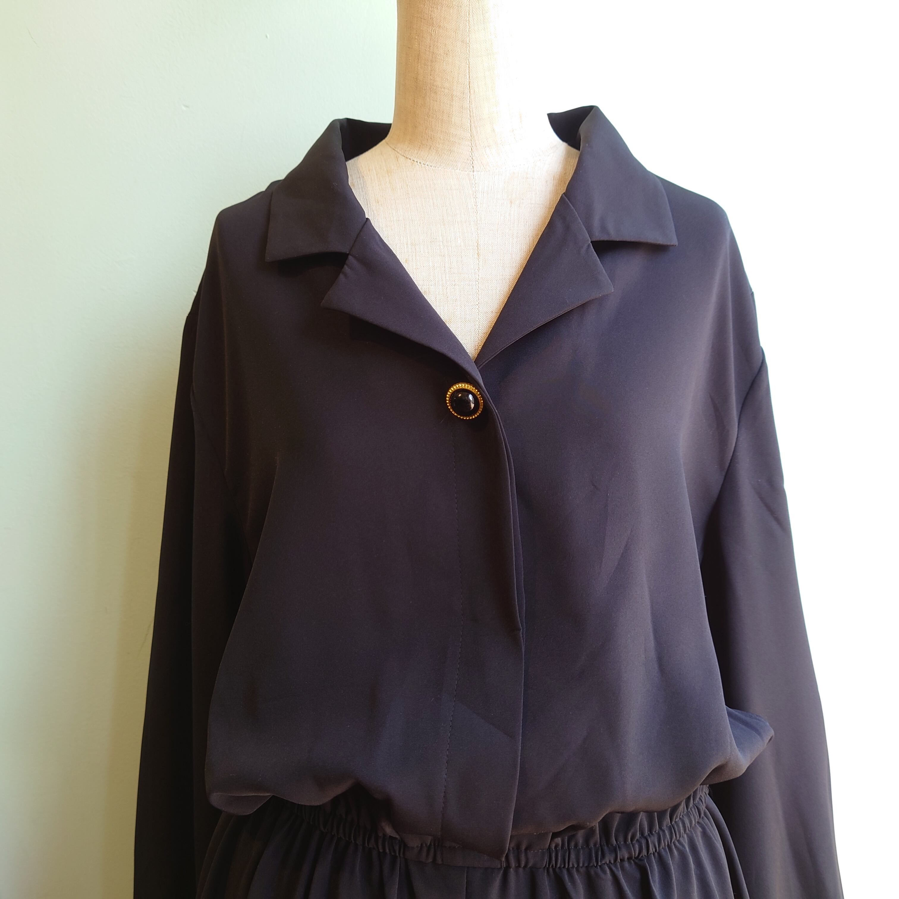 ★テロっと薄手素材の黒ワンピース。シンプルなデザインの中に宝石のようなボタンのアクセントつき。古着らしくゆったりレトロなシルエットと、ひらひら感が春らしい一枚。