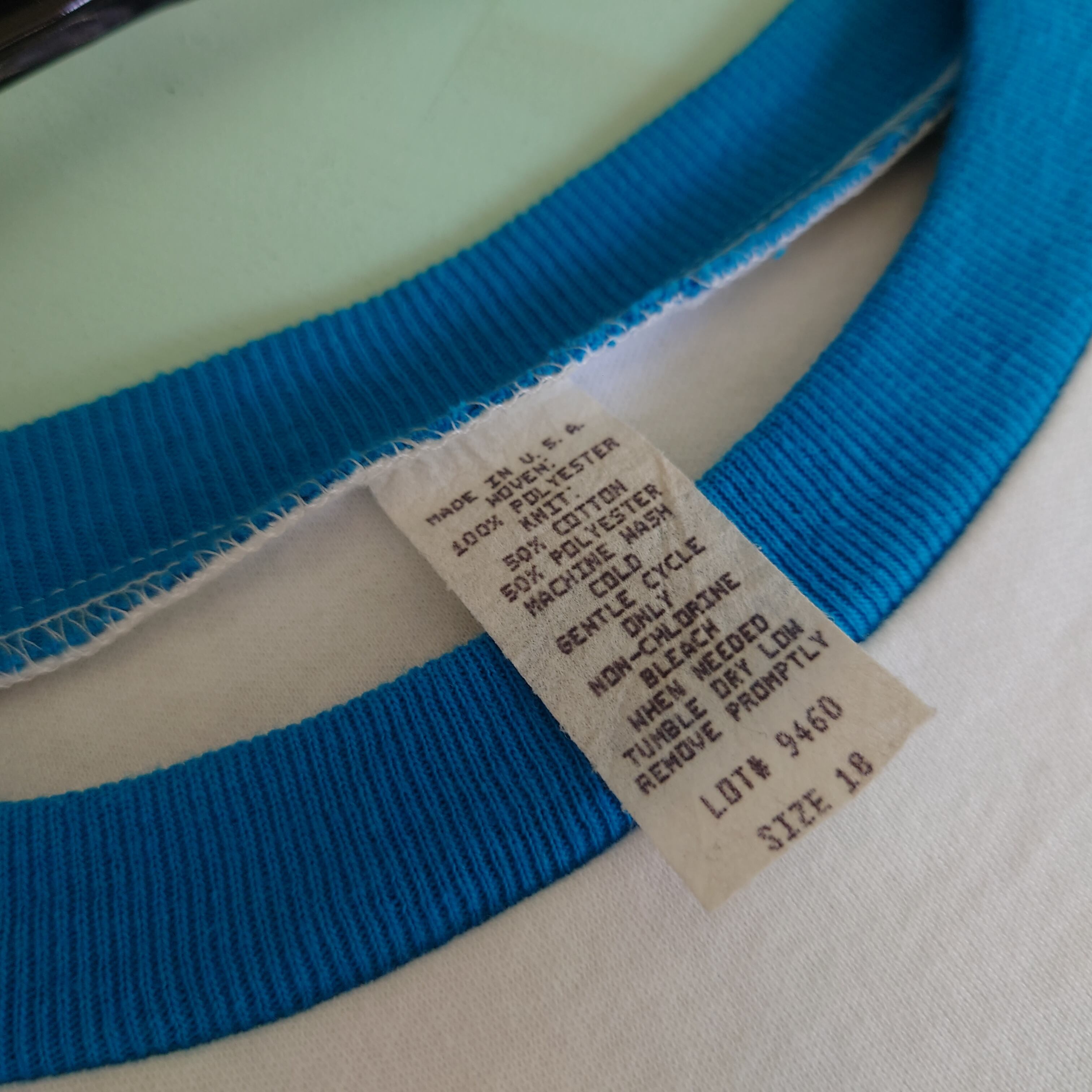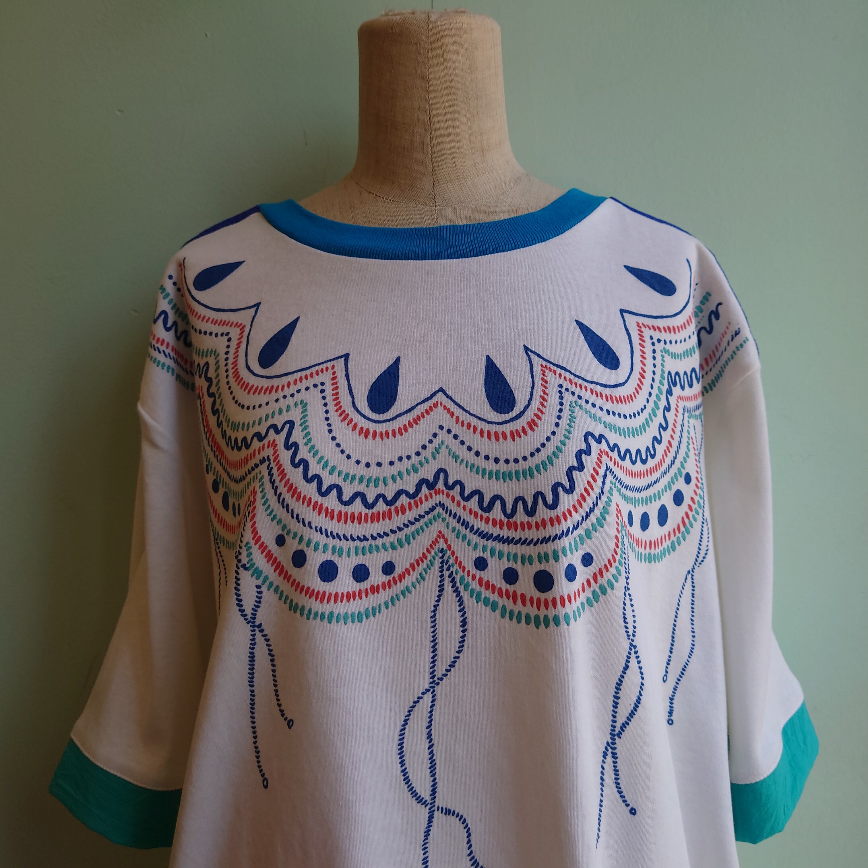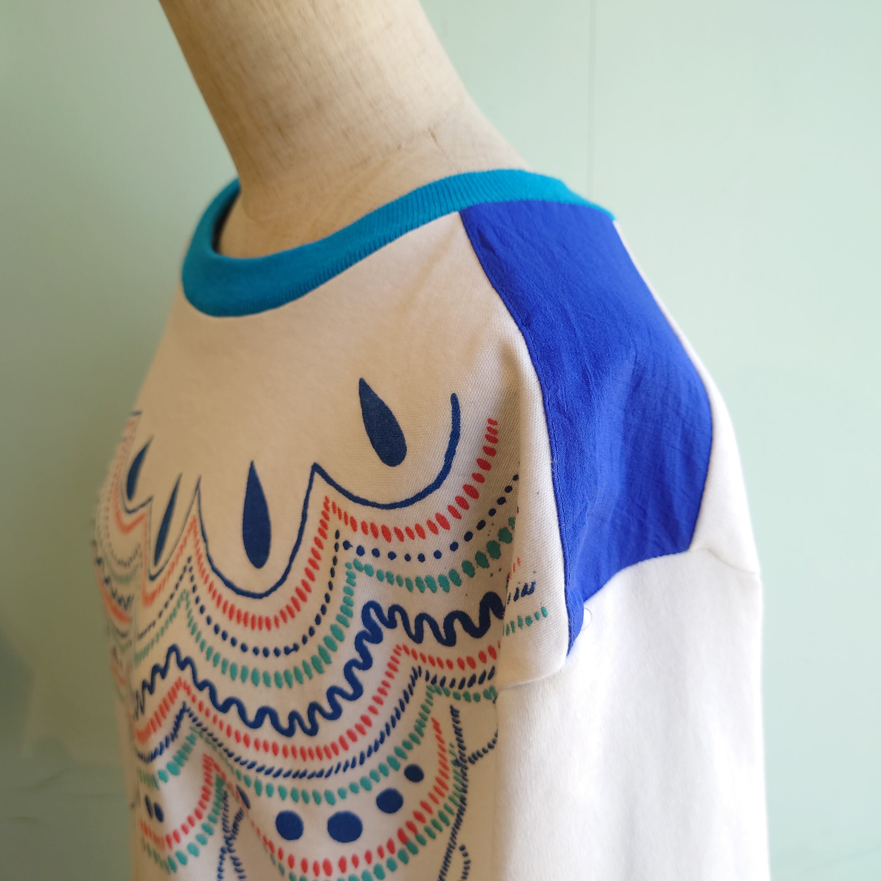 ★80sヴィンテージのデコレーションTシャツ。サテンのパーツが足された個性派トップス。ネイティブ柄にもケーキ柄にも見える、独創的なプリントもかわいすぎる。Tシャツとブラウスの融合的一枚。