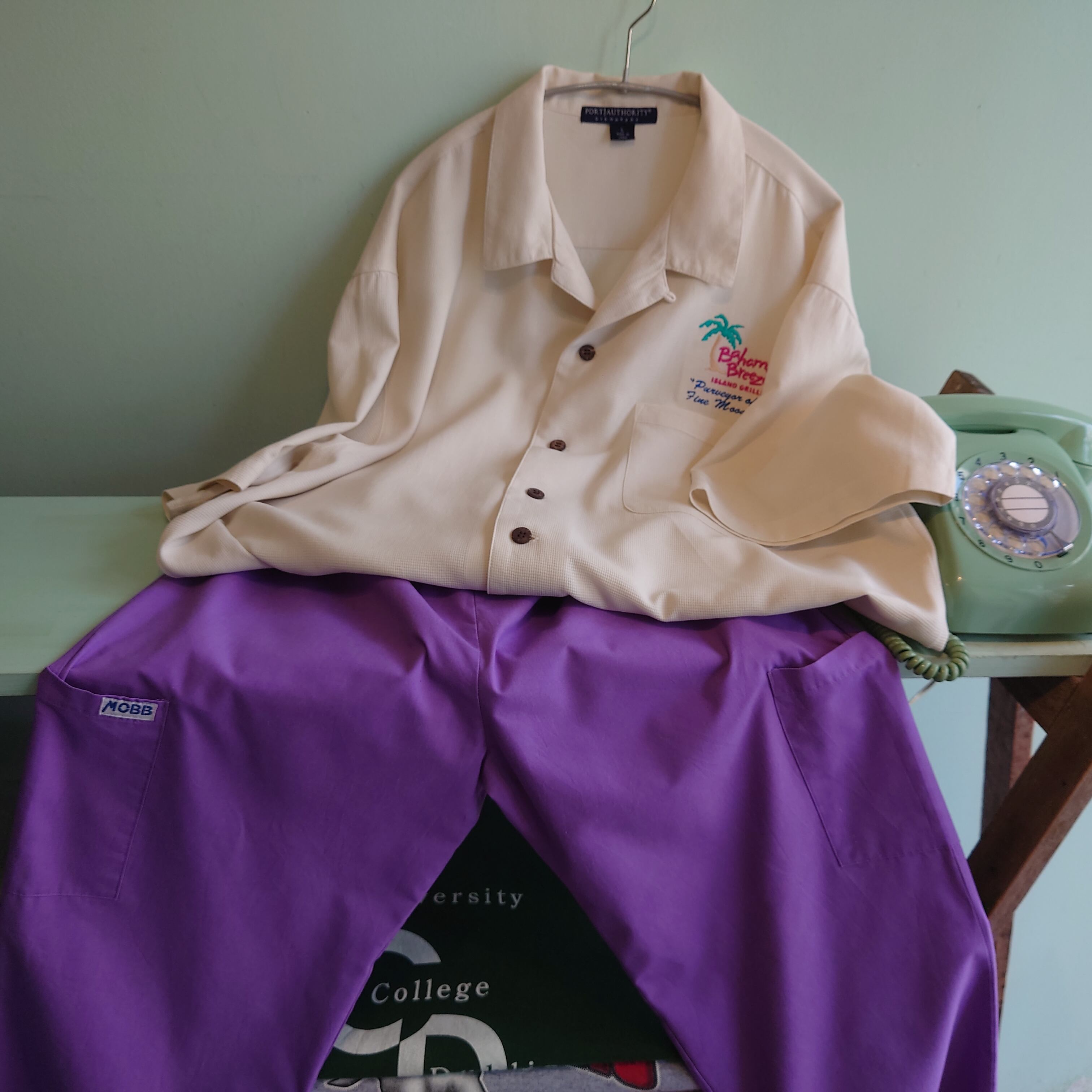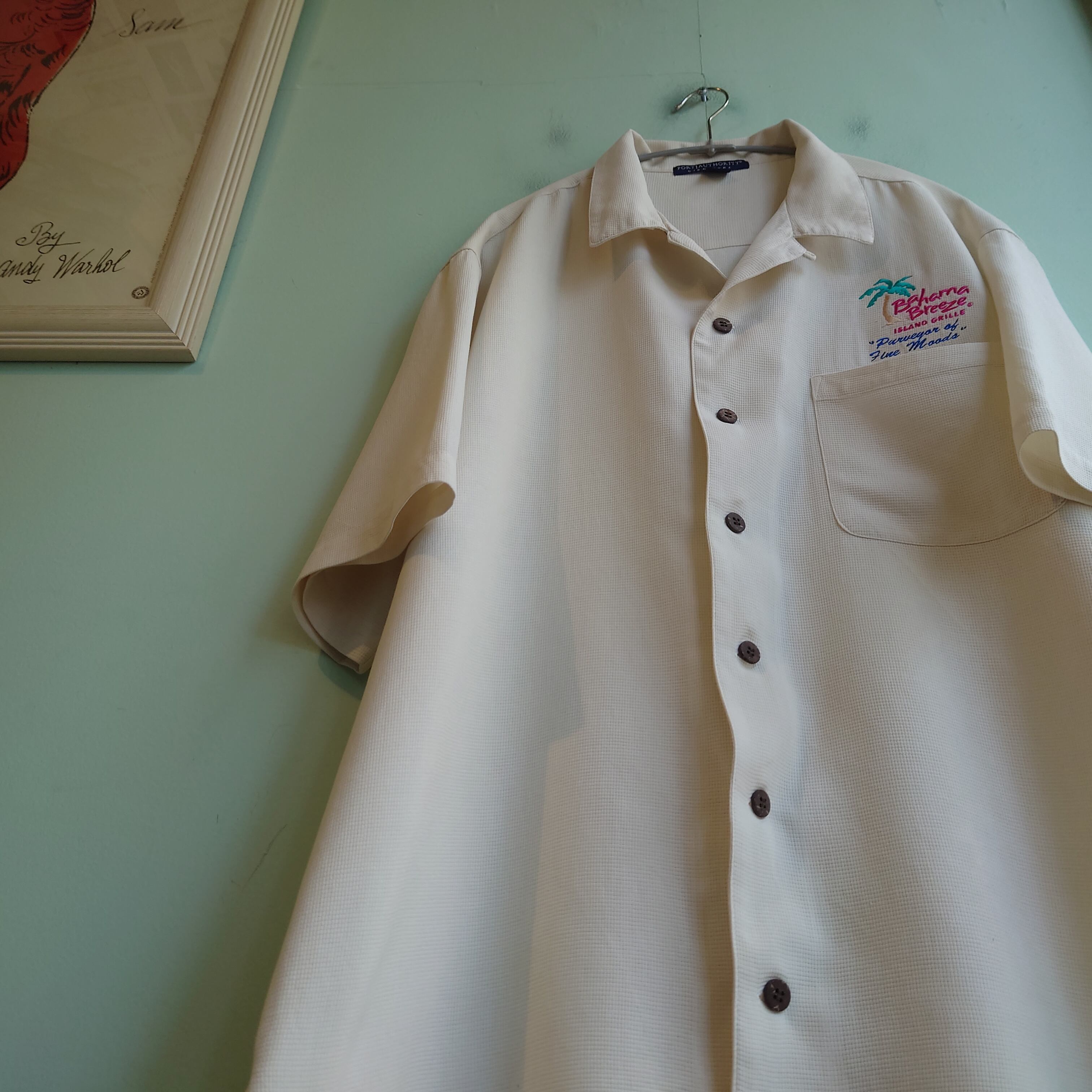 ★オーランドに実在するカリブ料理レストランのユニフォームシャツ。オープンカラーのシルクシャツに、トロピカルなロゴが激しくかわいい一枚。テロっと崩れる生地感と、オーバーサイズすぎないきれいめなシルエットもいい。