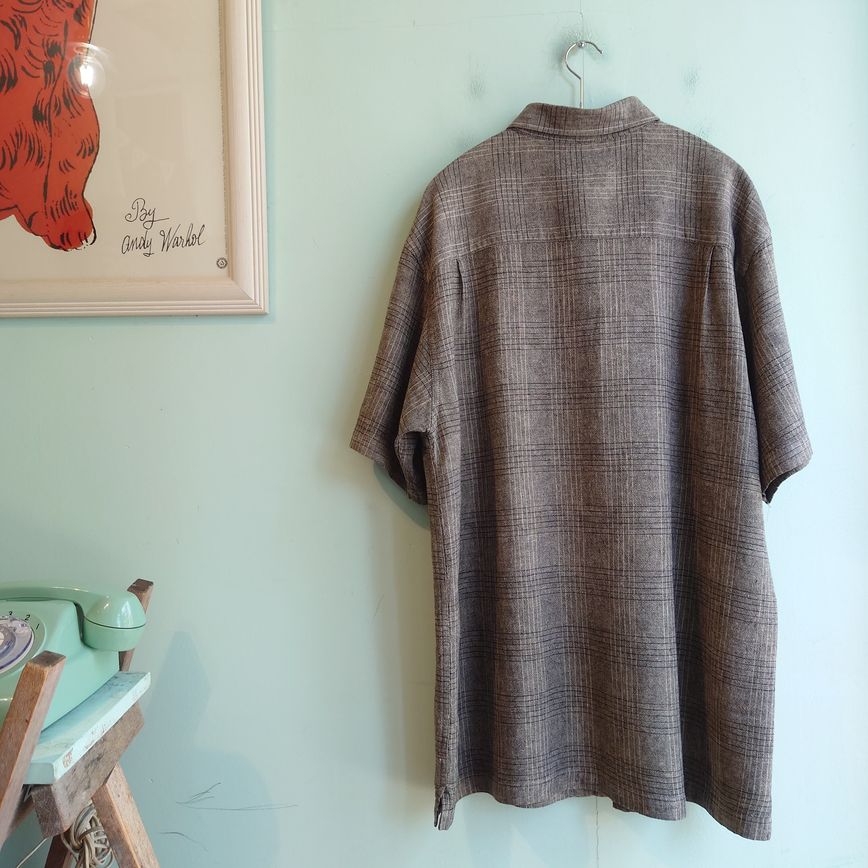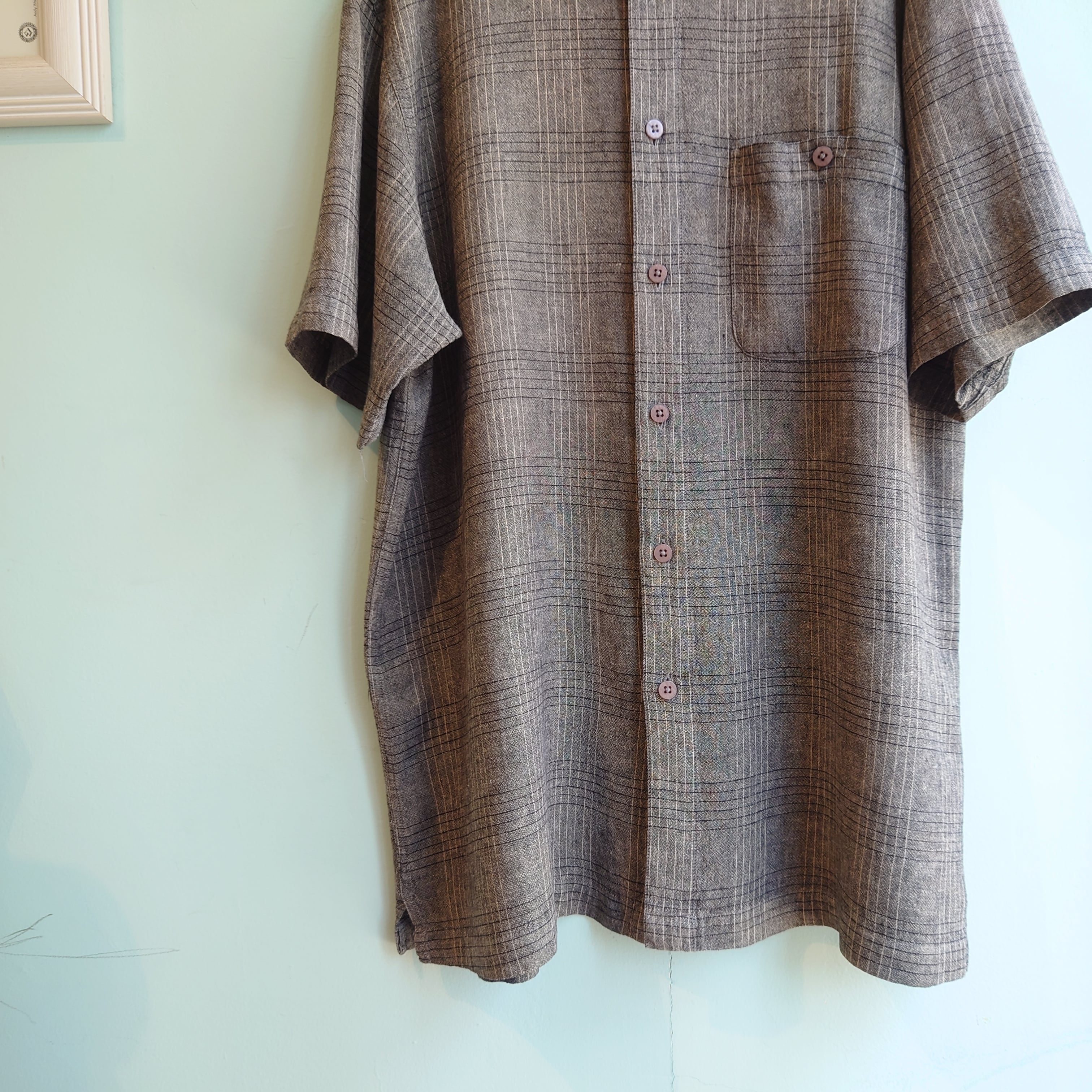 ★グレーをベースにくすんだ色合いのチェックが渋い、リネンライク素材のドレスシャツ。テロっとザラッとしたとろみのある素材と、崩れるシルエットで、アメカジ系チェックとは一味違う、まさにドレッシーなチェックシャツ。