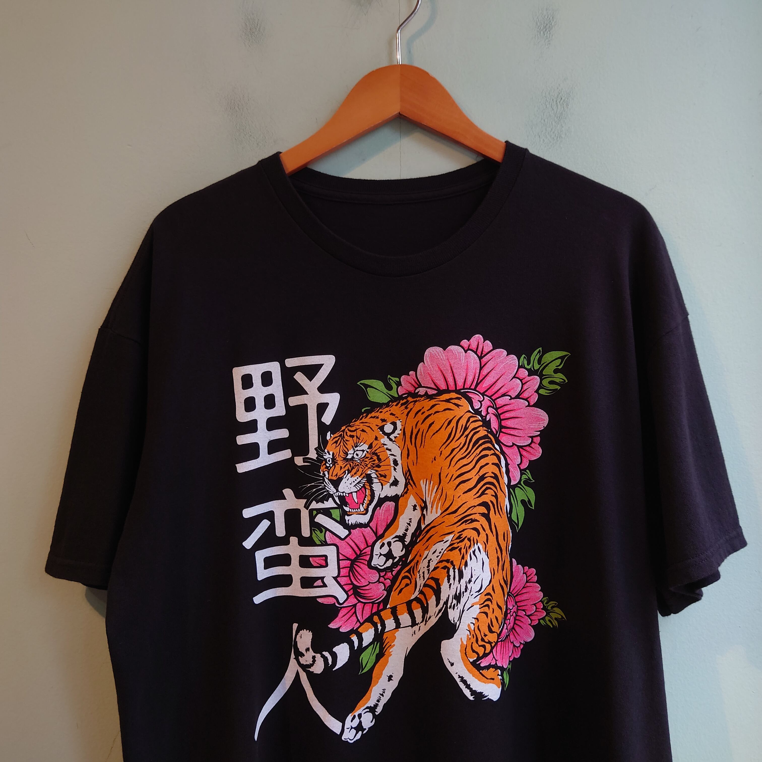 ★米国視点の"アジア感"が剥き出しでかわいい、ベンガルトラのグラフィックTシャツ。適当に当てたと思われる『野蛮人』のkanjiも雰囲気そのままのかっこよさ。