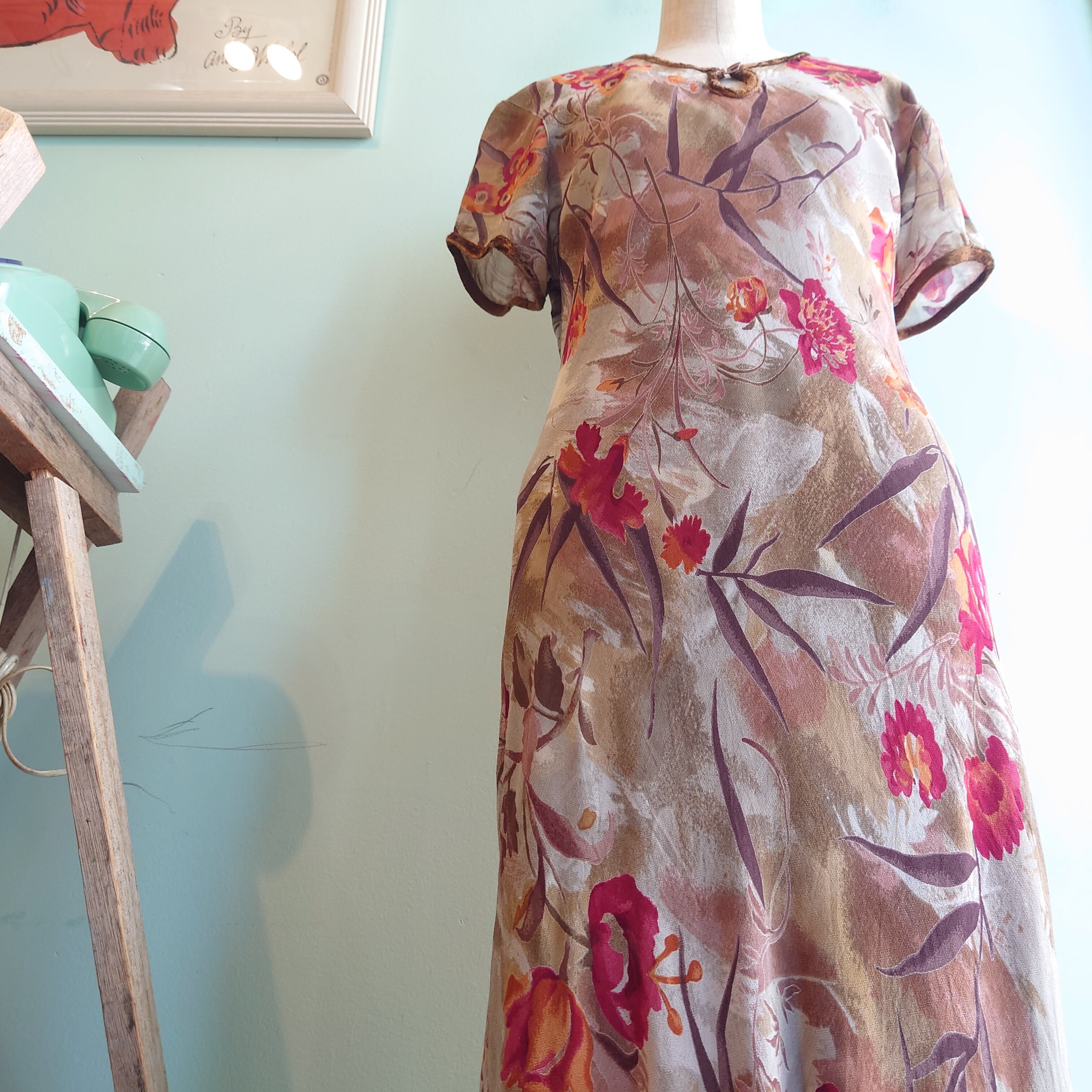 ★レーヨンのシアー素材に色褪せ感のあるある花柄総柄が美しいドレス。袖周りは裏地無しでドレッシー、ベロアの縁取りもかわいい。程よくタイトなシルエットで裾にかけてフレアがかかるドレッシーなシルエット。