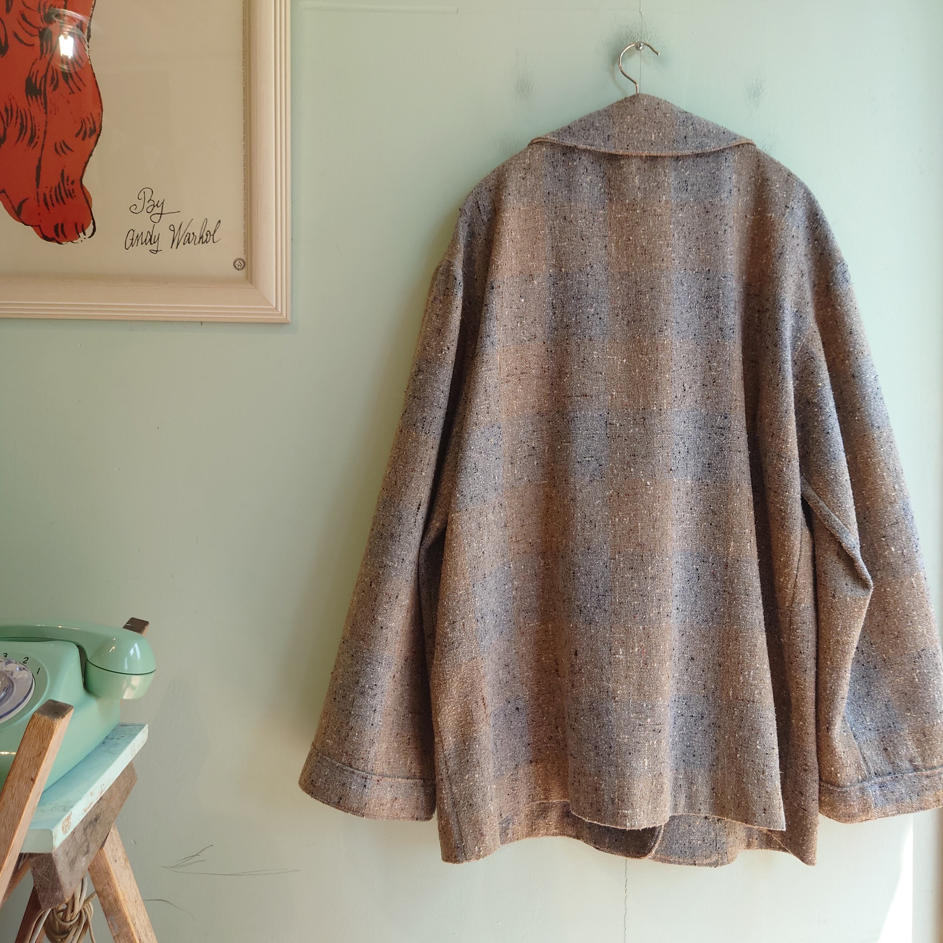 ★70-80年代のイージージャケット。テーラードジャケットをベースに、肩落ちするシャツ感覚のシルエット、ベージュグレーのバイカラーにケバケバネップ素材のレアタイプ。Tシャツやシャツにサラッと羽織るスタイルが素直に似合う一枚。