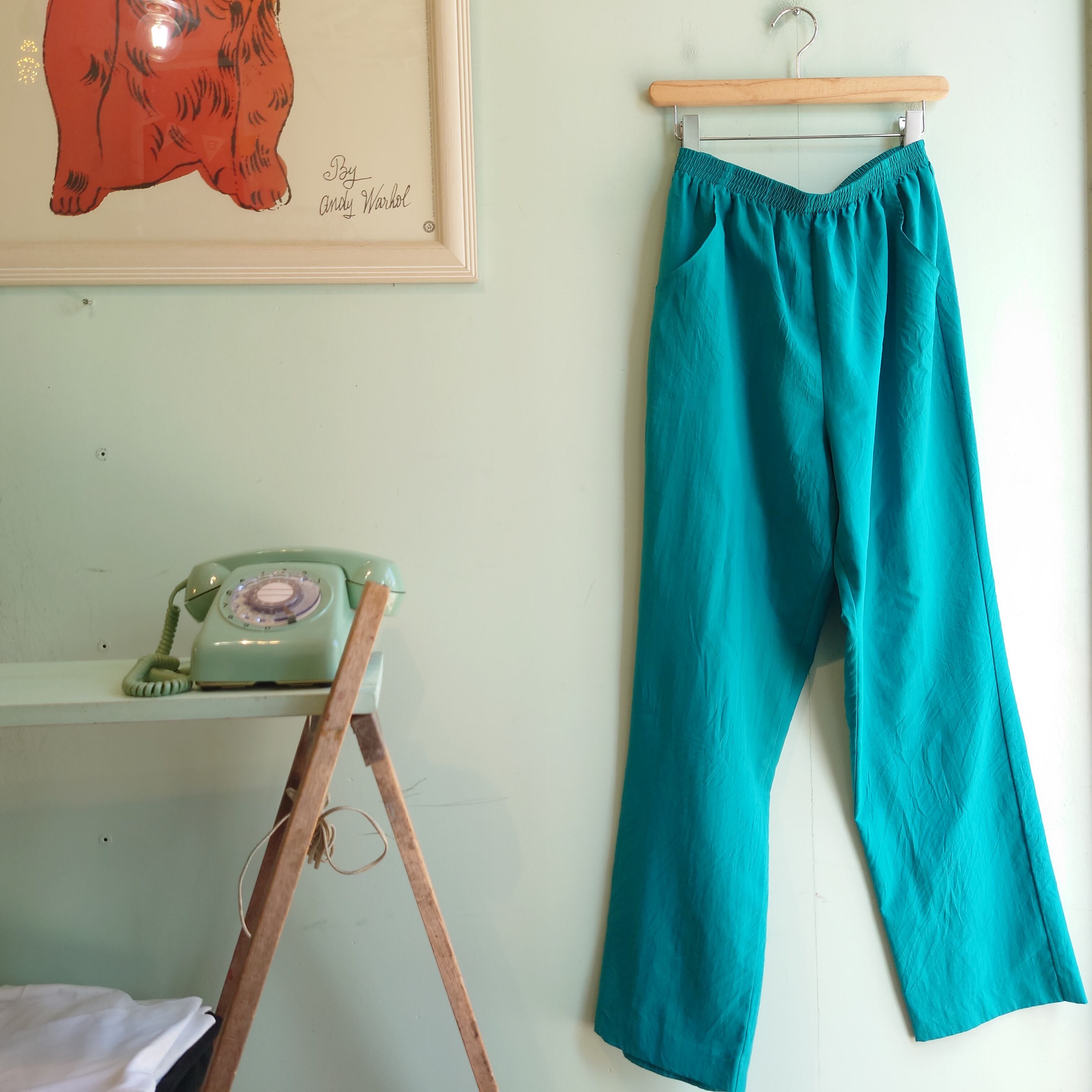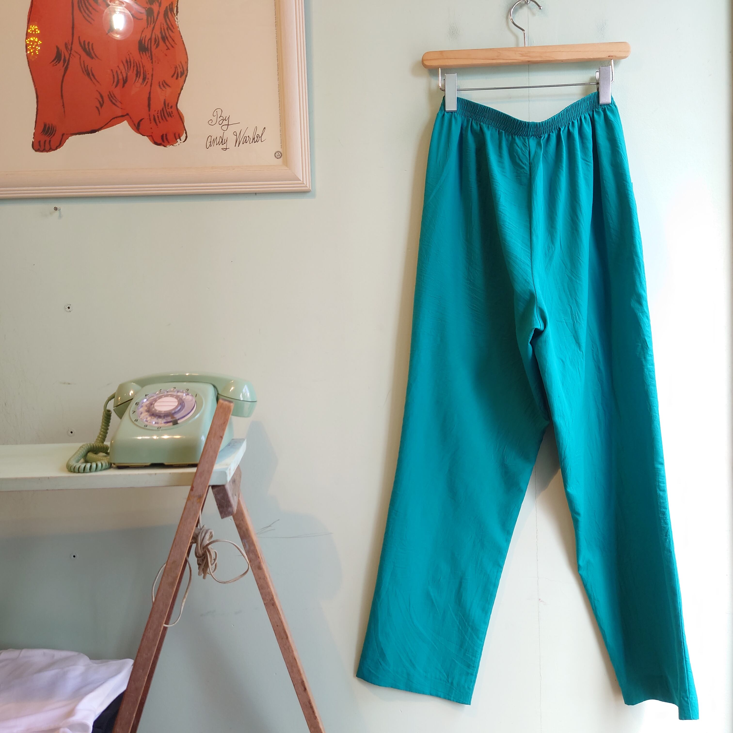 ★90svintage、絞り系、シワ加工のイージースラックス。テロっと薄手でドレスシャツのような素材、ダボッとしたテーパードシルエット。カラーパンツでありながら大人っぽく存在感のある一本。