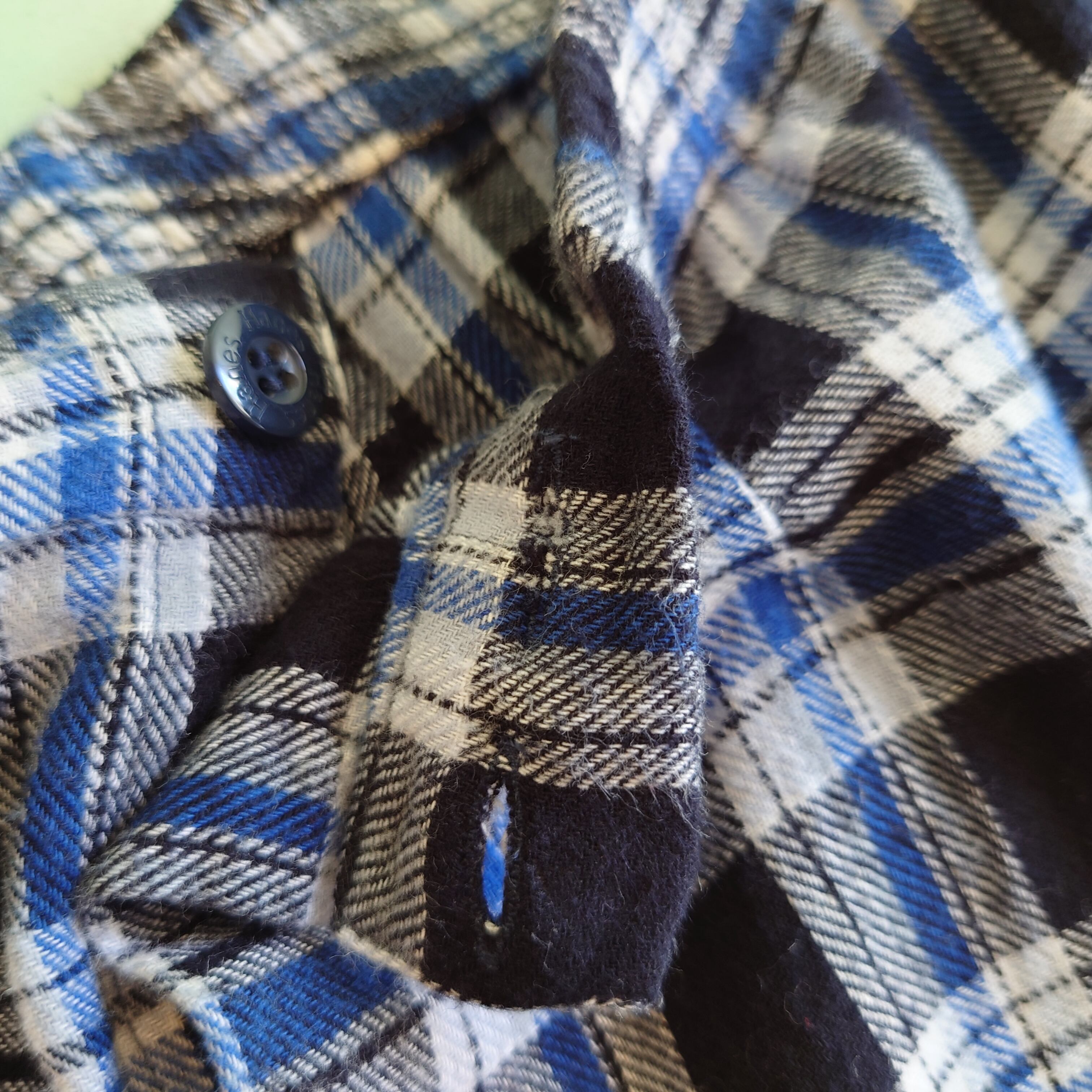 ★白黒チェックに青の差し色が爽やかなHanesのパジャマパンツ。ウエストは紐ではなくボタン2つで止めるタイプ。ワイド感ありつつスッキリ落ちるナイスなシルエット。