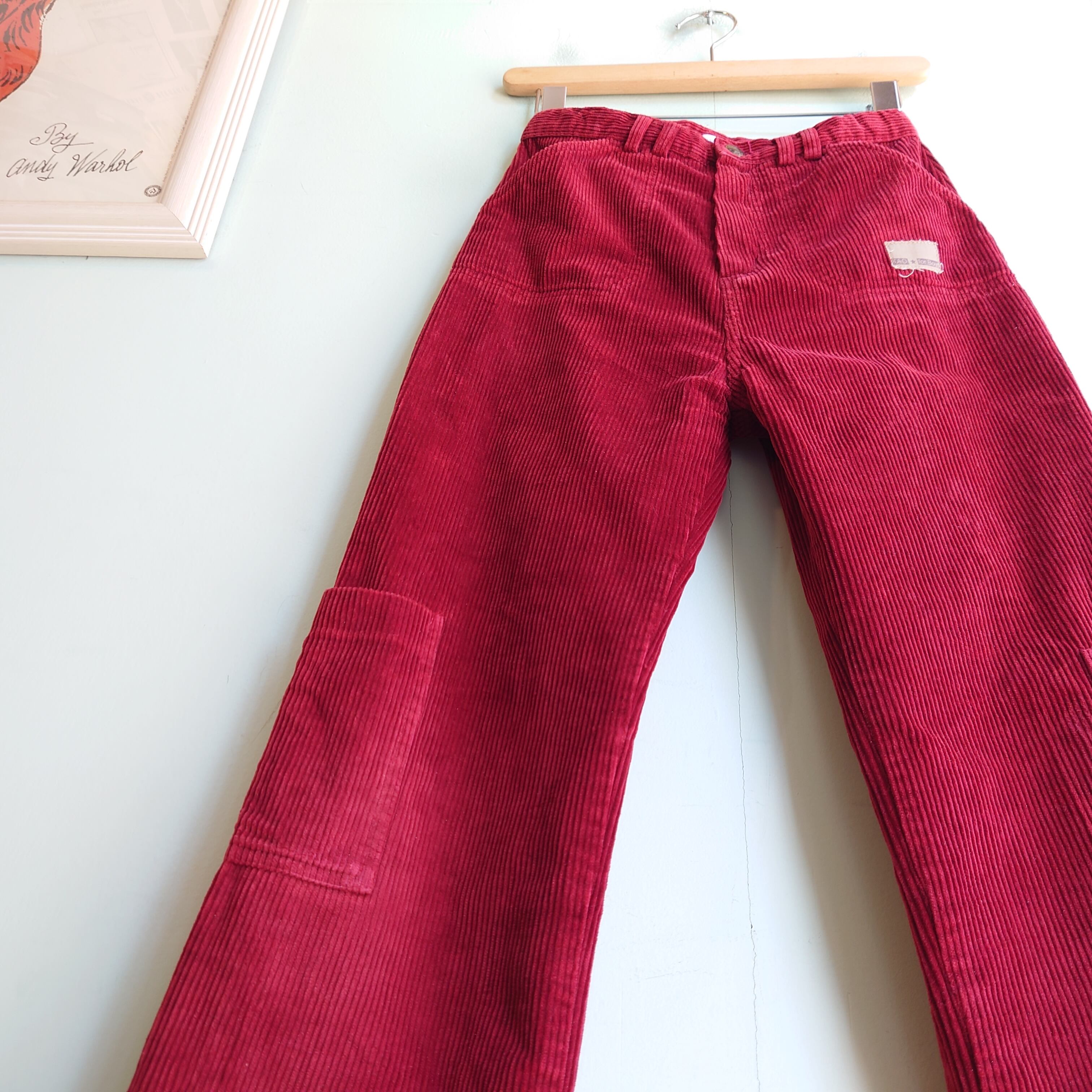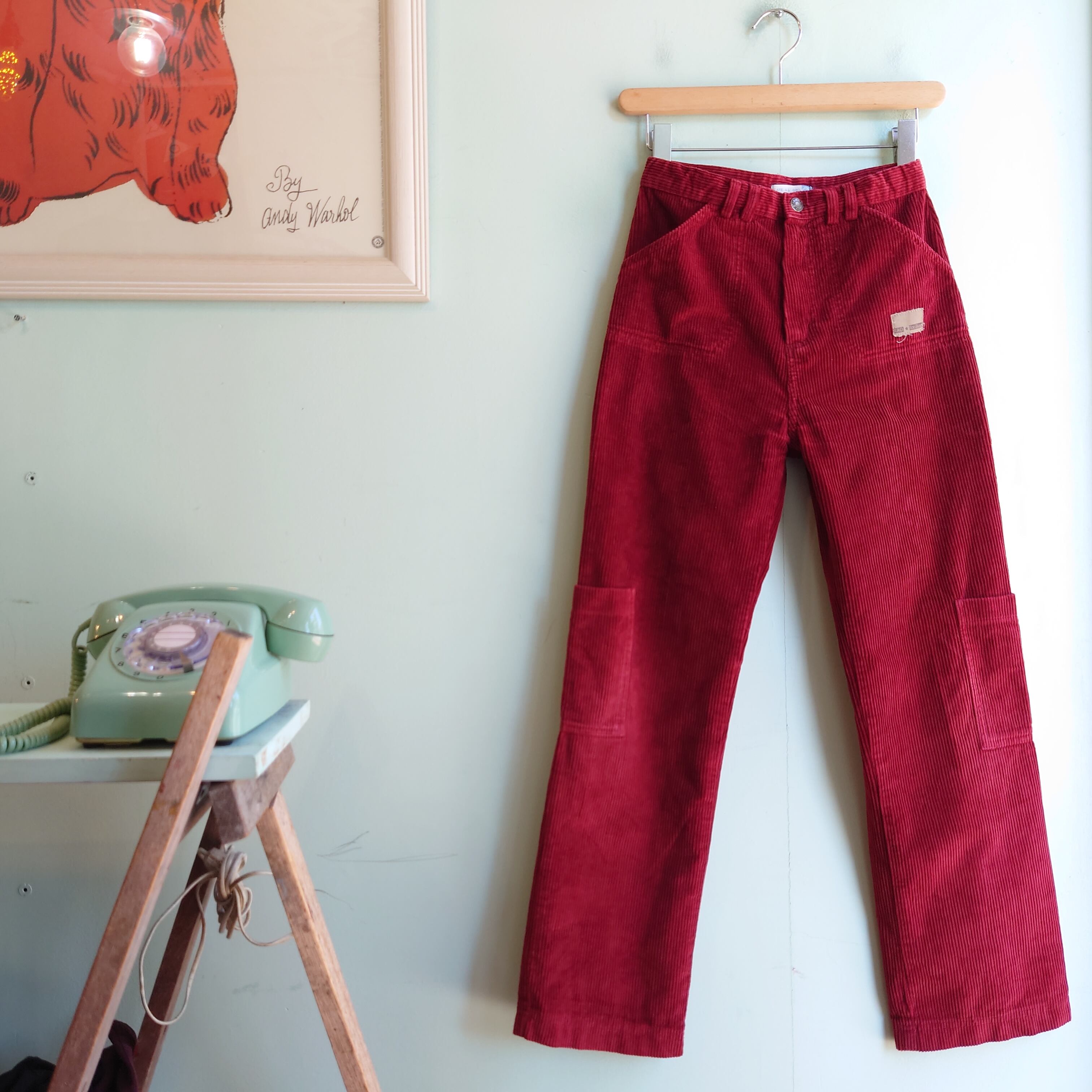 ★カーペンターパンツやブッシュパンツをモチーフにしたデザインを取り入れた、ユーロ系レディース古着のコーデュロイパンツ。太畝のベルベット感とレッドのヘルシーさ、変わり種なポケットなどポジティブな雰囲気がかわいい一本。ウエスト内部には調整可能なゴム付きで、ベルト無しで絞ることも可能。