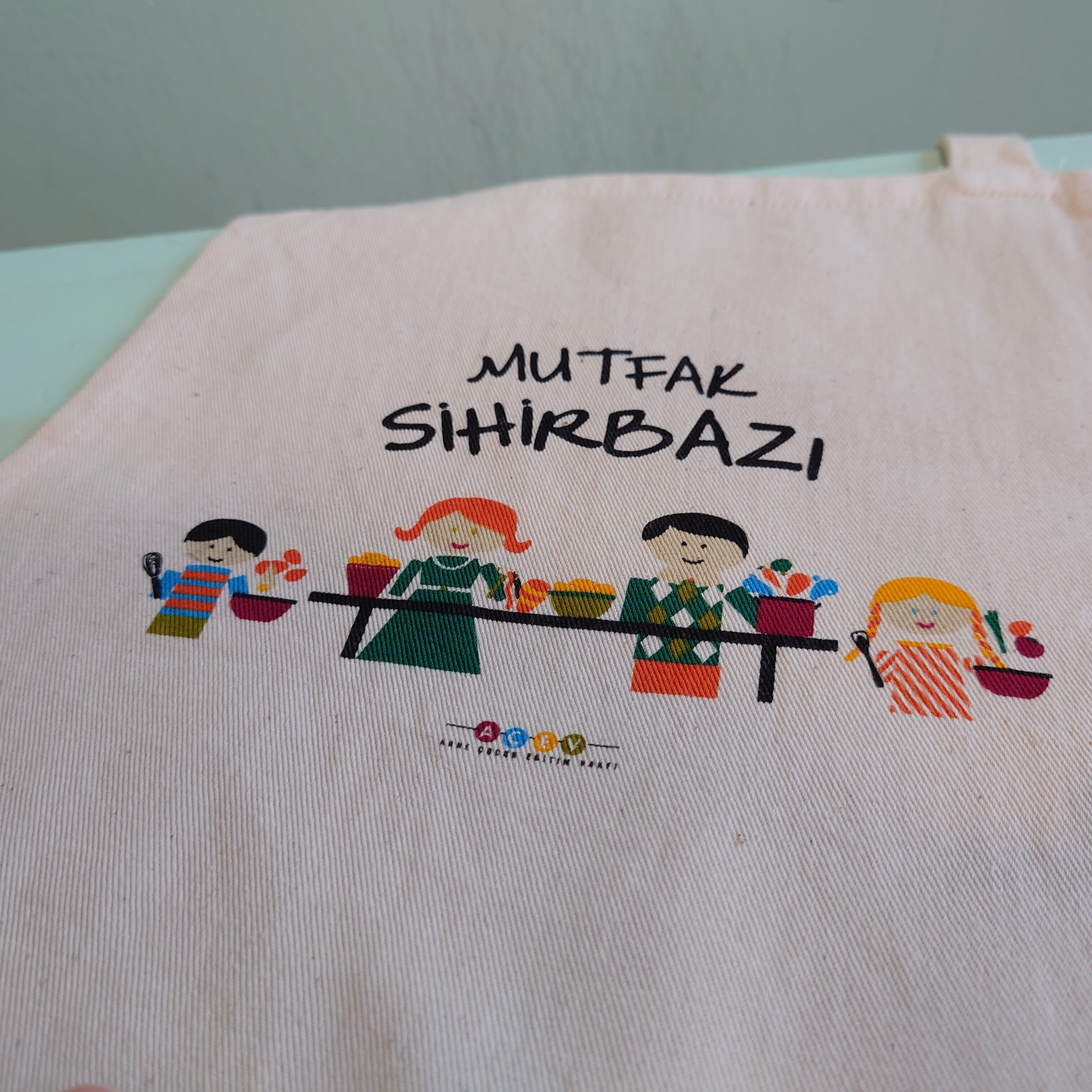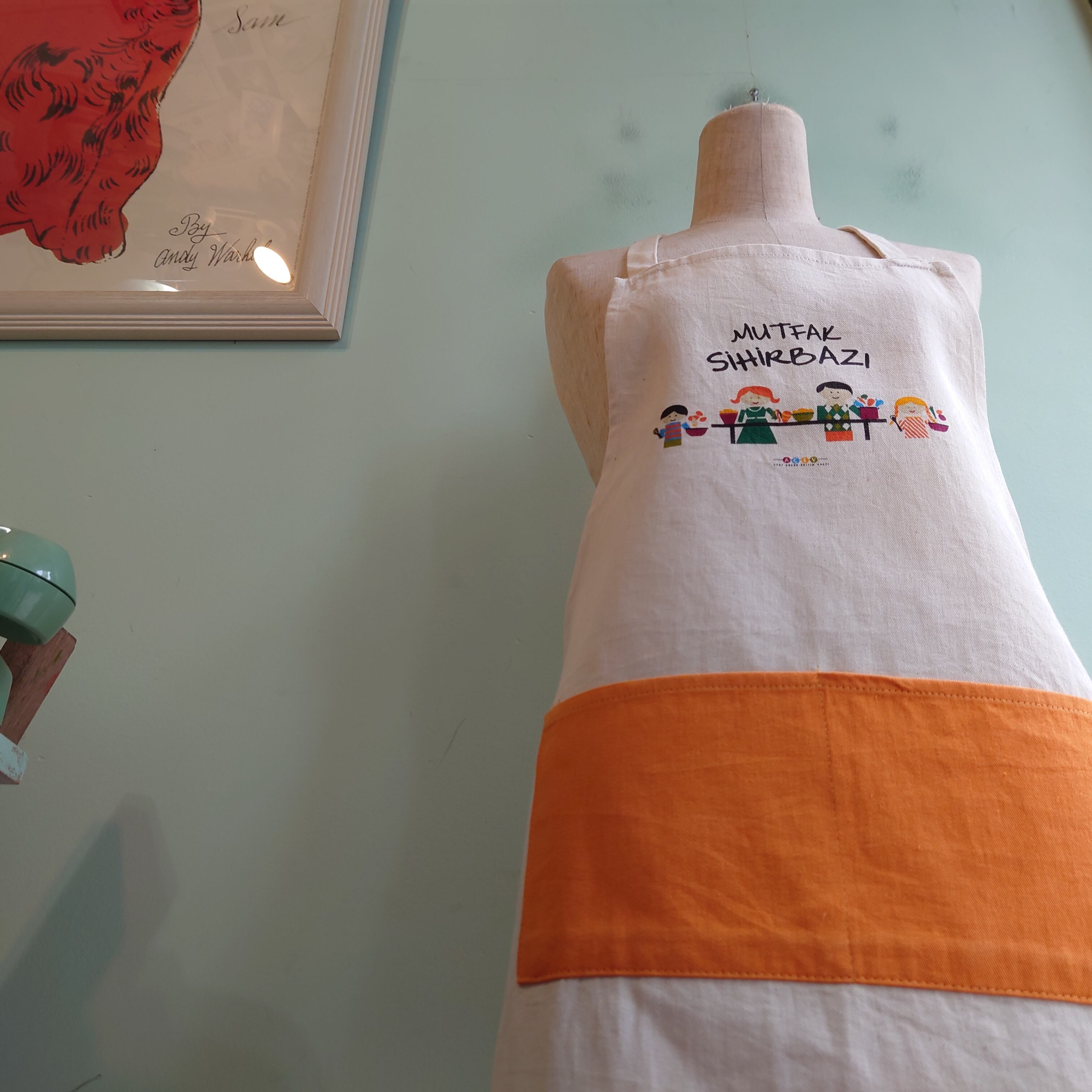 ★トルコに実在する慈善団体のアドバタイジングエプロン。家族の食卓をテーマにしたハートウォーミングな絵柄がかわいい。ポケットのバイカラーもポップ。小柄な方やキッズにおすすめなサイズ感です。