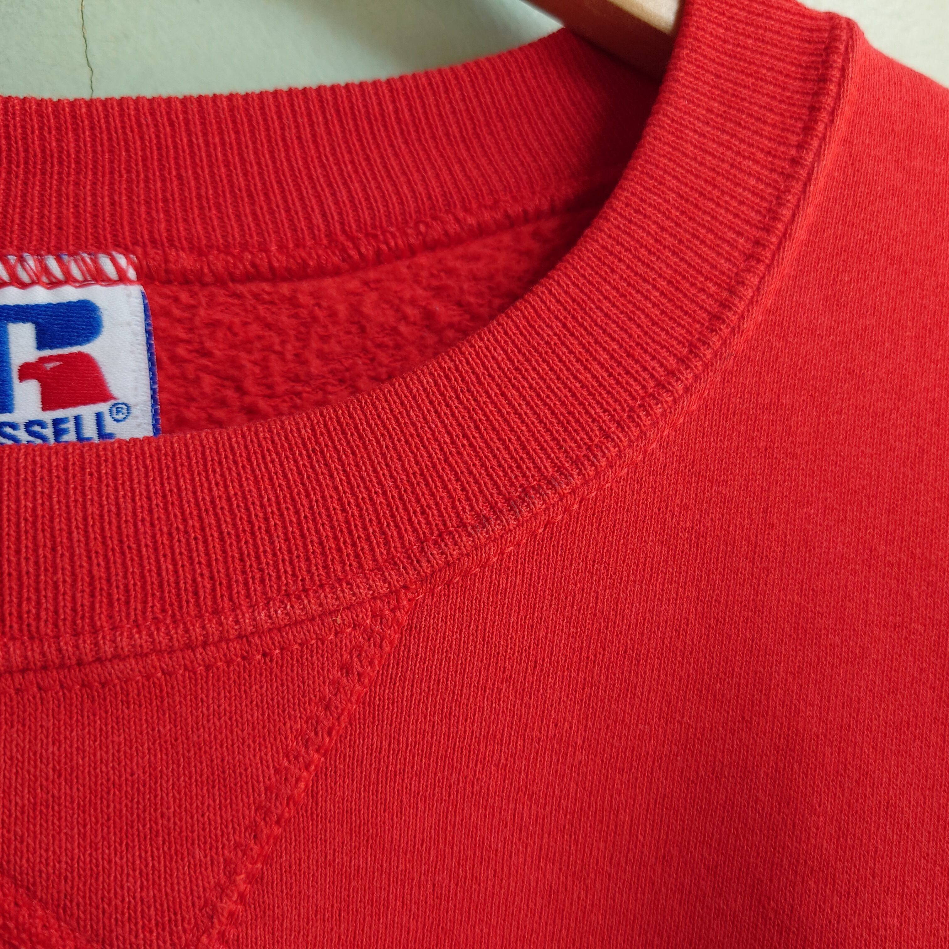 ★コロンとワイドなシルエットと、ガゼット、レトロな素材感がかっこいいRussellの無地スウェット。赤みも古着らしくカラフルかつ深みのあるもの。USA製。