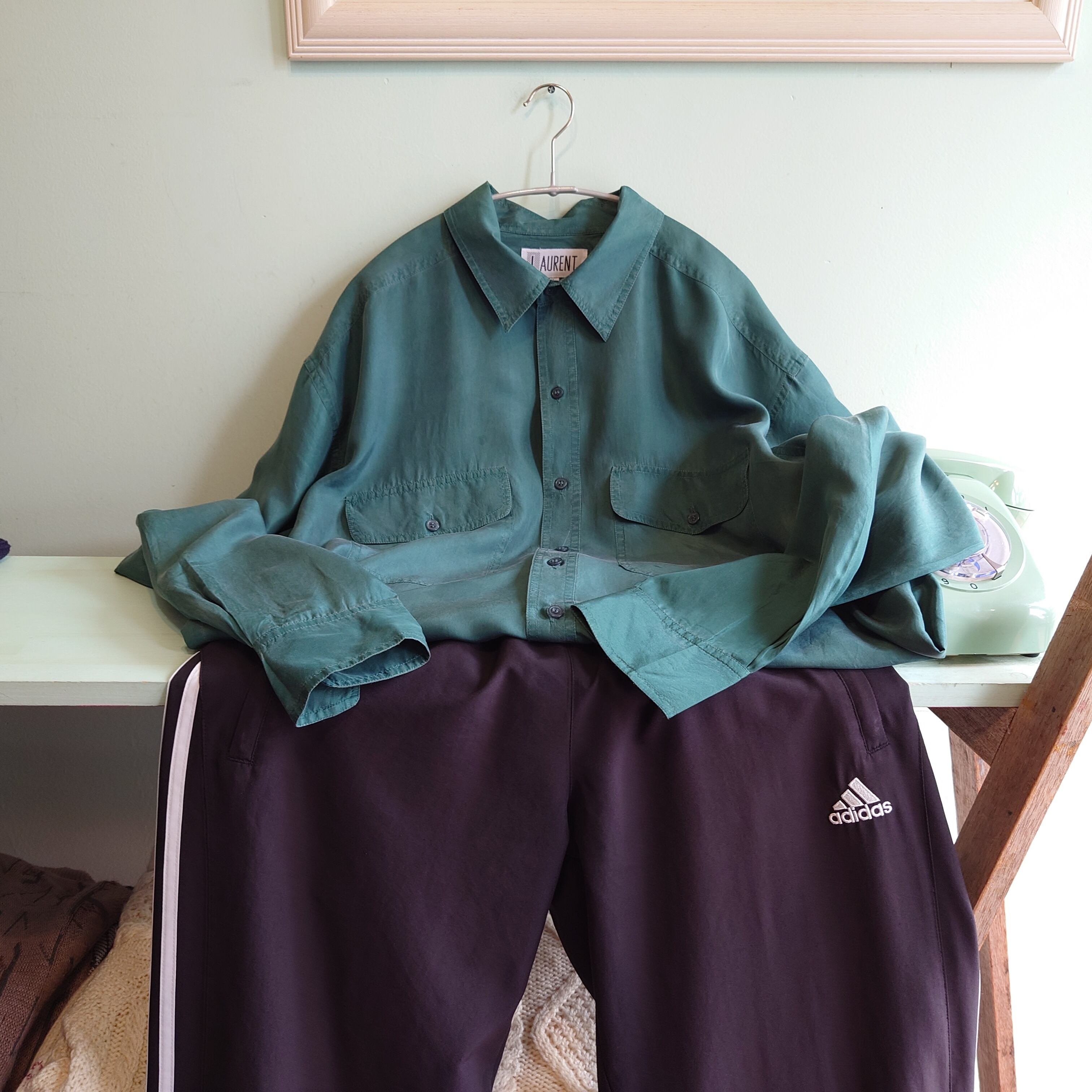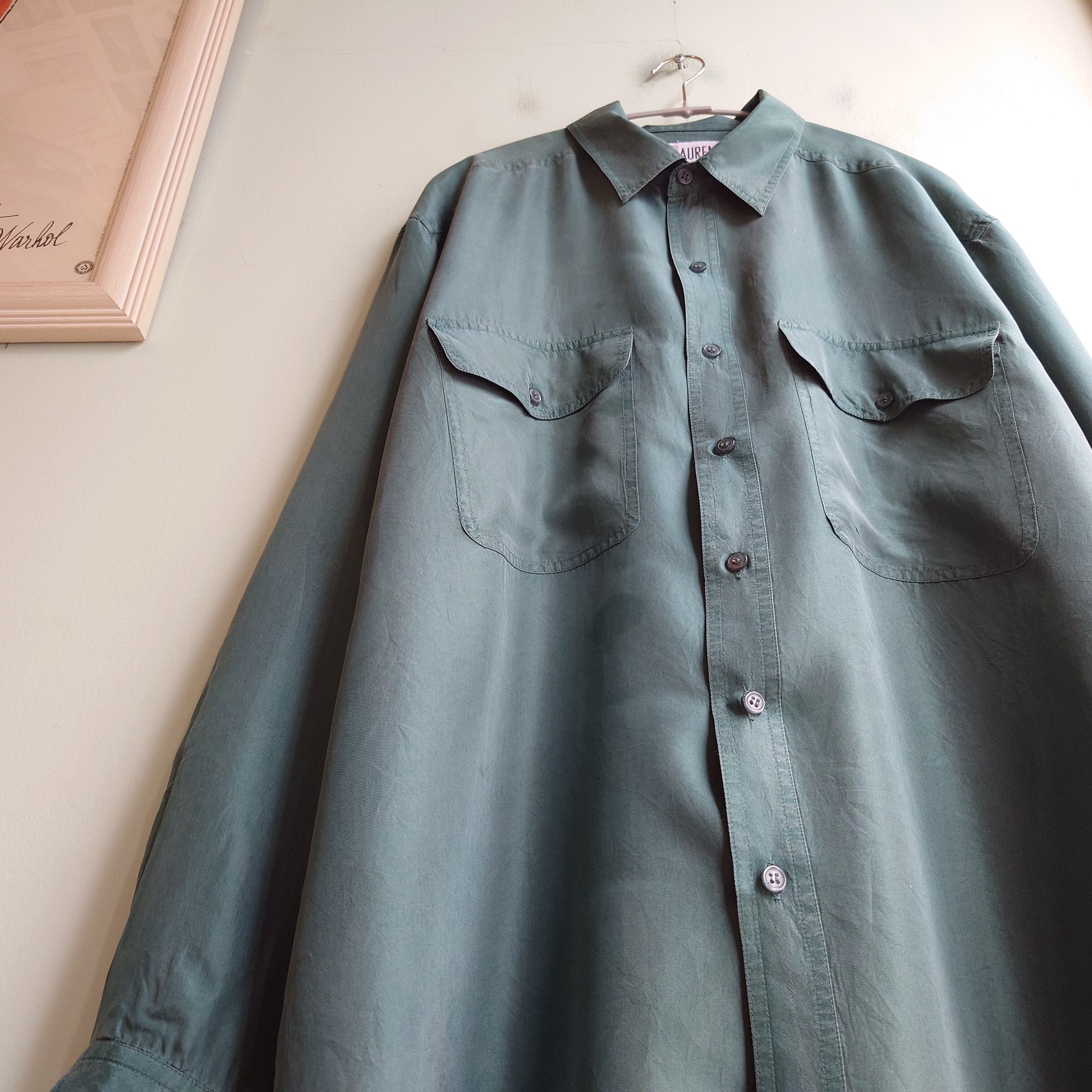LAURENT ユーロ系 80-90s シルクシャツ ドレスシャツ ダークグリーン М大きめ