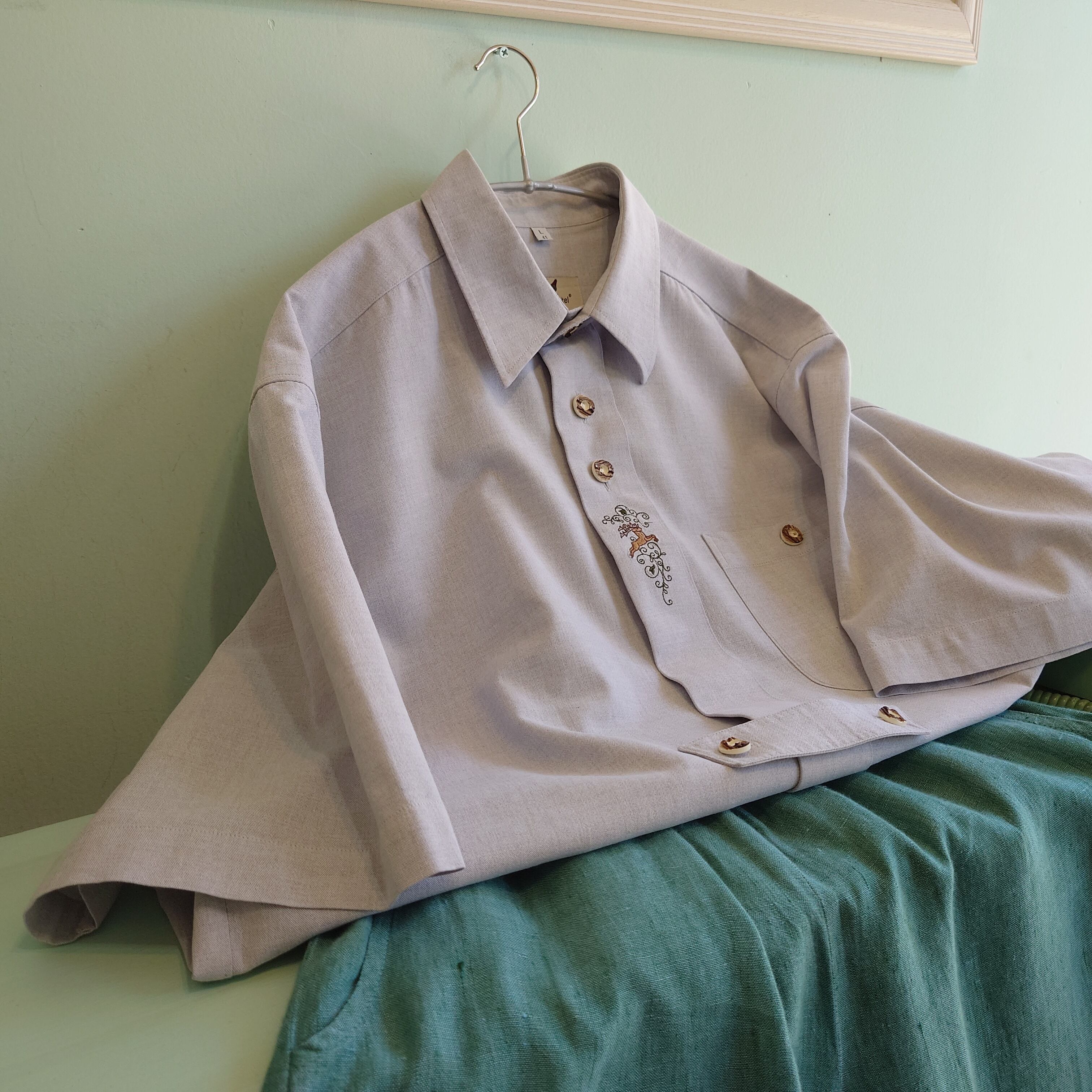 ★ほんのりグレーがかった色味と、ヘラジカをモチーフにしたボタニカル系刺繍が美しいチロリアンシャツ。ウッドボタンの立体感も◎。ものとしてのアート感、存在感が素晴らしい一枚。