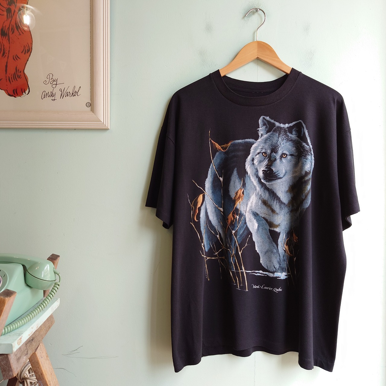 ★1993年コピーライト、カナダ、ケベック州・モンローリエのスーベニアTシャツ。黒に浮かび上がる繊細なタッチのオオカミが美しいアニマルアートいり。