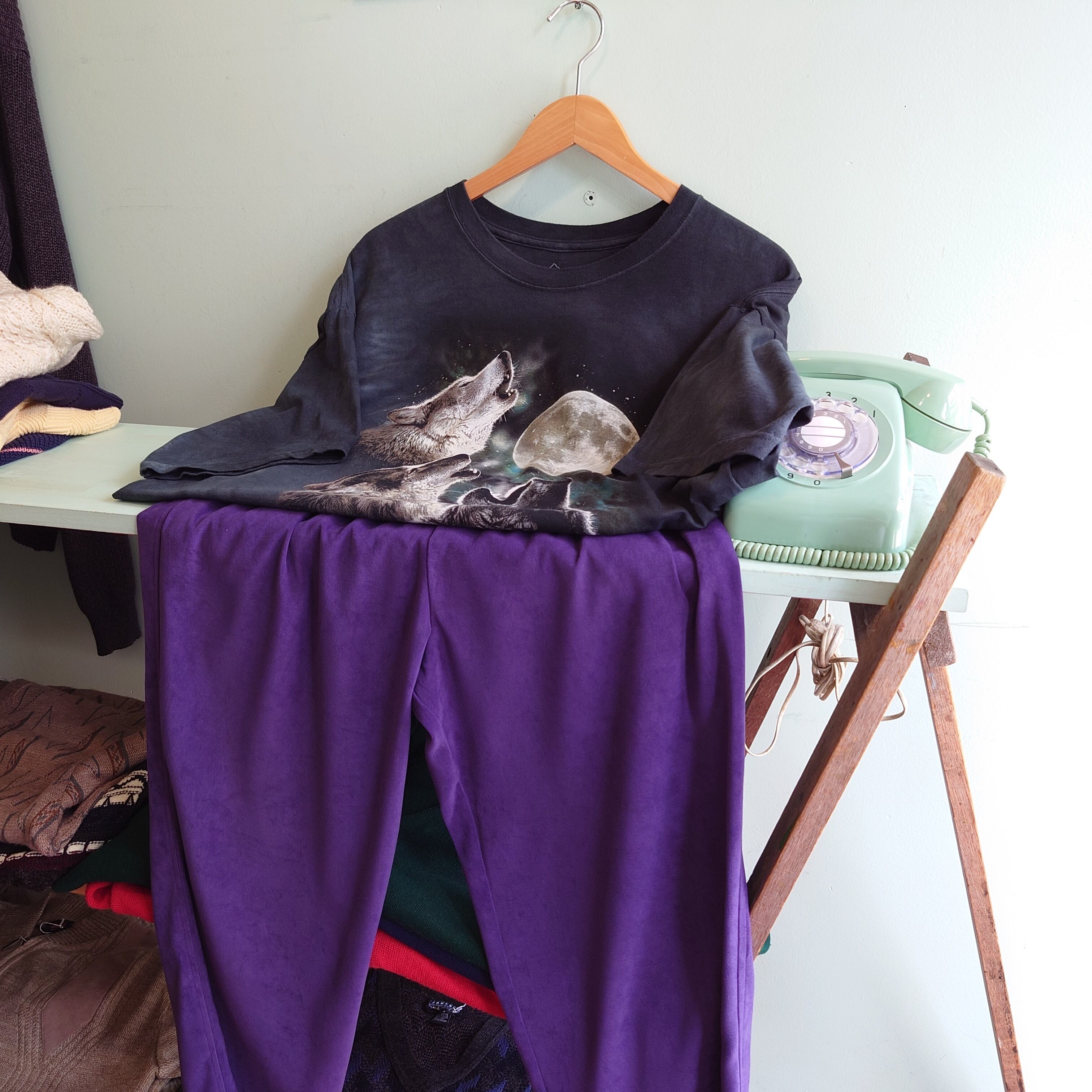 ★月に吠えるオオカミをモチーフにした、the mountain のアニマルTシャツ。オーロラのようにブリーチがかかったネイビー系のタイダイや、次の周りのアトミックな色合いが宇宙的な可愛さ。