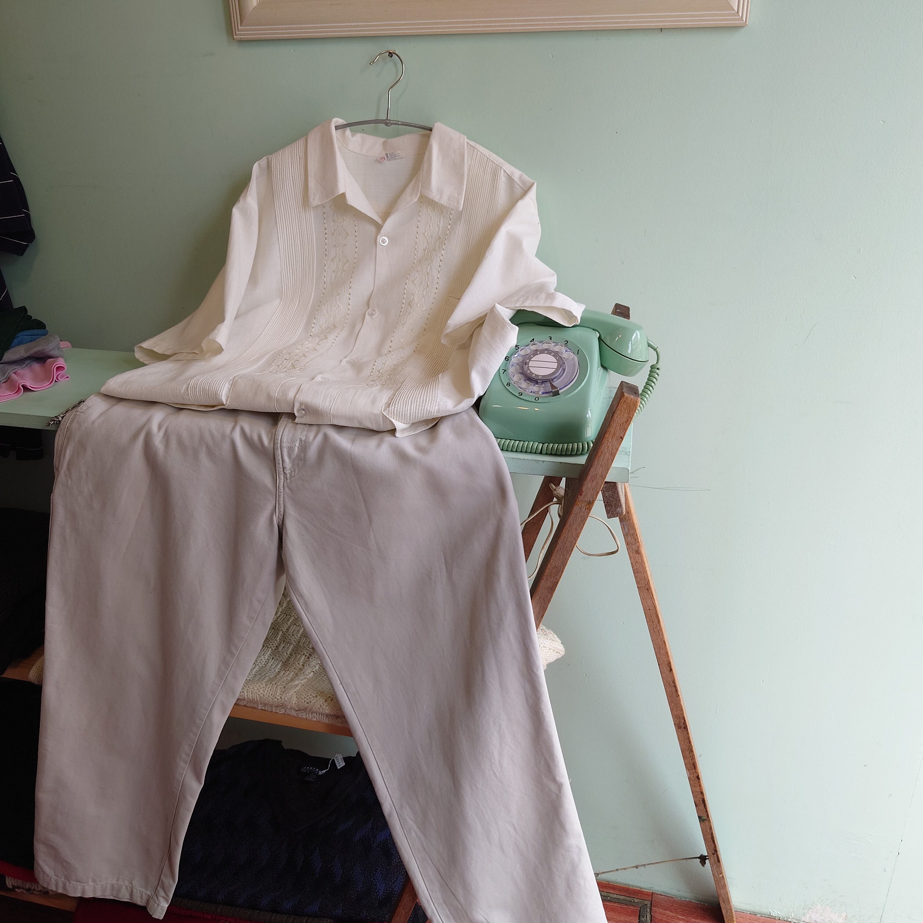 ★クラシックな刺繍の美しさと、ペン差しのフラップポケットがかっこいいヴィンテージグアヤベラシャツ。白系ならではの抜けるような爽やかさが心地よい一枚。