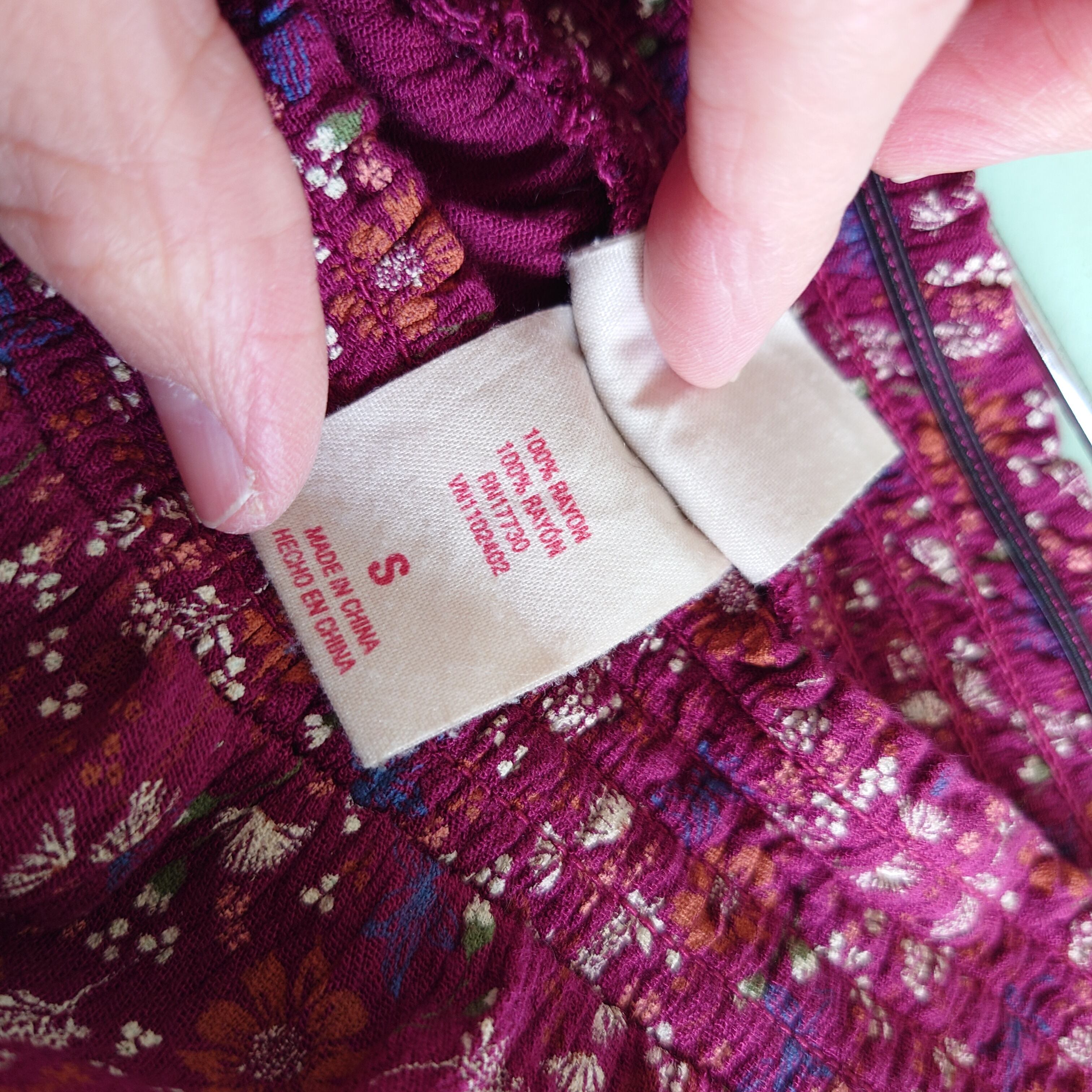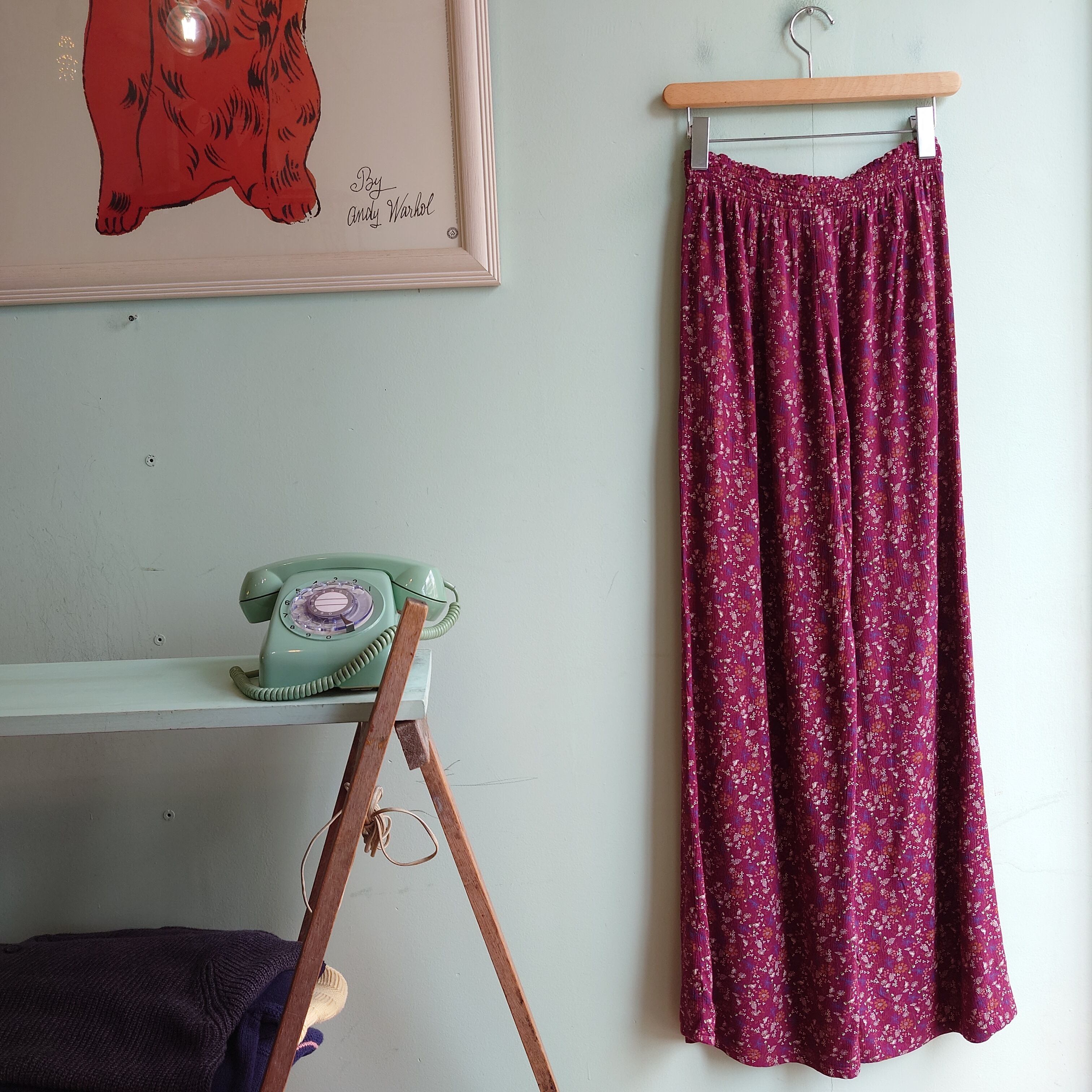 ★サラッと薄手素材のひらひら感と、ワイドにサラッと流れるようなシルエットがかわいいレディース系のイージー。ミニマムな花柄と絞り系素材がボルドーにマッチしたユニセックスな雰囲気。あえてメンズのチョイスにも。