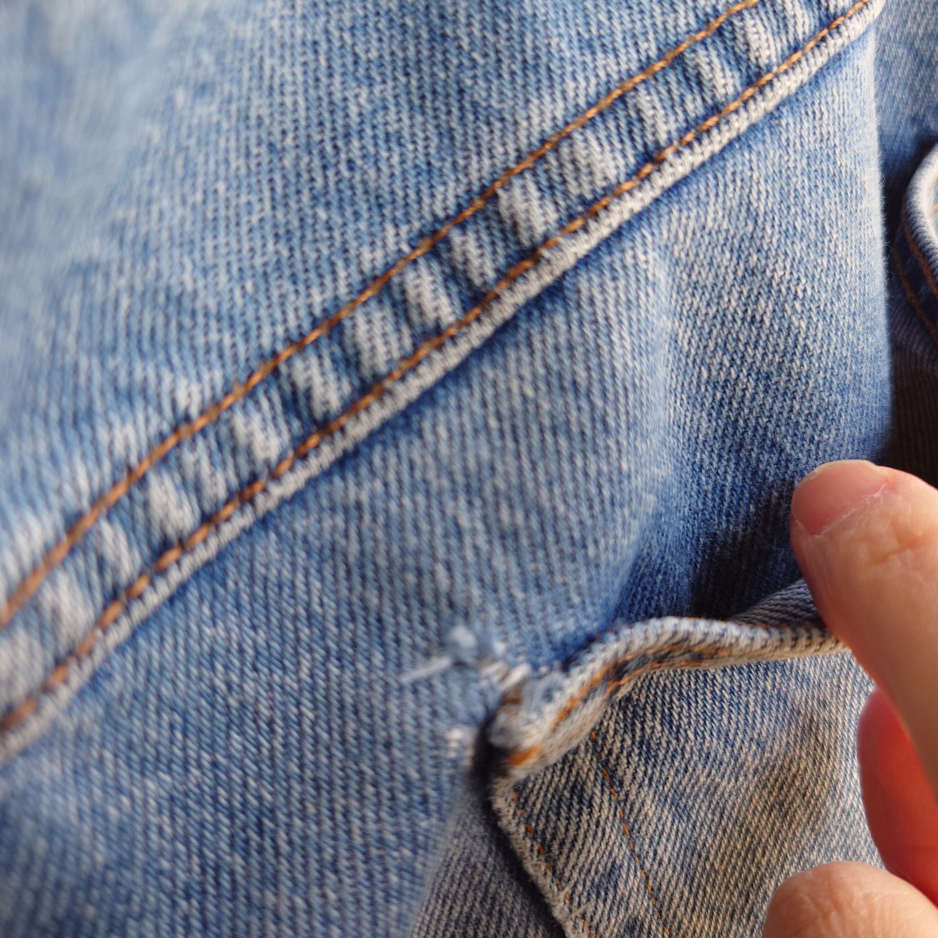 ジップ下、ボタンホール、バックポケット、ベルトループ付近に軽微なダメージあり