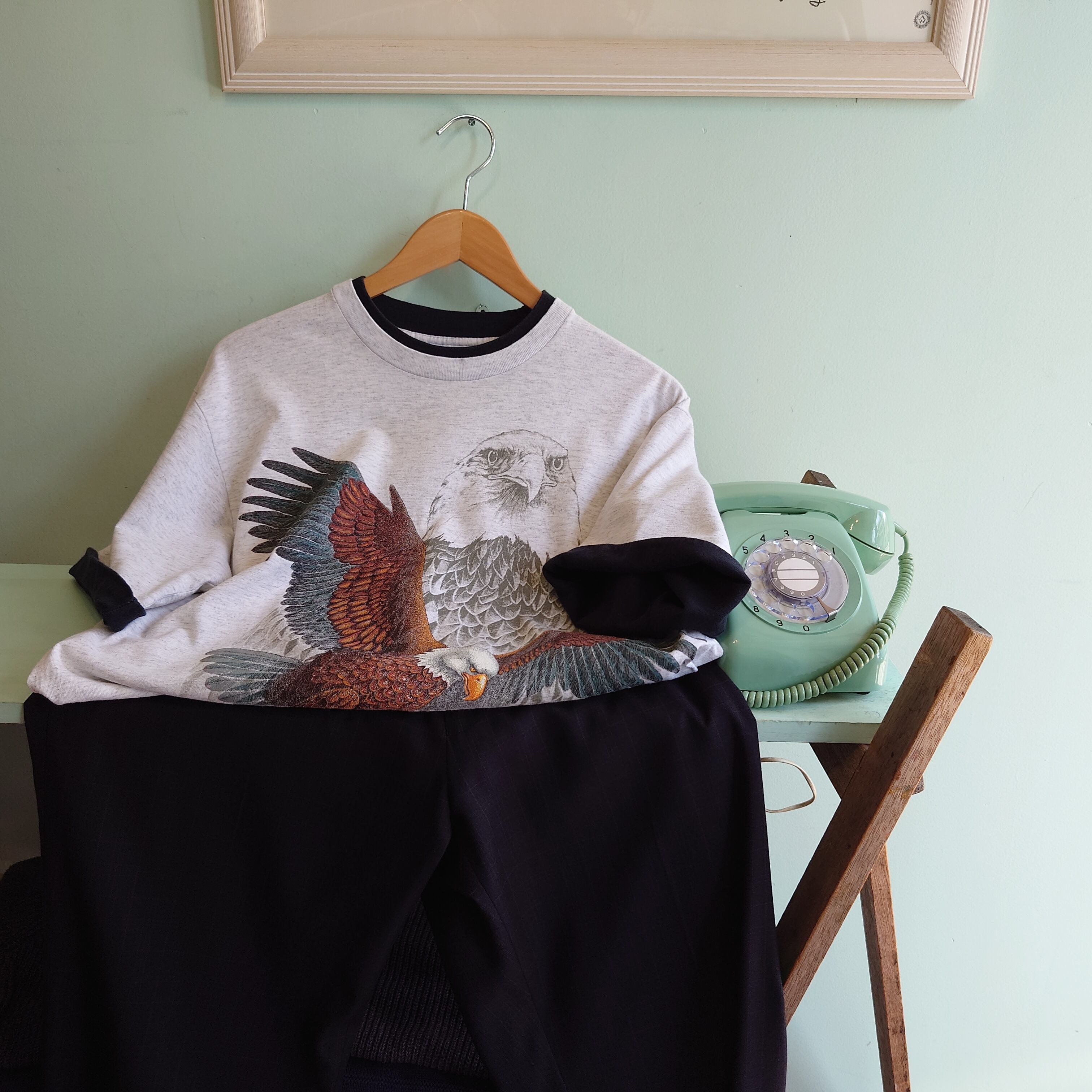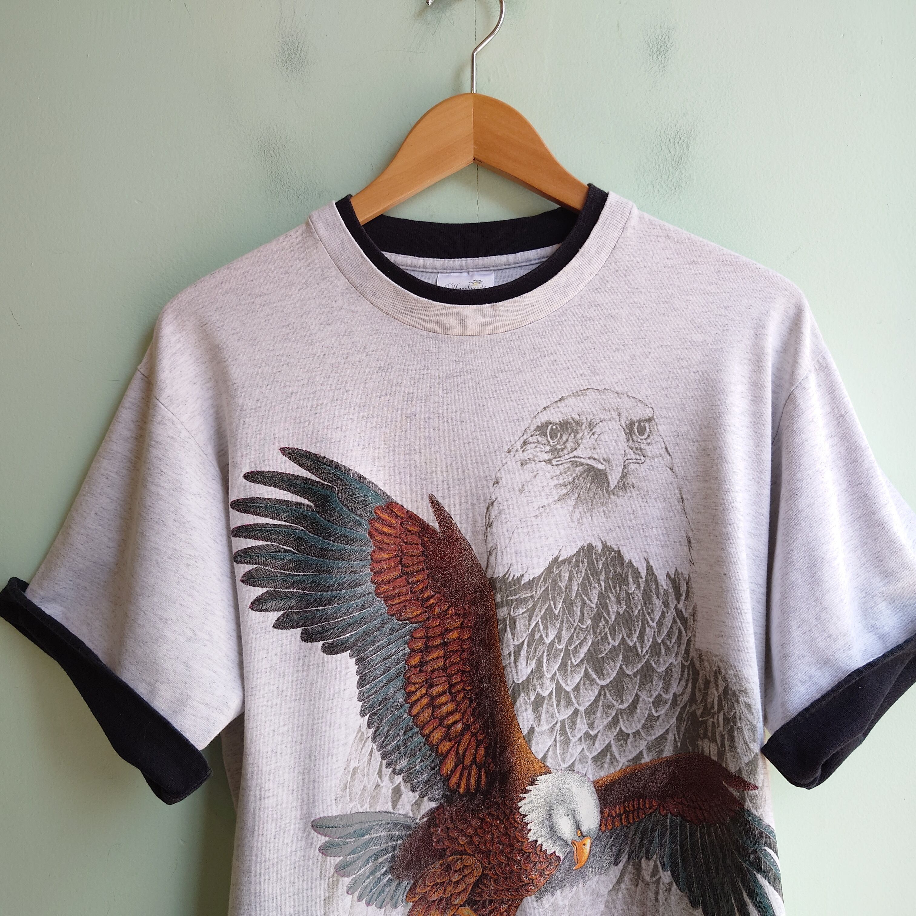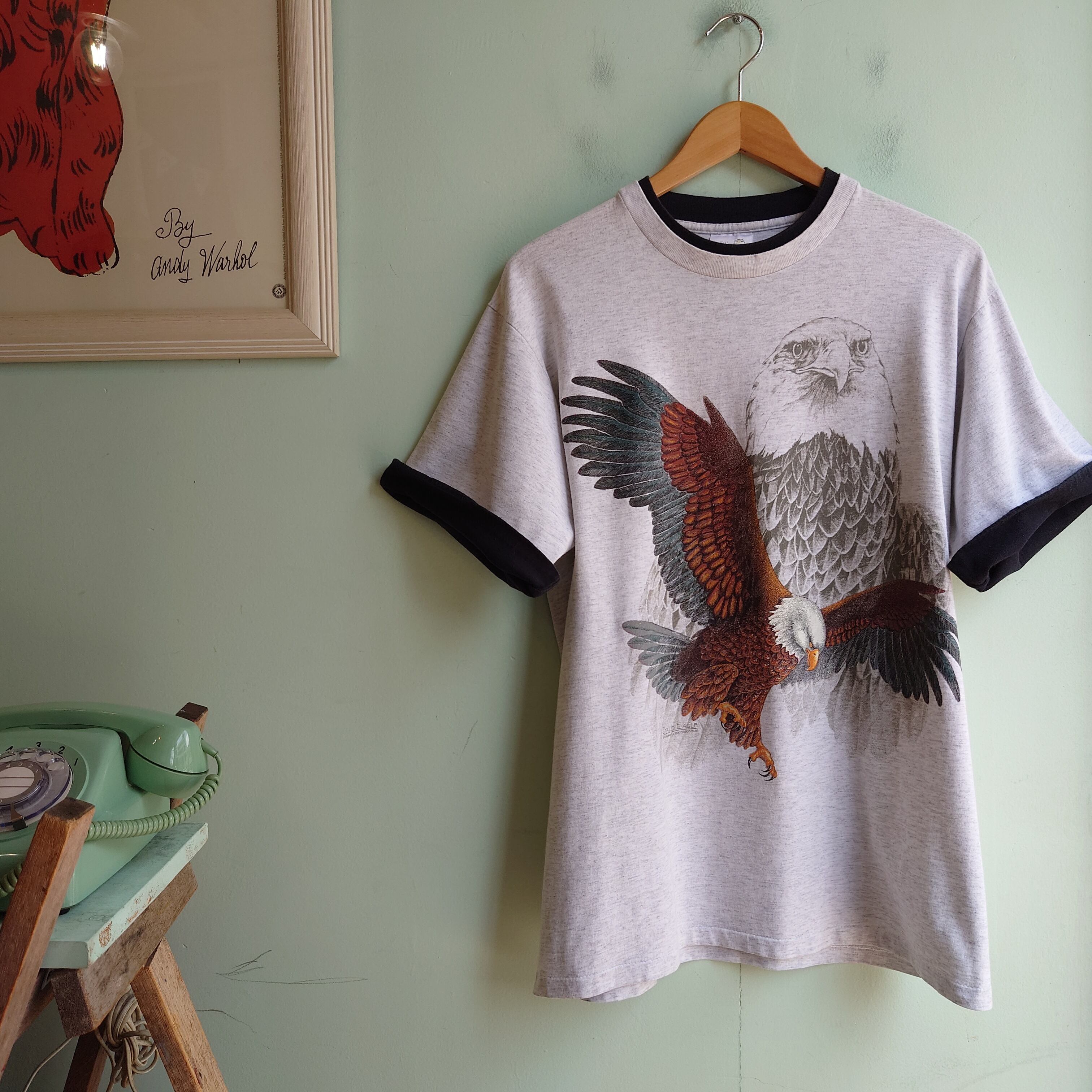 ★合衆国の鳥『ハクトウワシ』をモチーフにしたUSAらしいアニマルTシャツ。色の濃淡や繊細なタッチが素晴らしい。襟はリンガーのうち襟付き、袖には裏地付きで折り返しもかわいい。