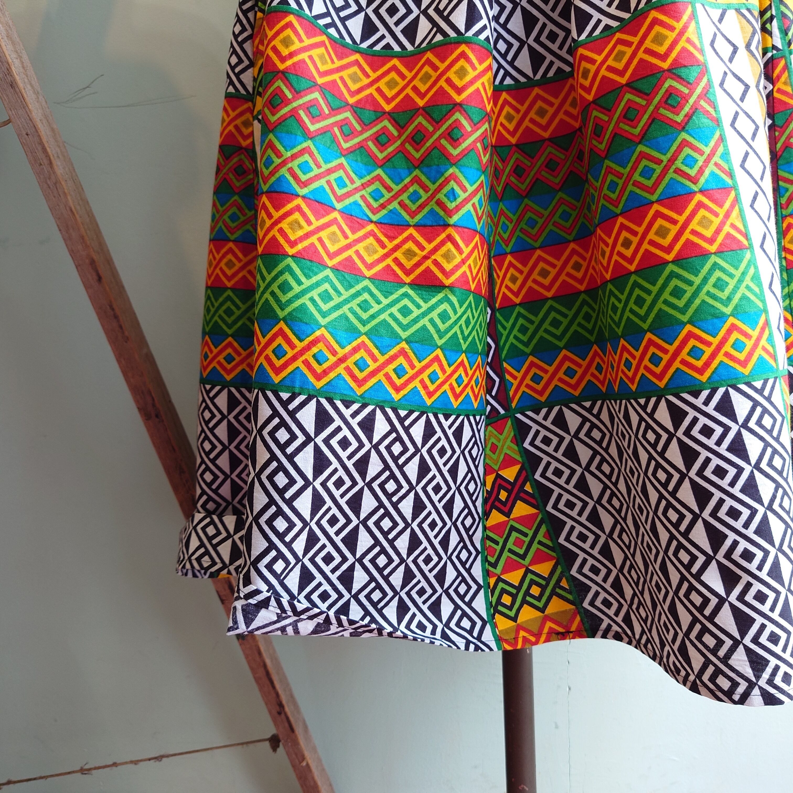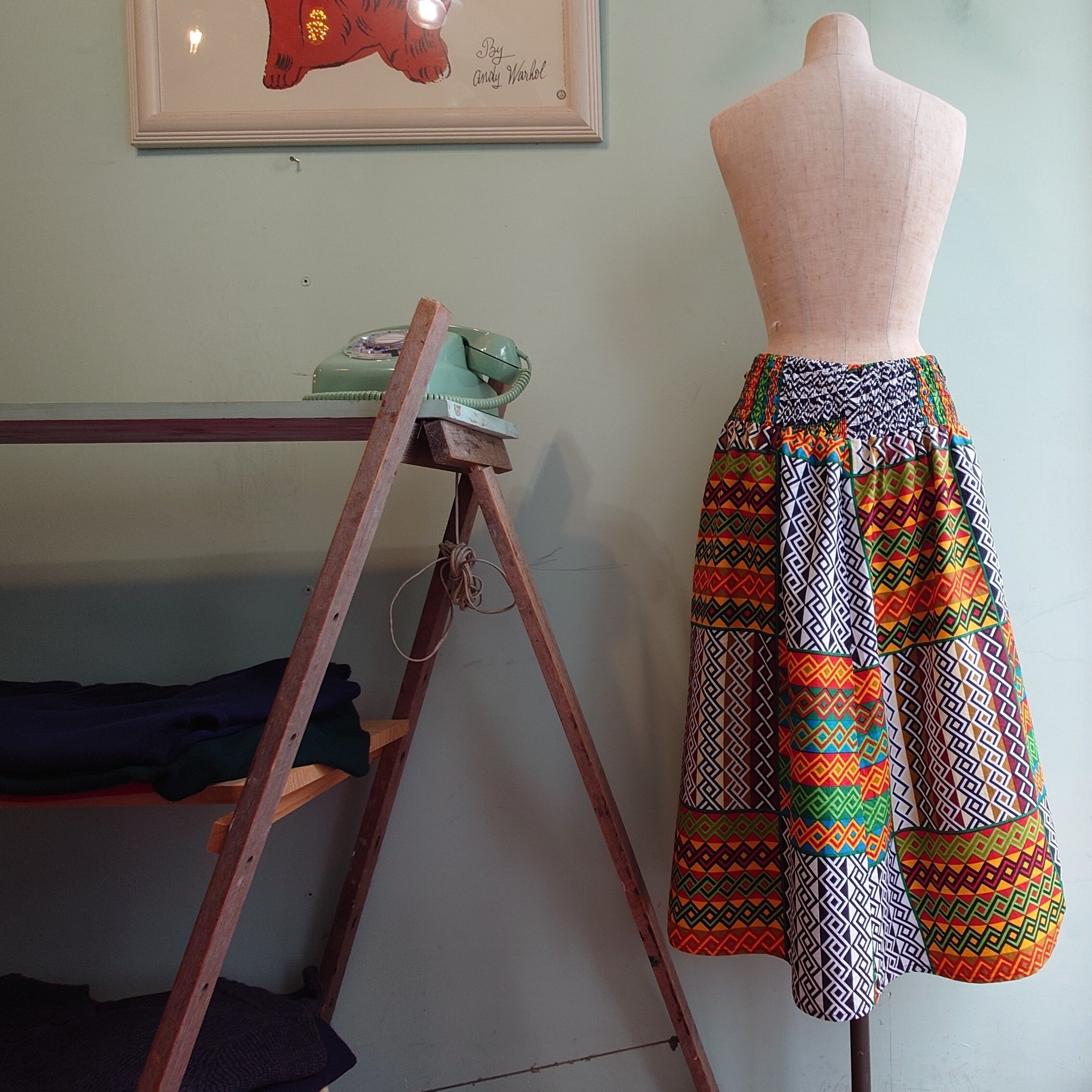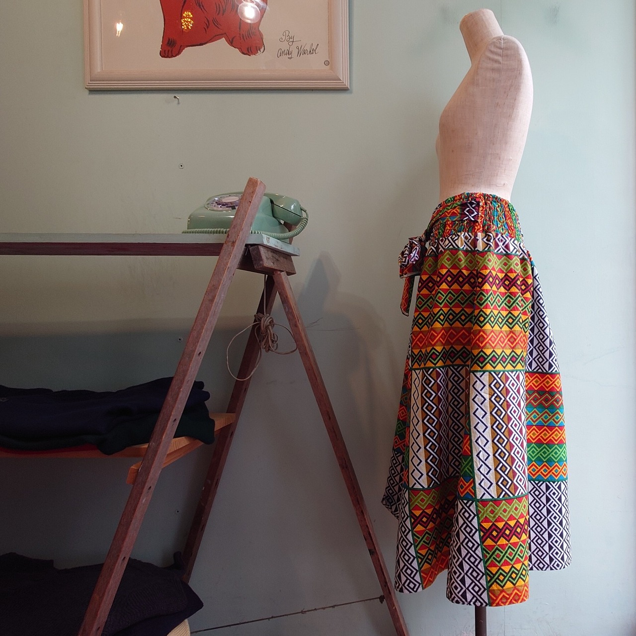 ★アメリカンネイティブ柄とメキシカンバティック柄をミックスしたような、鮮烈な色合いが可愛すぎる総柄スカート。ウエストには大きなリボン付きで、バティックスタイルにガーリーな魅力をプラスできる。