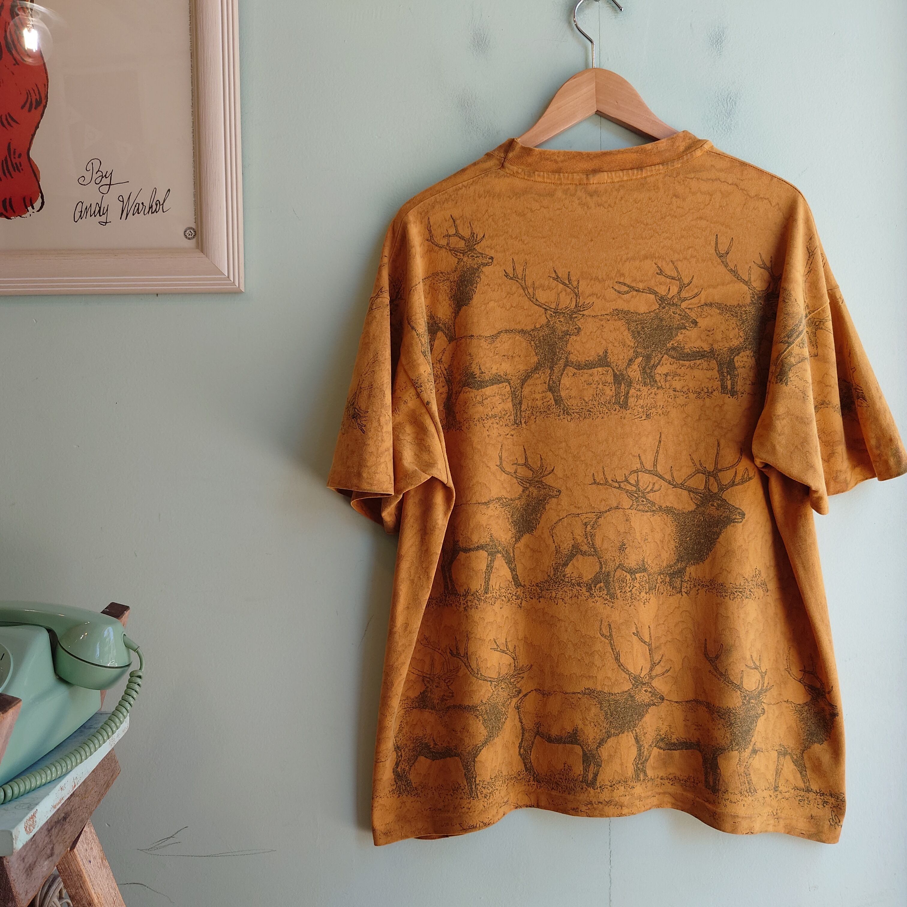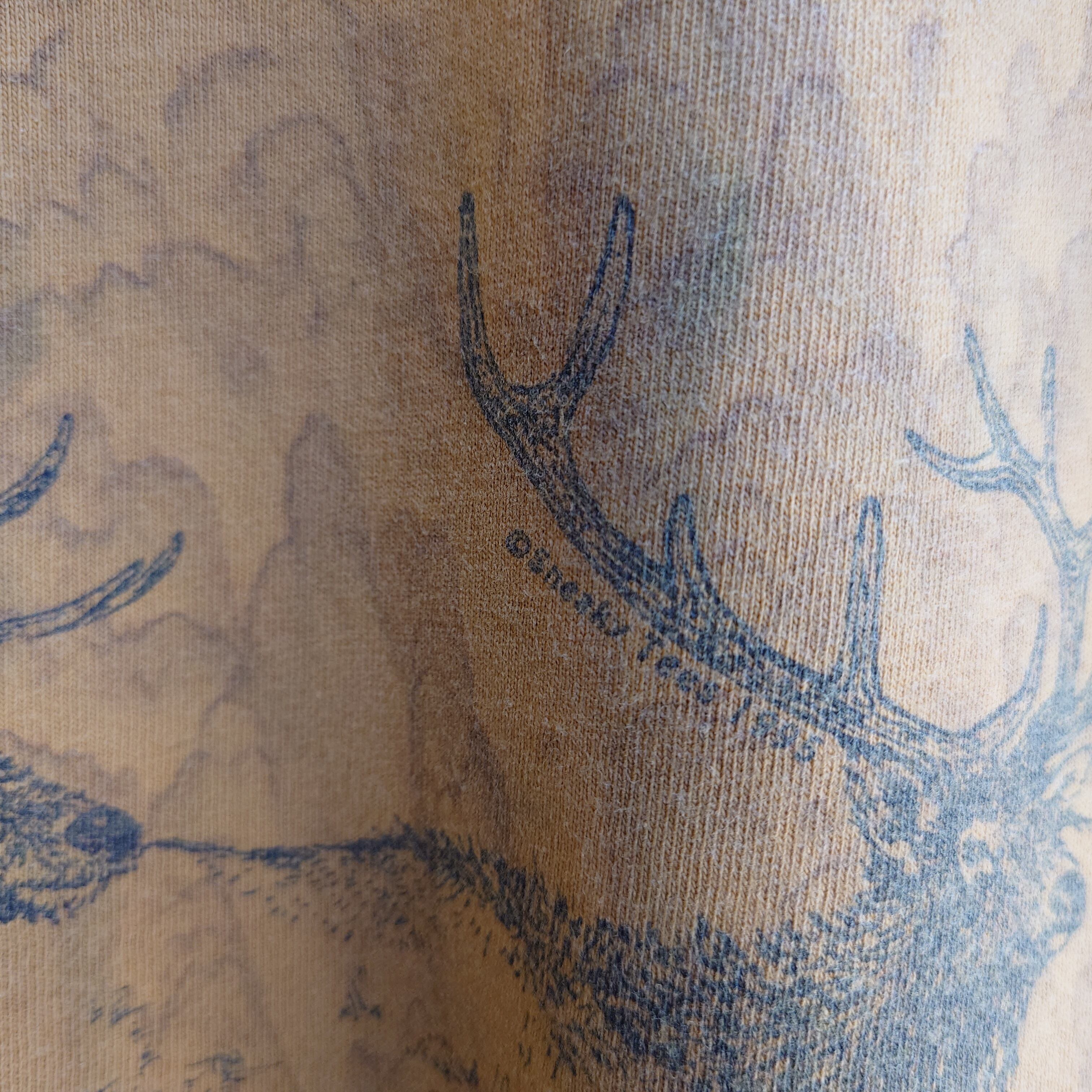★ニューメキシコ州シパプのヴィンテージスーベニアTシャツ。タイダイ染めとは一味違うマーブル色に、ヘラジカをモチーフにしたアートライクなアニマルアイテム。総柄でもアーシーなので、ナチュラルな雰囲気もある特別な1枚。