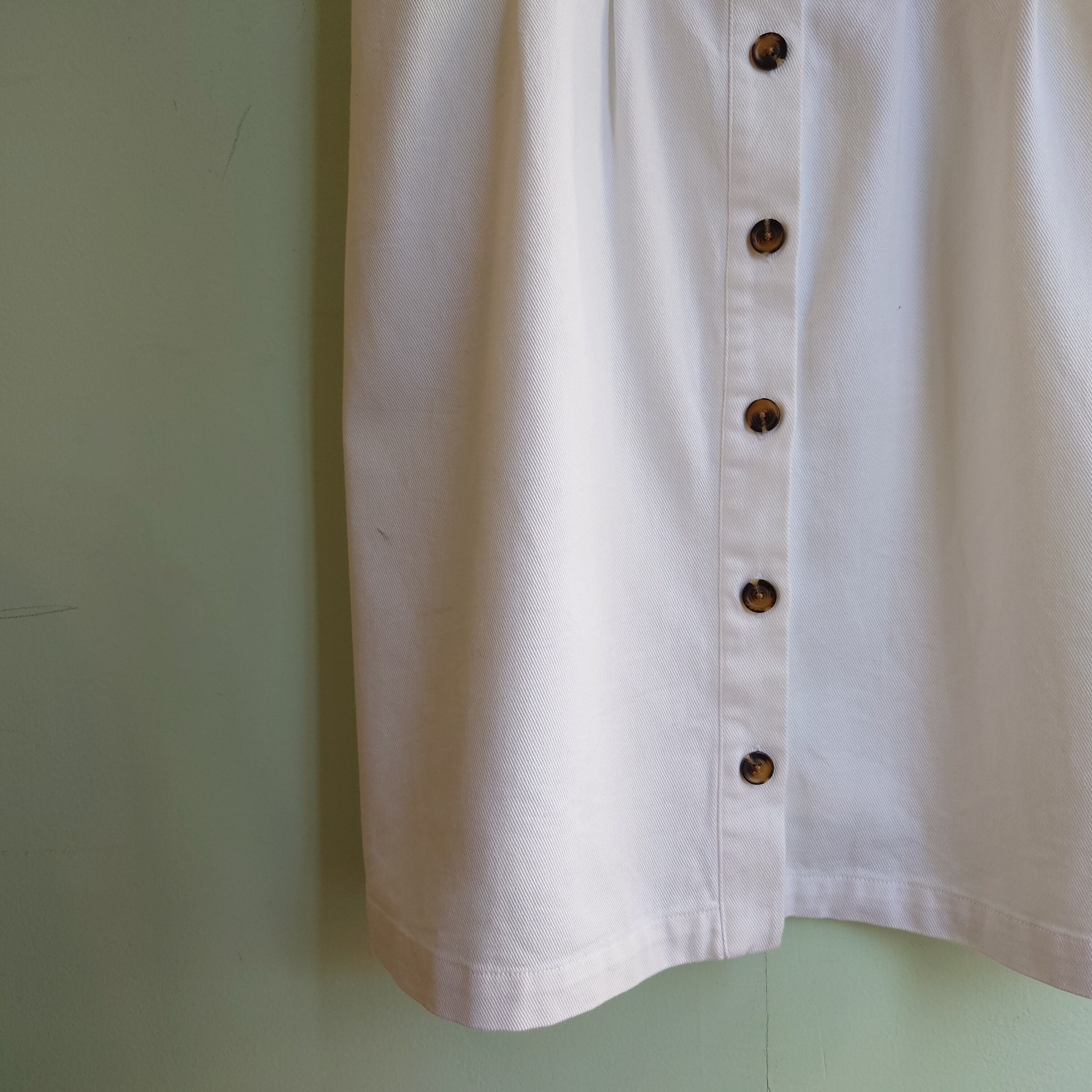 ★スクエアネックにパフスリーブが付いたデザイン系のワンピース。コットンツイル素材のナチュラルな真っ白。ボトムとのレイヤードも◎な半端丈。