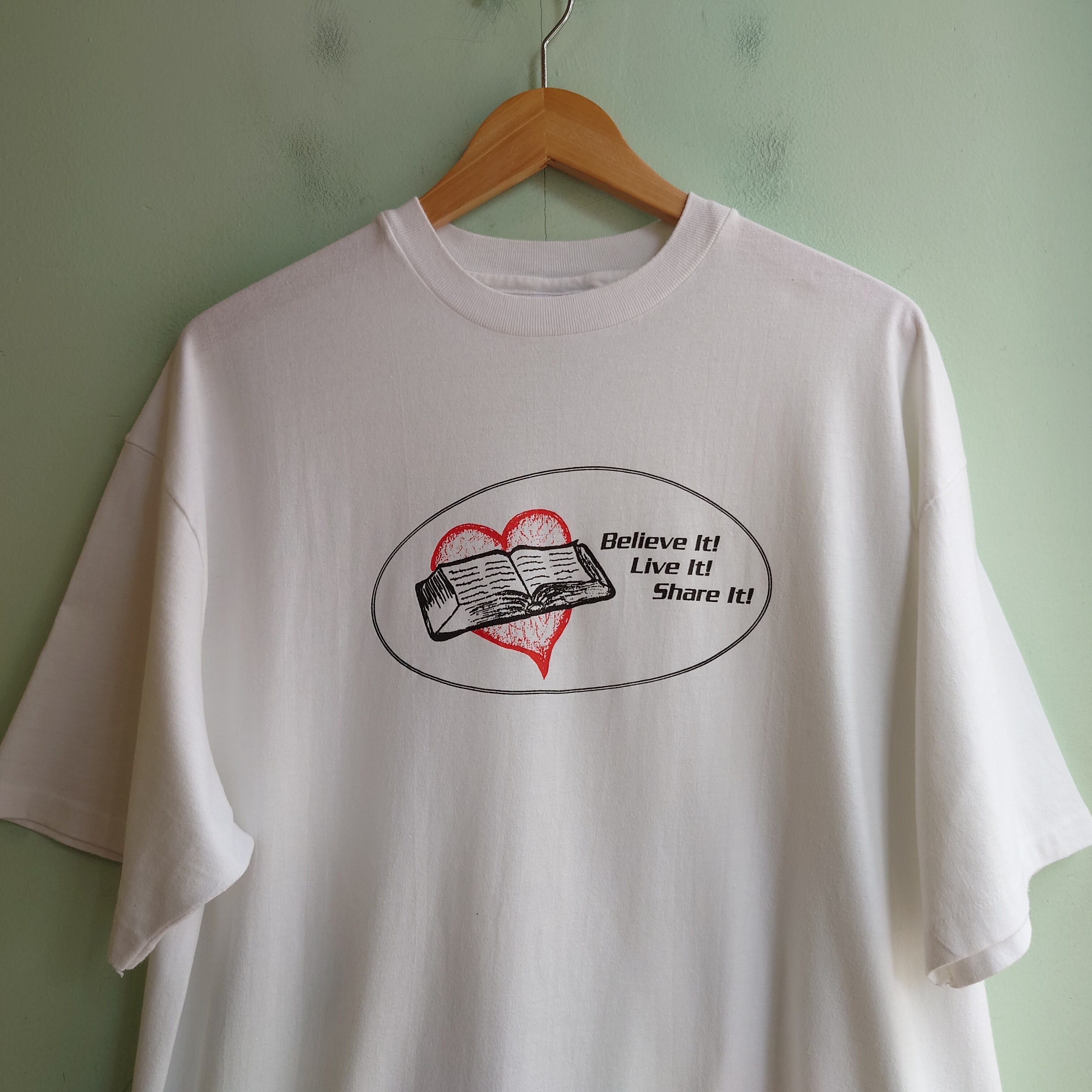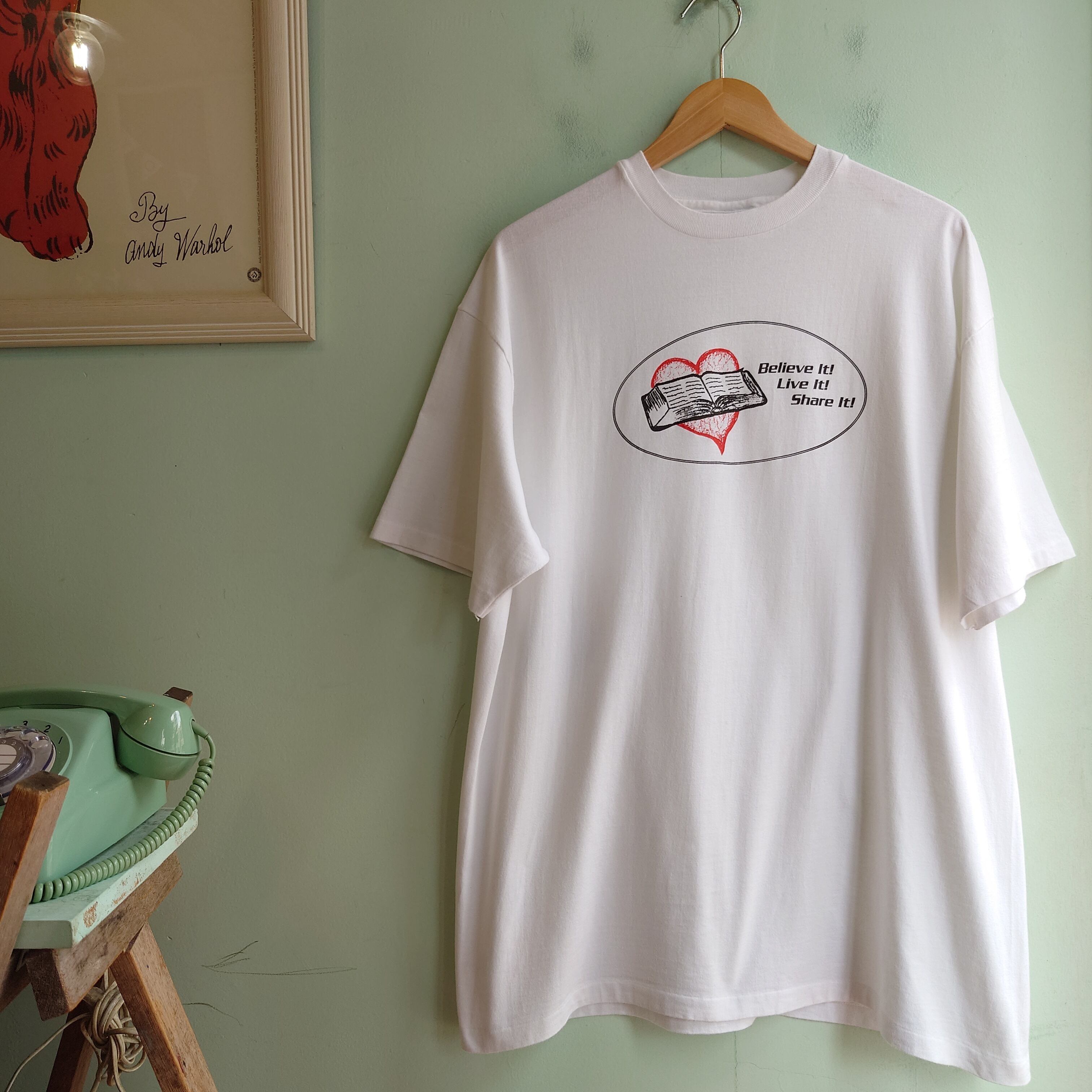 ★『信じ、生き、共有しよう』と本(またはバイブル)に対する熱いメッセージを描いた、グラフィック系のヴィンテージTシャツ。手書きのような線の細さからでも伝わる、本とハートの力強さに惹かれる1枚。