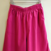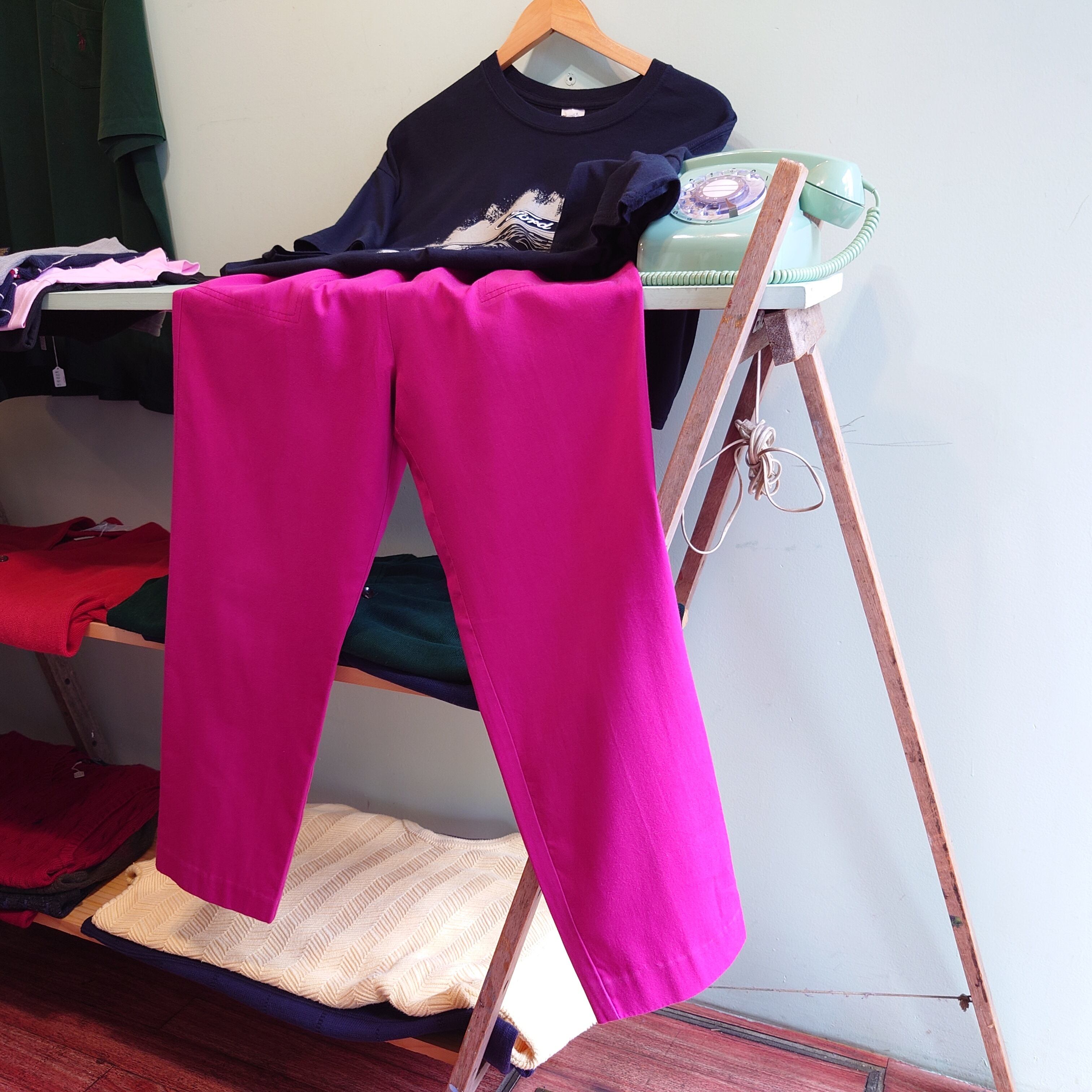 ★レアカラー、マゼンタ色のイージーパンツ。コットン混で光沢控えめ、カジュアル寄りのポップなテーパードパンツです。Tシャツ合わせてヘルシーに、シャツスタイルの外しに、女子はドレスのインナーに、色が欲しい時にばっちり頼りになる一本。