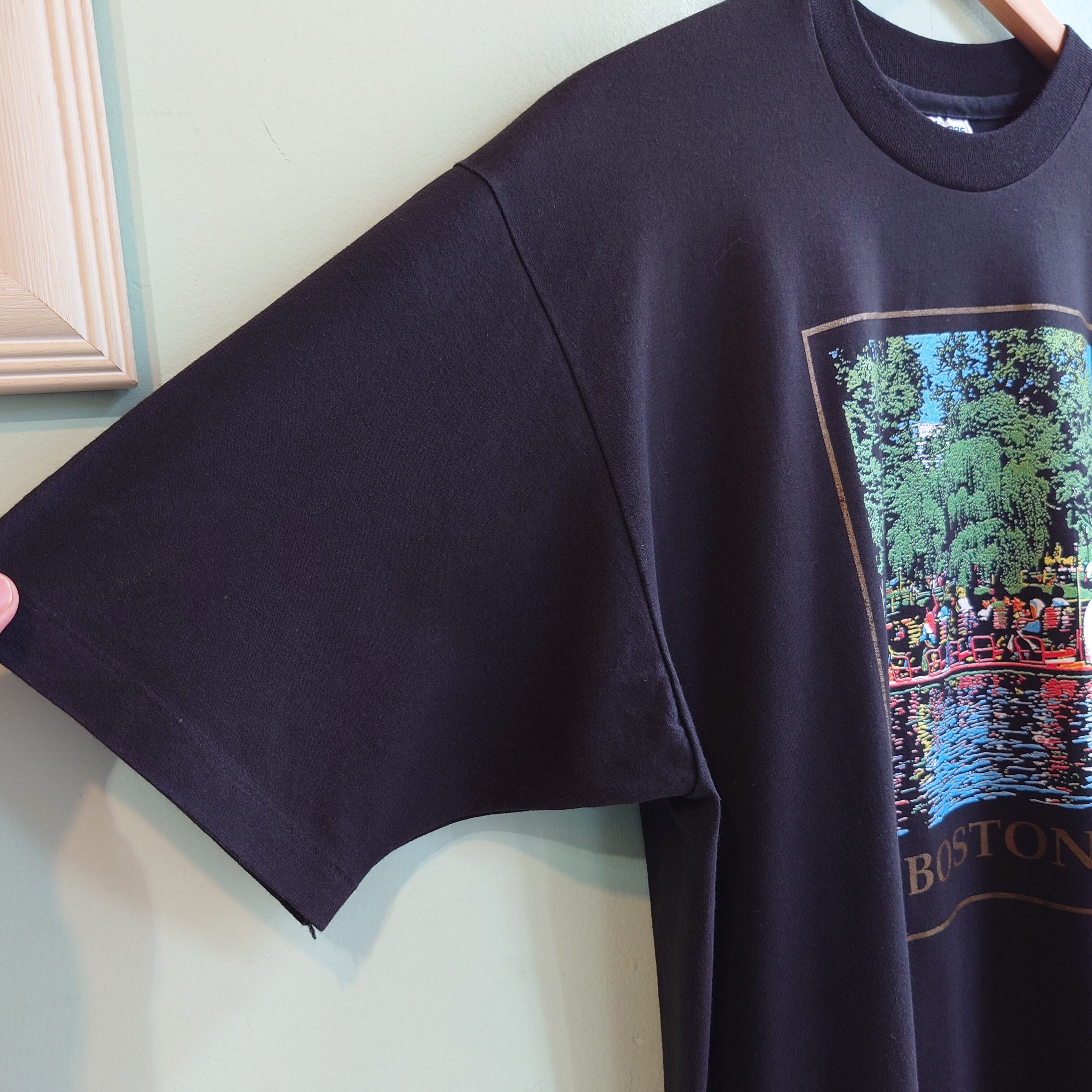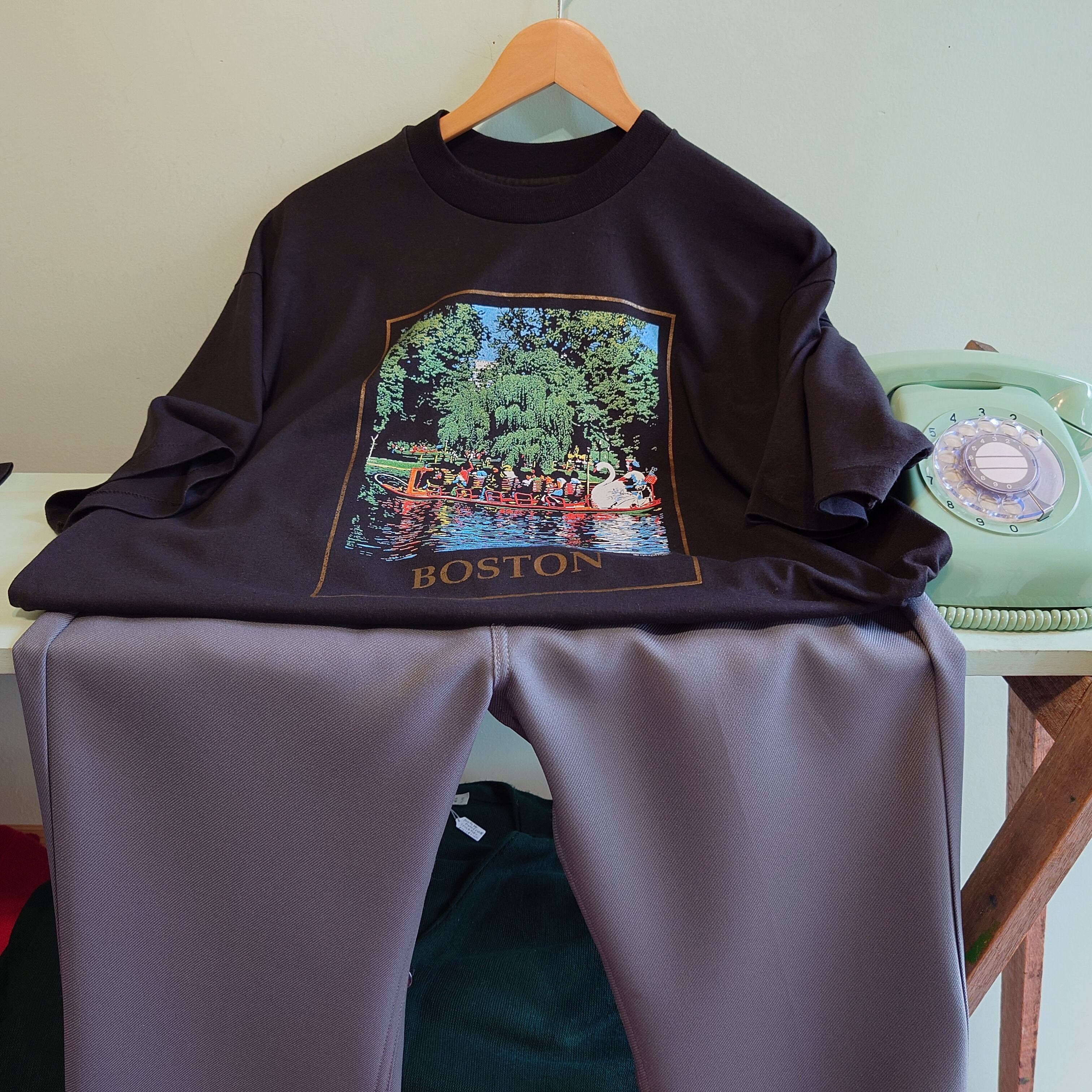 ★マサチューセッツ州ボストン、パブリックガーデンの名物『スワンボート』プリントのヴィンテージTシャツ。黒字にラバー系の凸凹したプリントが油絵のような美しさ。