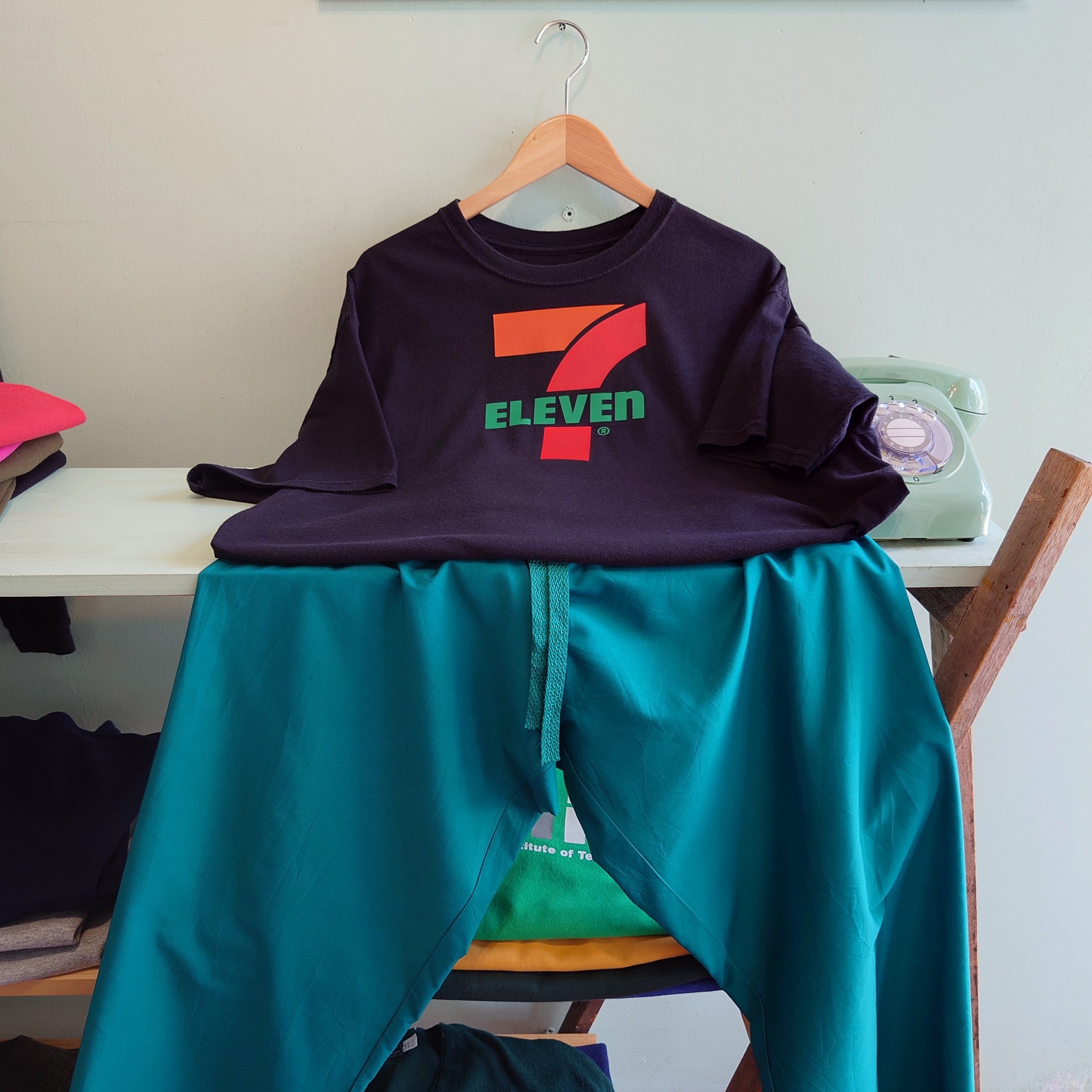 ★米国セブン-イレブンのロゴTシャツ。バッグにはbarthday boyのハッピーなメッセージいり。おなじみのロゴながらスタイリッシュに再構築された、企業系アイテムの面白さあふれる1枚。